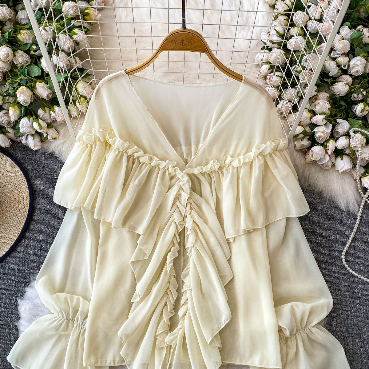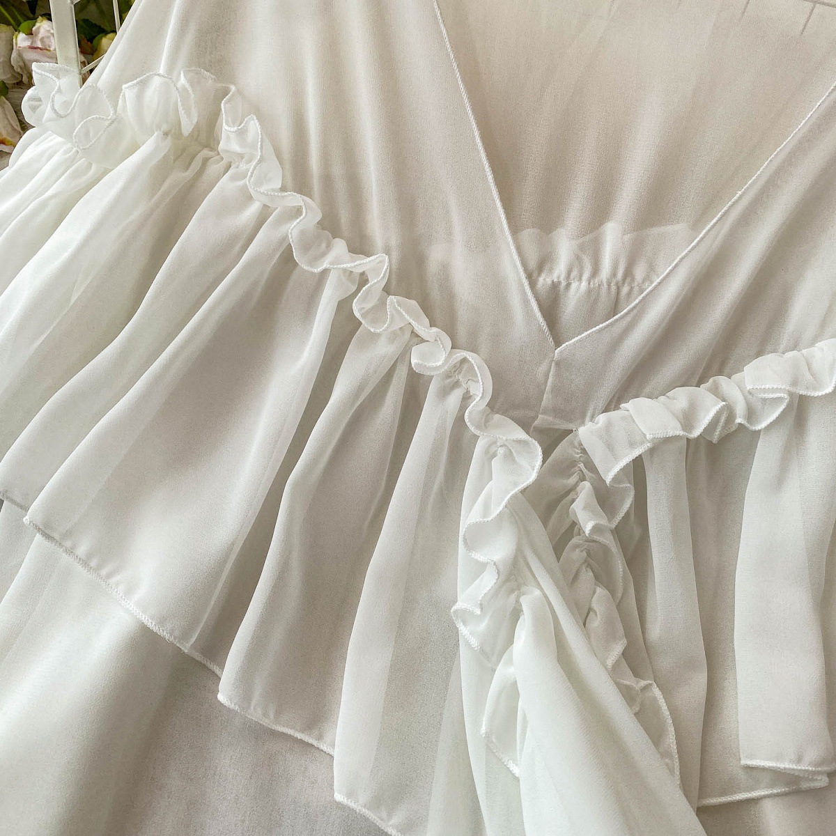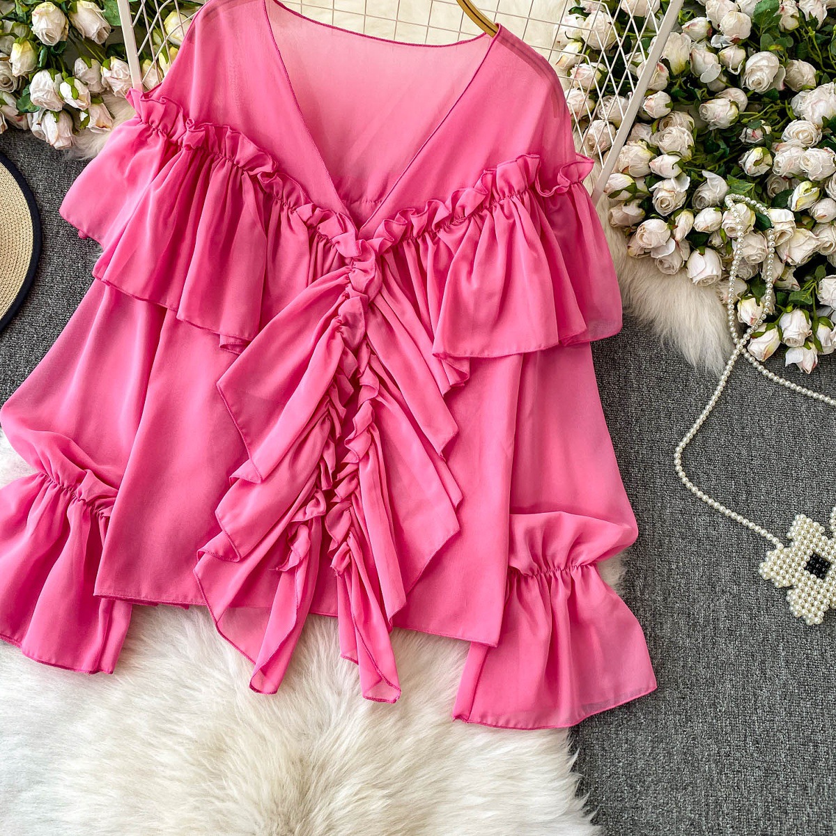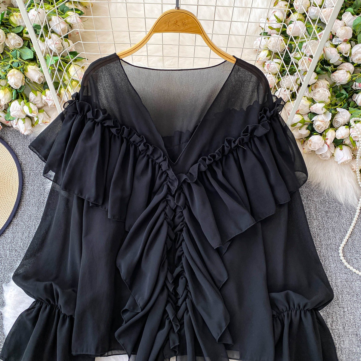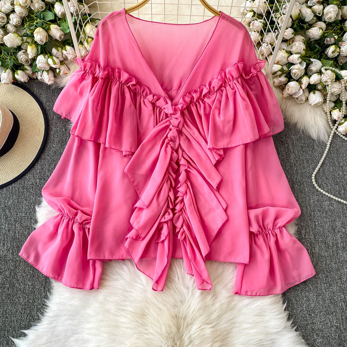 여성을위한 흰색 v 넥 벨 슬리브 자외선 차단제 주름 방지 쉬폰 셔츠 2025 여름 기질 느슨한 슬리밍 프릴 셔츠