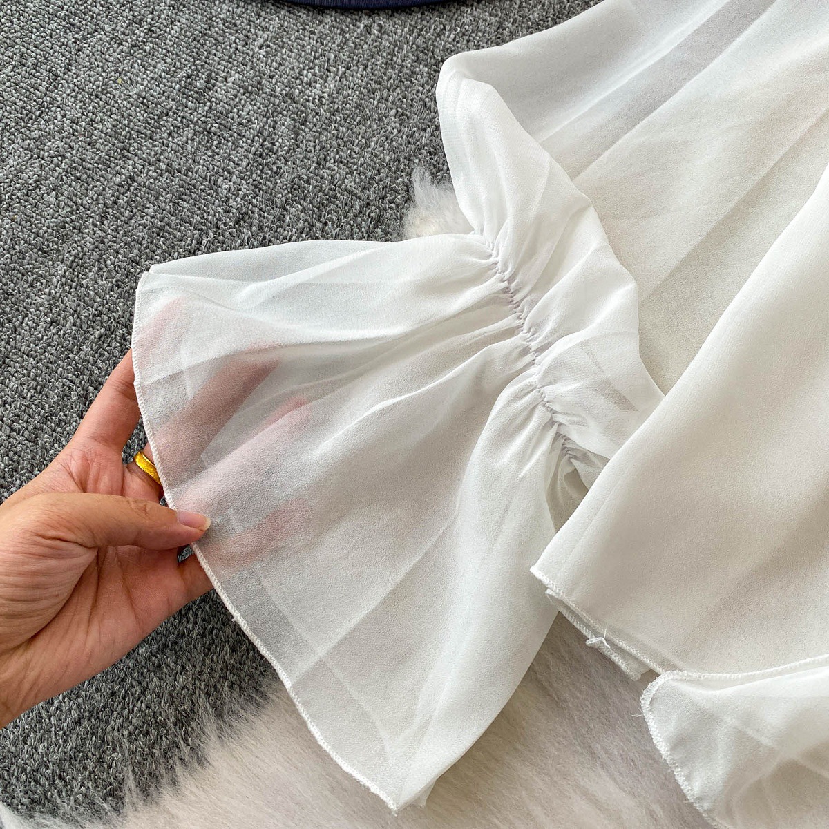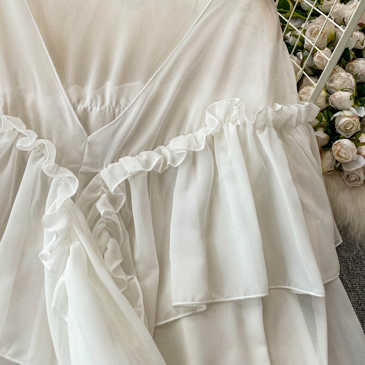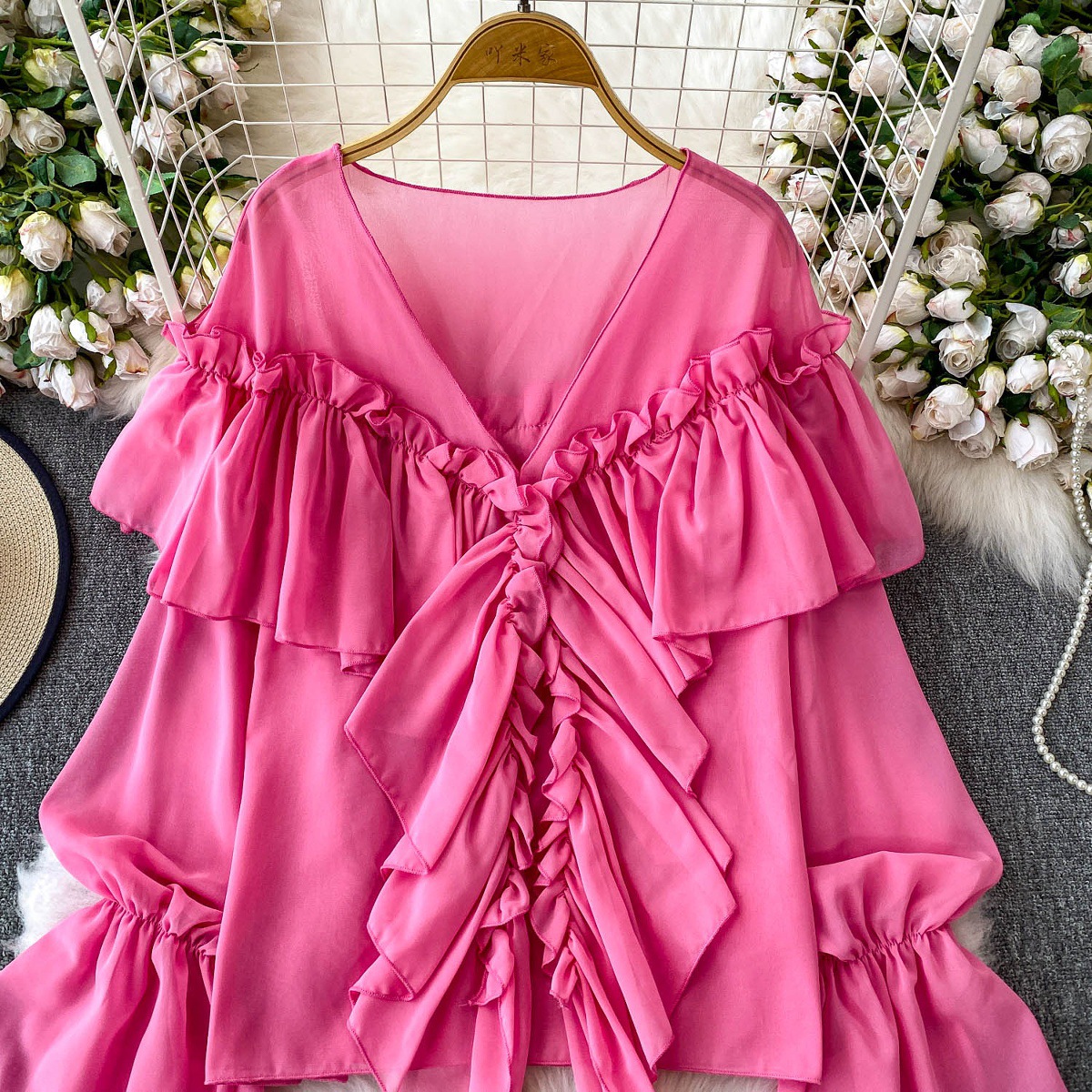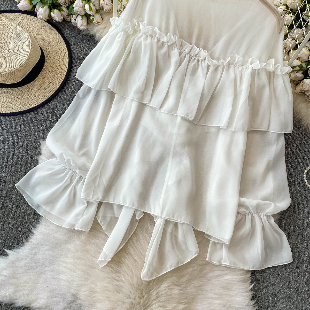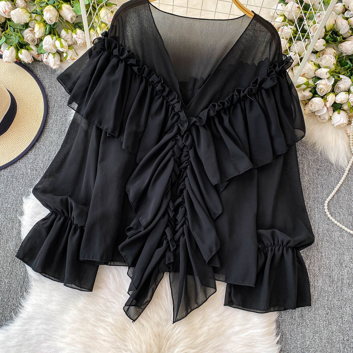 여성을위한 흰색 v 넥 벨 슬리브 자외선 차단제 주름 방지 쉬폰 셔츠 2025 여름 기질 느슨한 슬리밍 프릴 셔츠