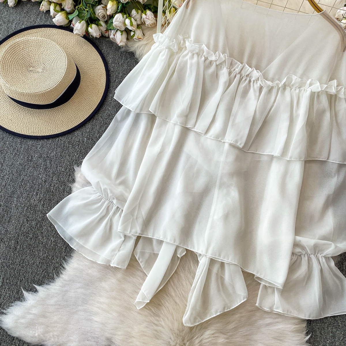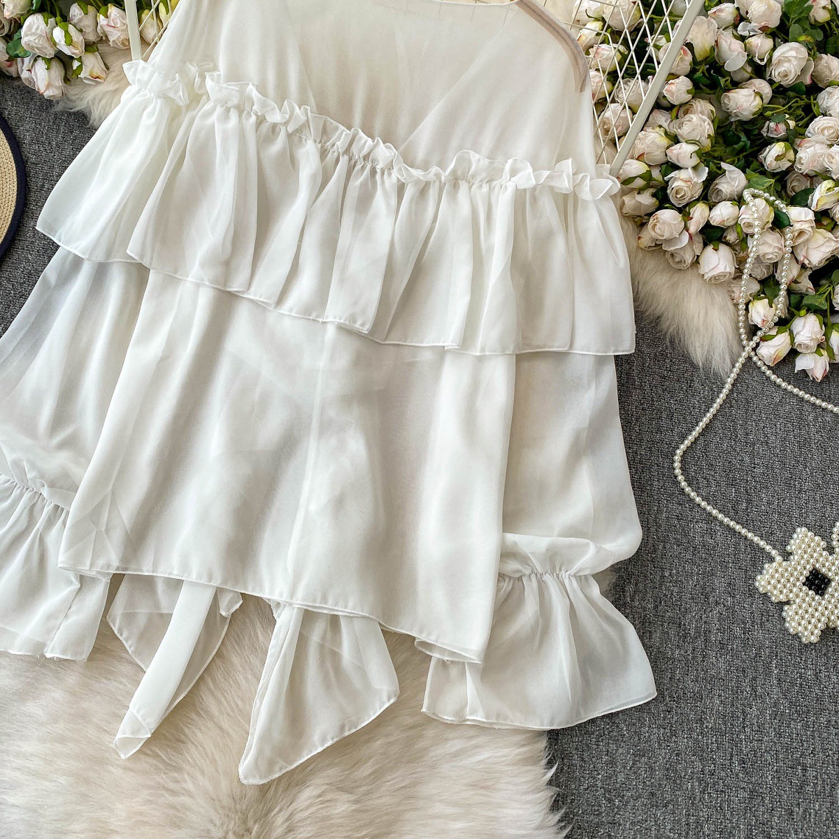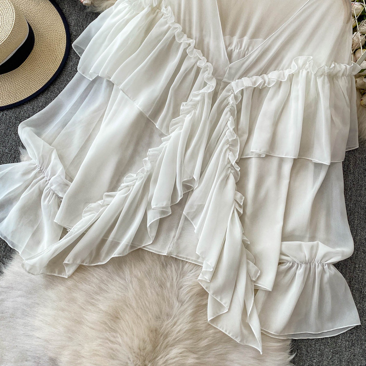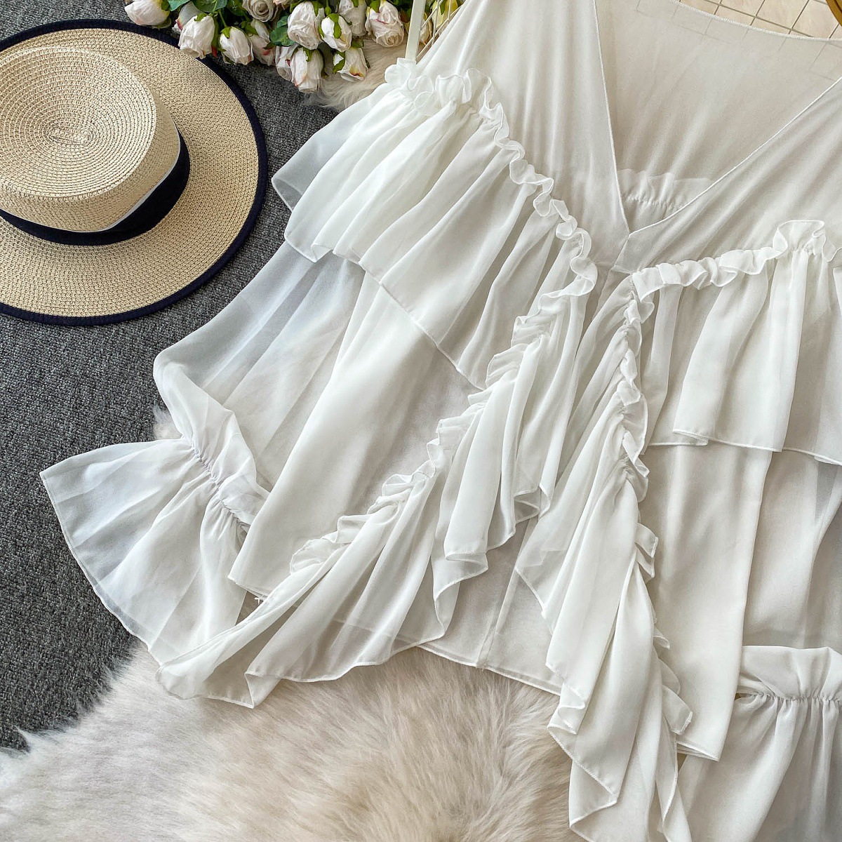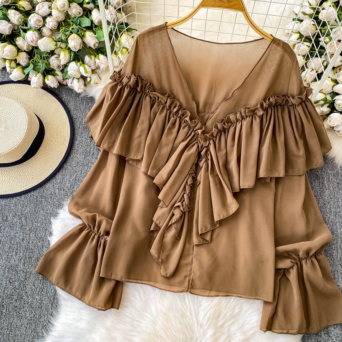 여성을위한 흰색 v 넥 벨 슬리브 자외선 차단제 주름 방지 쉬폰 셔츠 2025 여름 기질 느슨한 슬리밍 프릴 셔츠스토어 가기