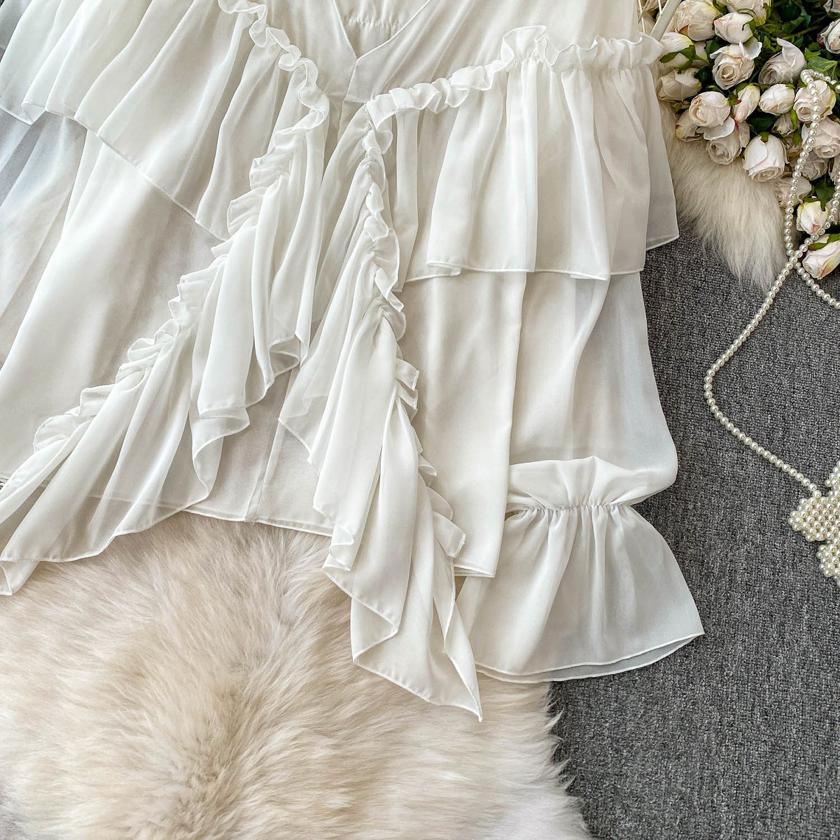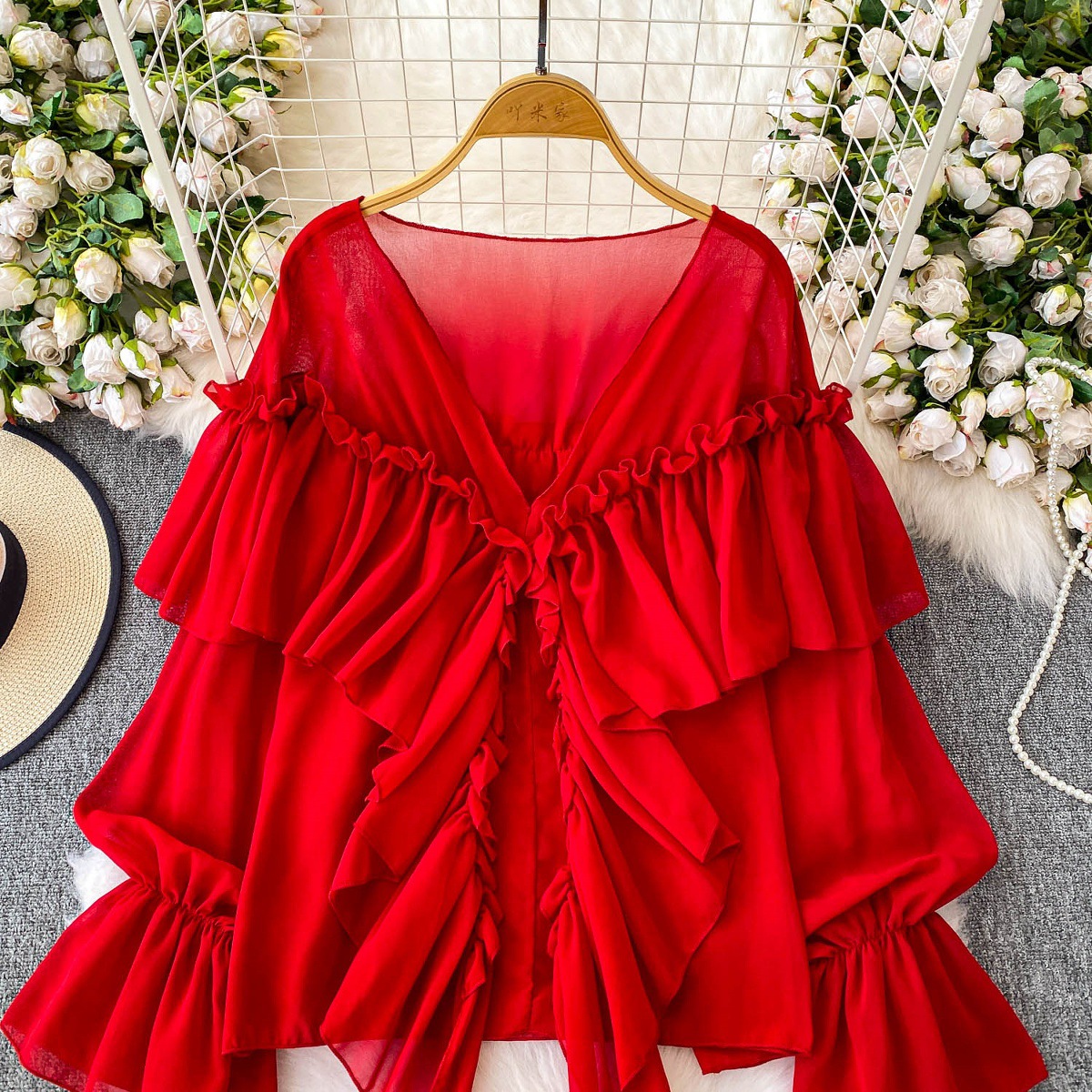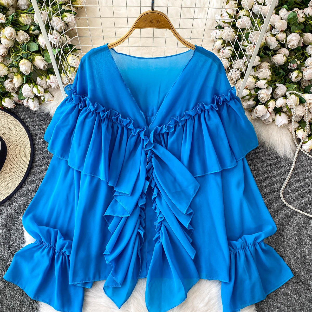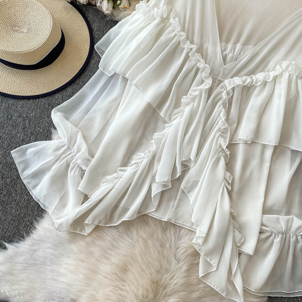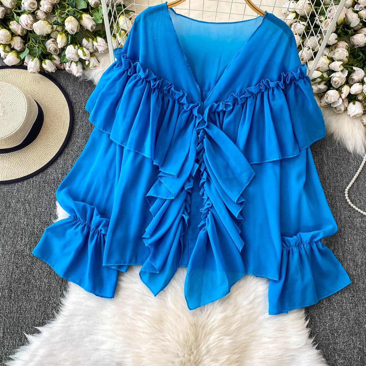 여성을위한 흰색 v 넥 벨 슬리브 자외선 차단제 주름 방지 쉬폰 셔츠 2025 여름 기질 느슨한 슬리밍 프릴 셔츠스토어 가기