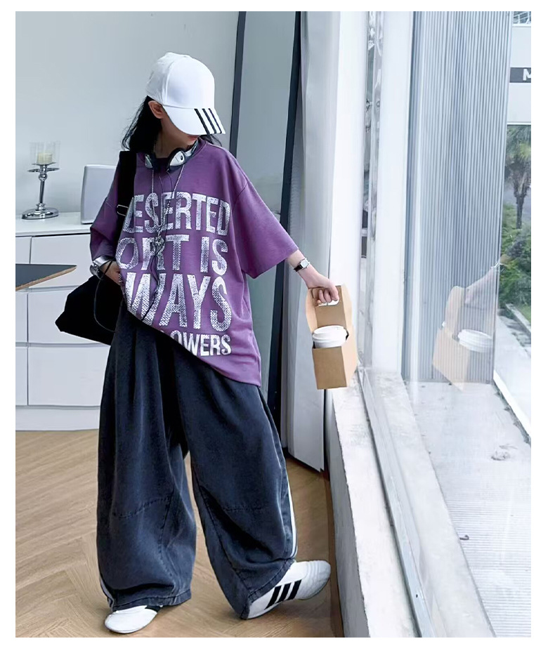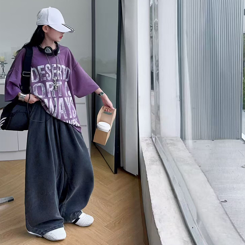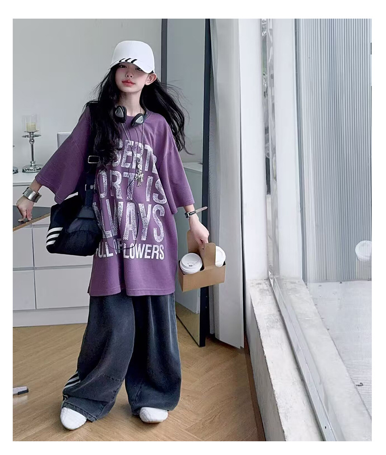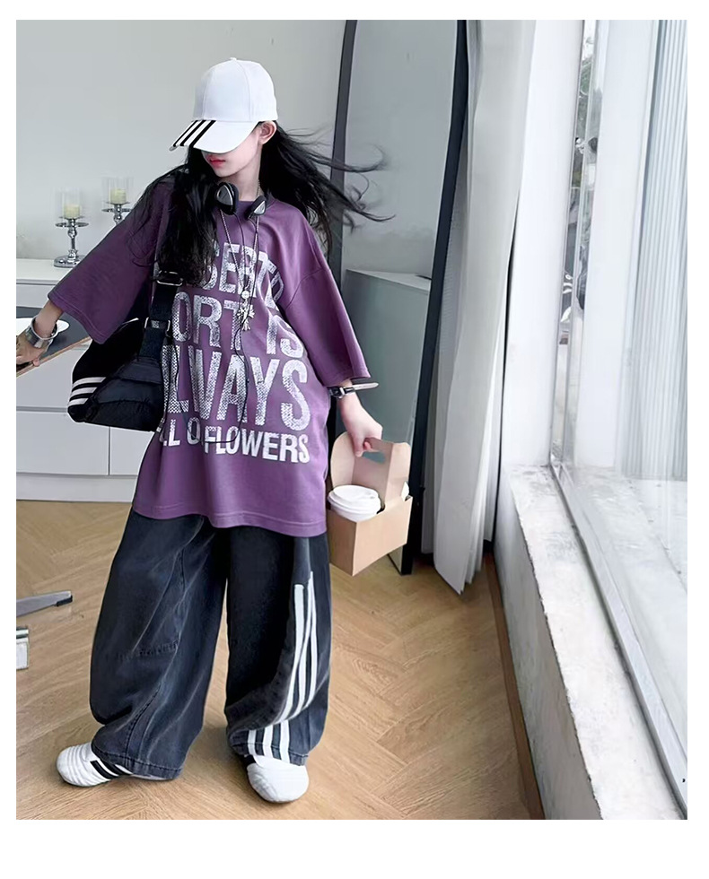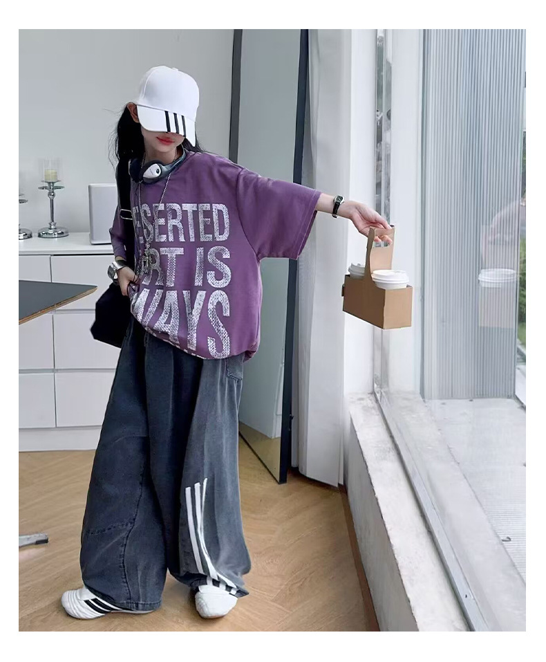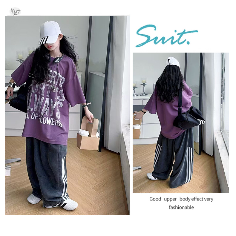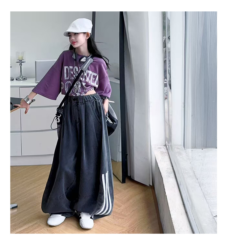 소녀들을 위한 재즈 댄스 의류 2025 새로운 여름 루즈한 레터 티셔츠 텐셀 하렘 팬츠 슈트, 큰 어린이를 위한 시원하고 멋진스토어 가기