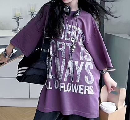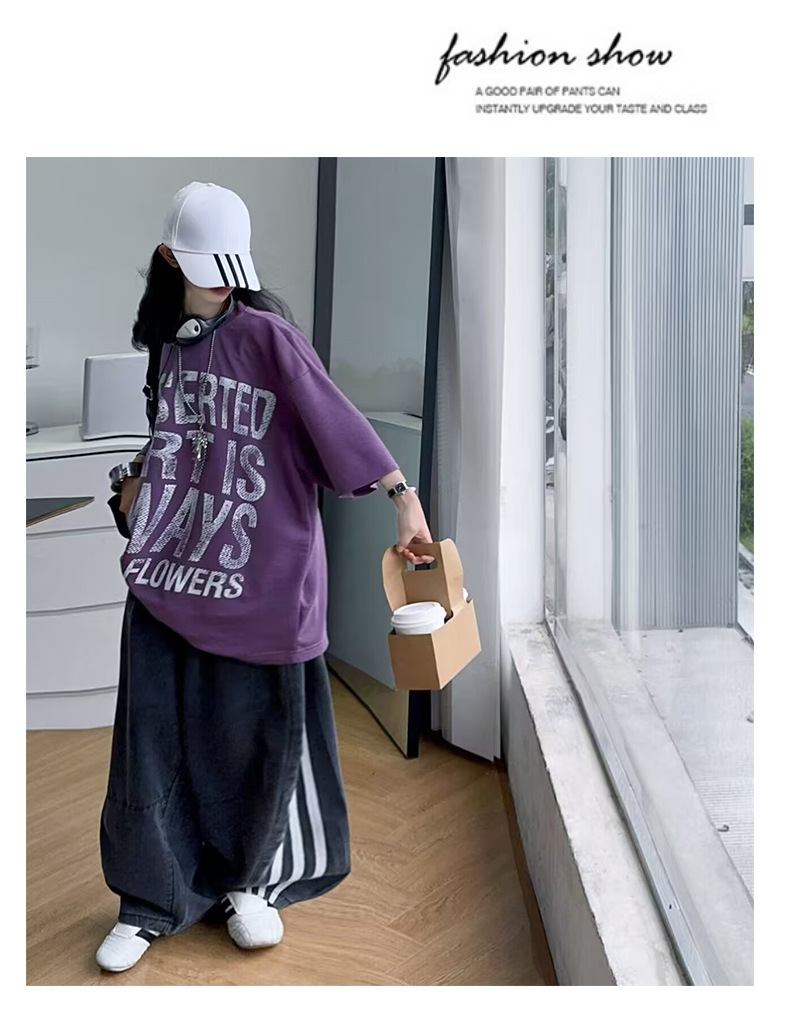 • 보라색 글자 티셔츠 + 블랙 하렘 팬츠