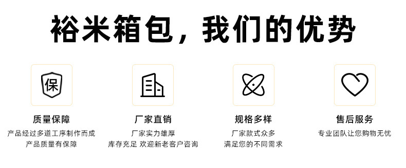 深圳市裕米箱包厂专注箱包20年!我们拥有丰富的箱包制造经验,产品热销国内外,凭借优良的品质与服务,赢得各界朋友的信赖与肯定,享誉海内外。支持大量批发、来样定制、OEM贴牌定制,一件代发, 如需定制各种图案、logo、尺寸、颜色、配件、里布的箱包,欢迎与我们联系洽谈,期待您的到来。
