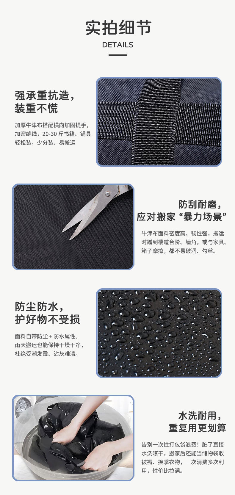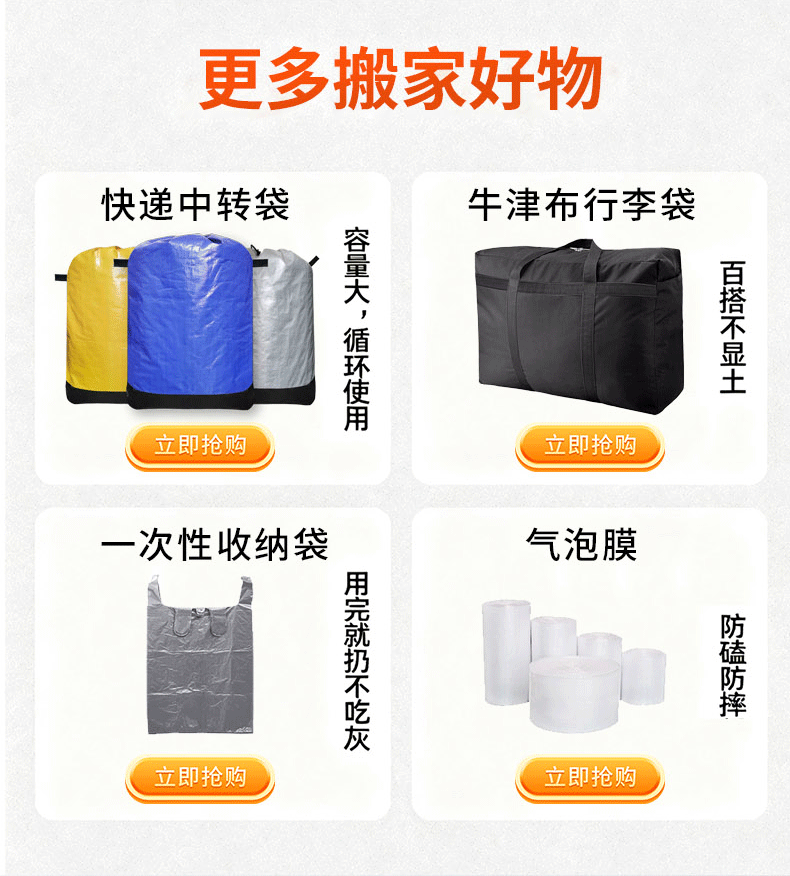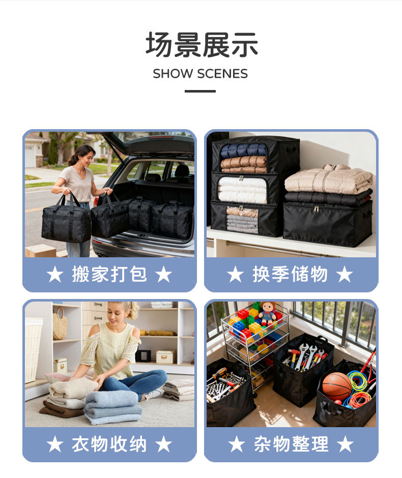 ·水洗耐用,重复用更划算 告别一次性打包袋浪费!脏了直接水洗晾干,搬家后还能当储物袋收被褥、换季衣物,一次消费多次利用,性价比拉满。