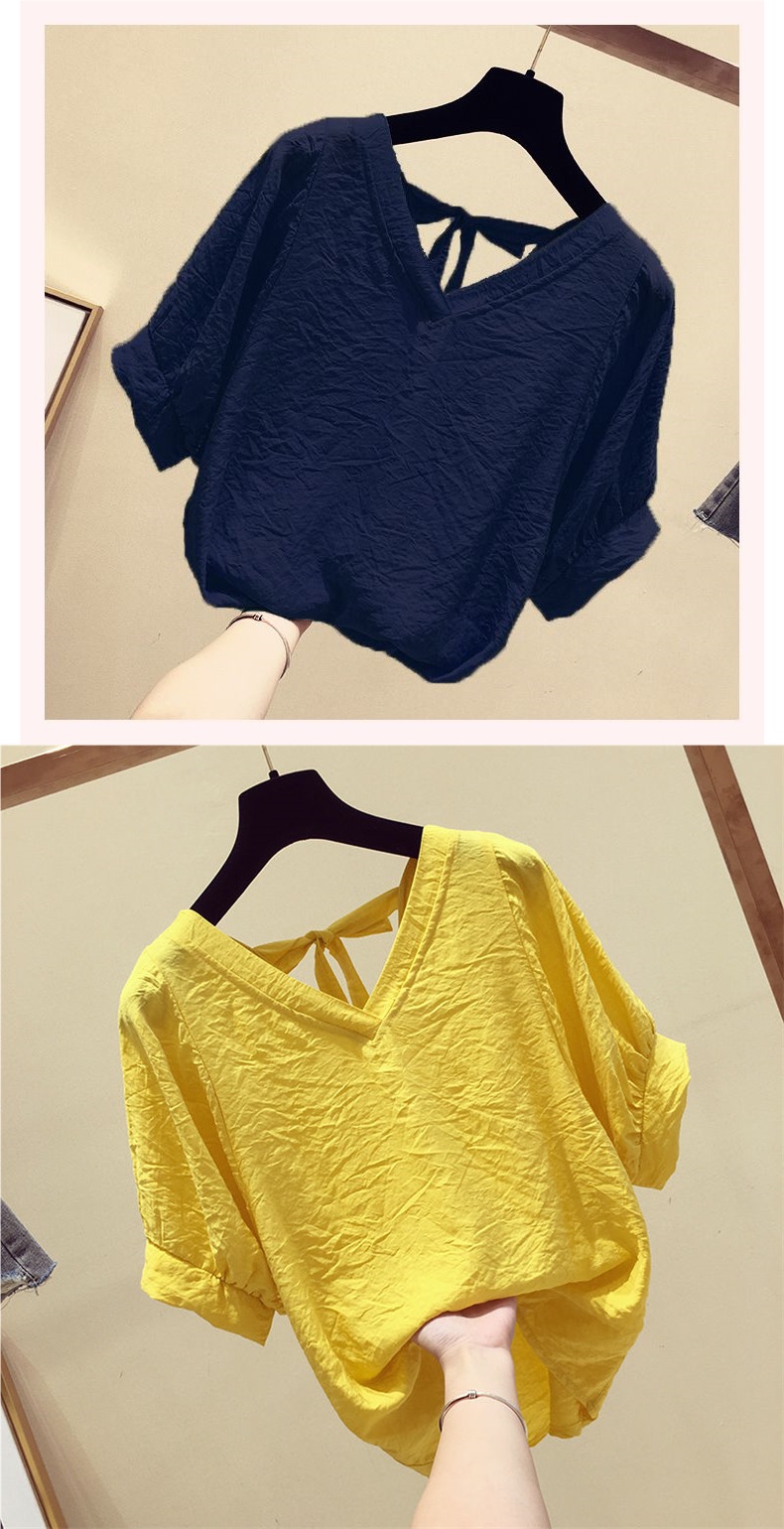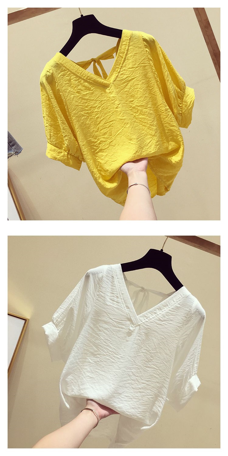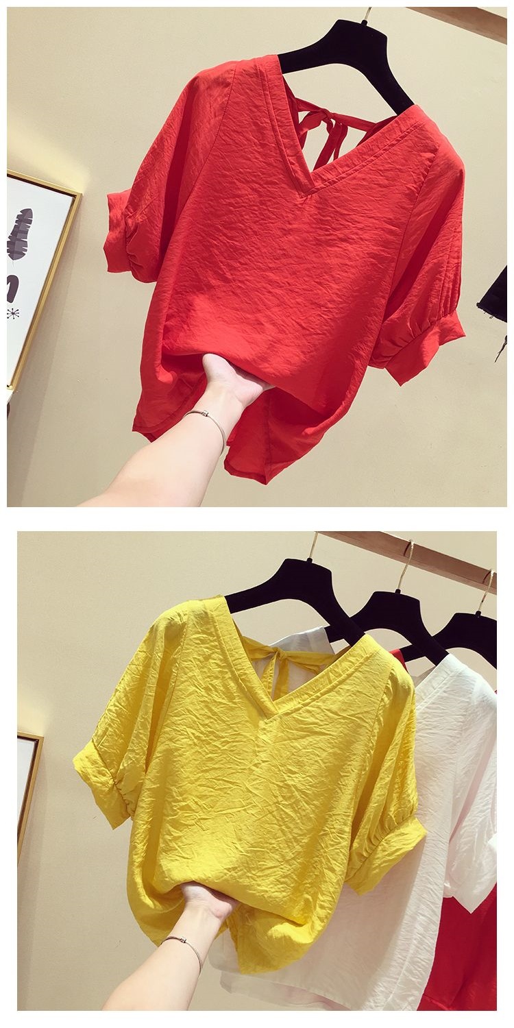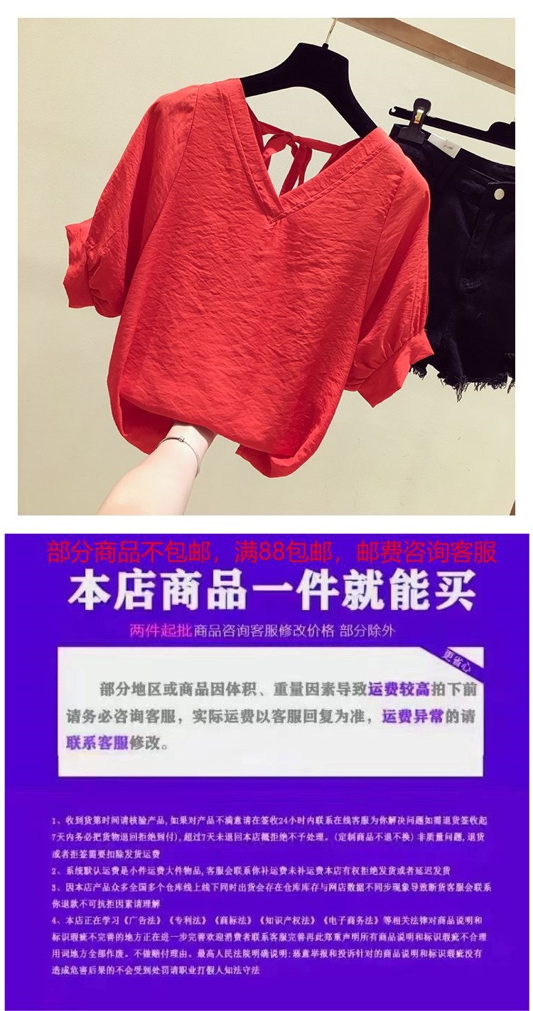 V 넥 백리스 모조 쉬폰 셔츠 여성용 반팔 2023 새로운 한국 스타일 슈퍼 요정 달콤한 루즈 슬리밍 배꼽 커버 탑스토어 가기