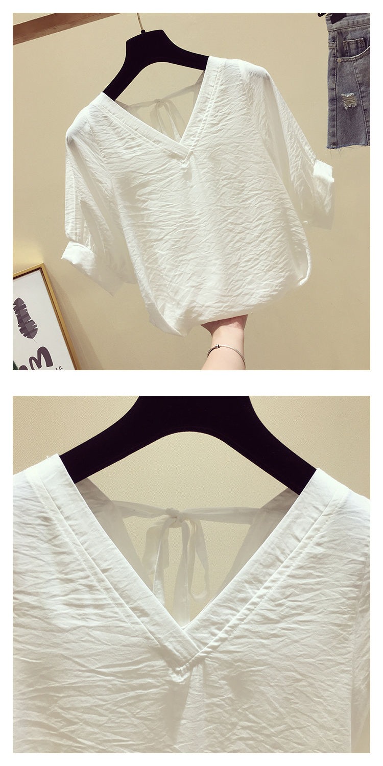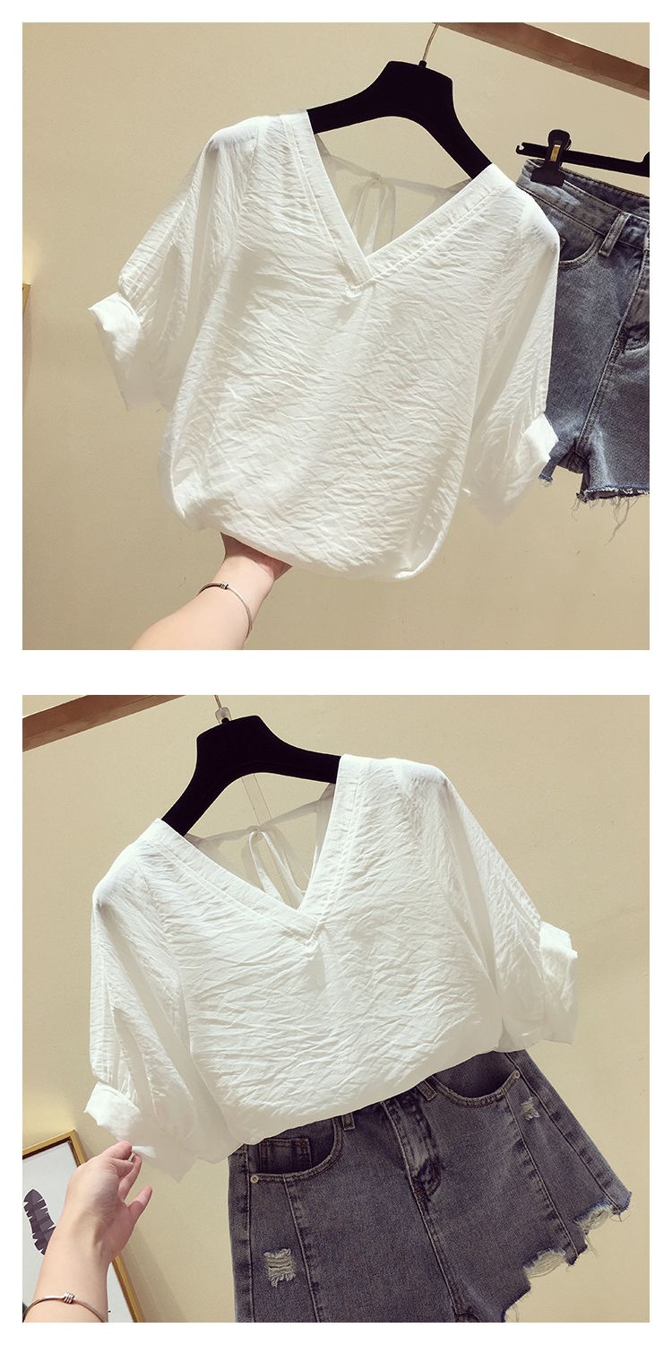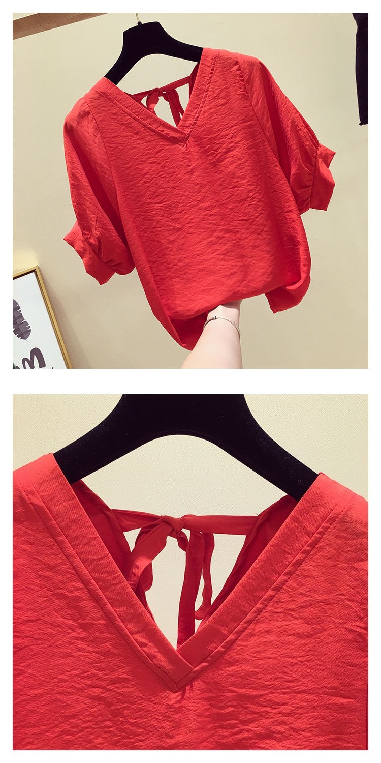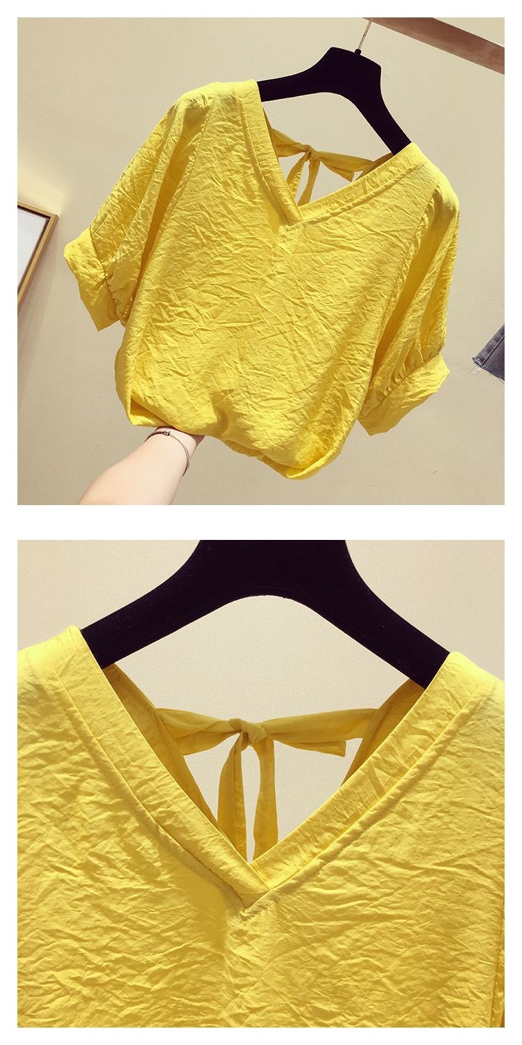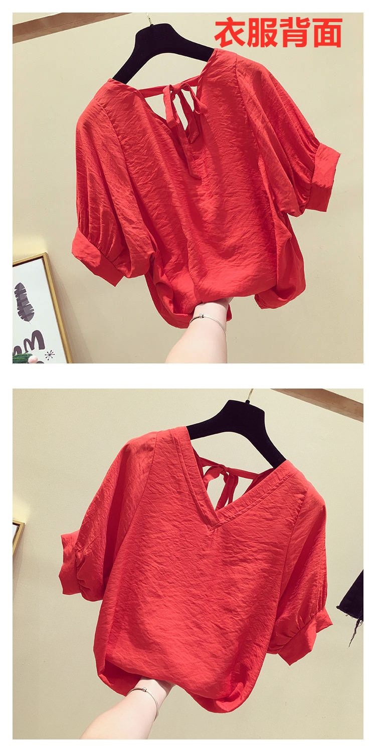 V 넥 백리스 모조 쉬폰 셔츠 여성용 반팔 2023 새로운 한국 스타일 슈퍼 요정 달콤한 루즈 슬리밍 배꼽 커버 탑스토어 가기