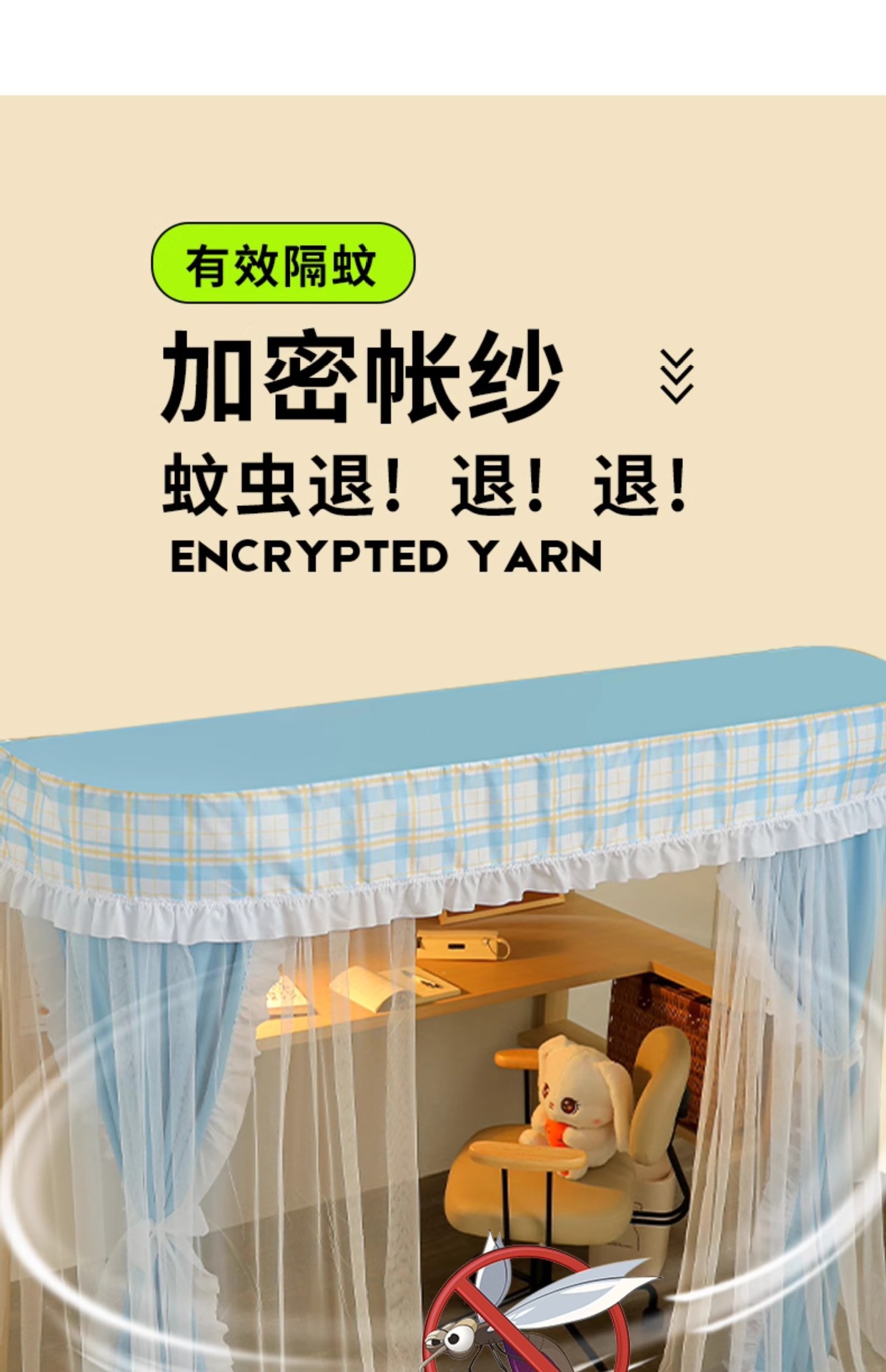 • 체크무늬 레이스-베이지 [테이블커튼봉+통기성암막커튼+A급 모기방지망사+방진탑]
