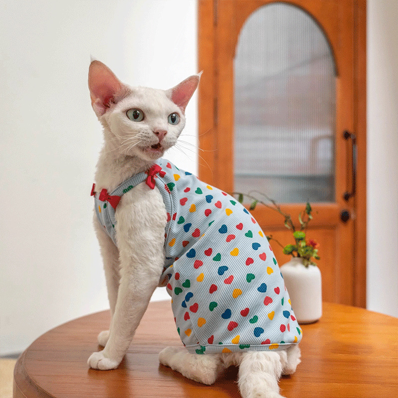 독일산 고양이 옷, 털이 없는 고양이 스피닉스용, 스트랩형, 신축성 있는 배 보호용, 리본 장식 조끼, 반팔 애완 고양이 옷
