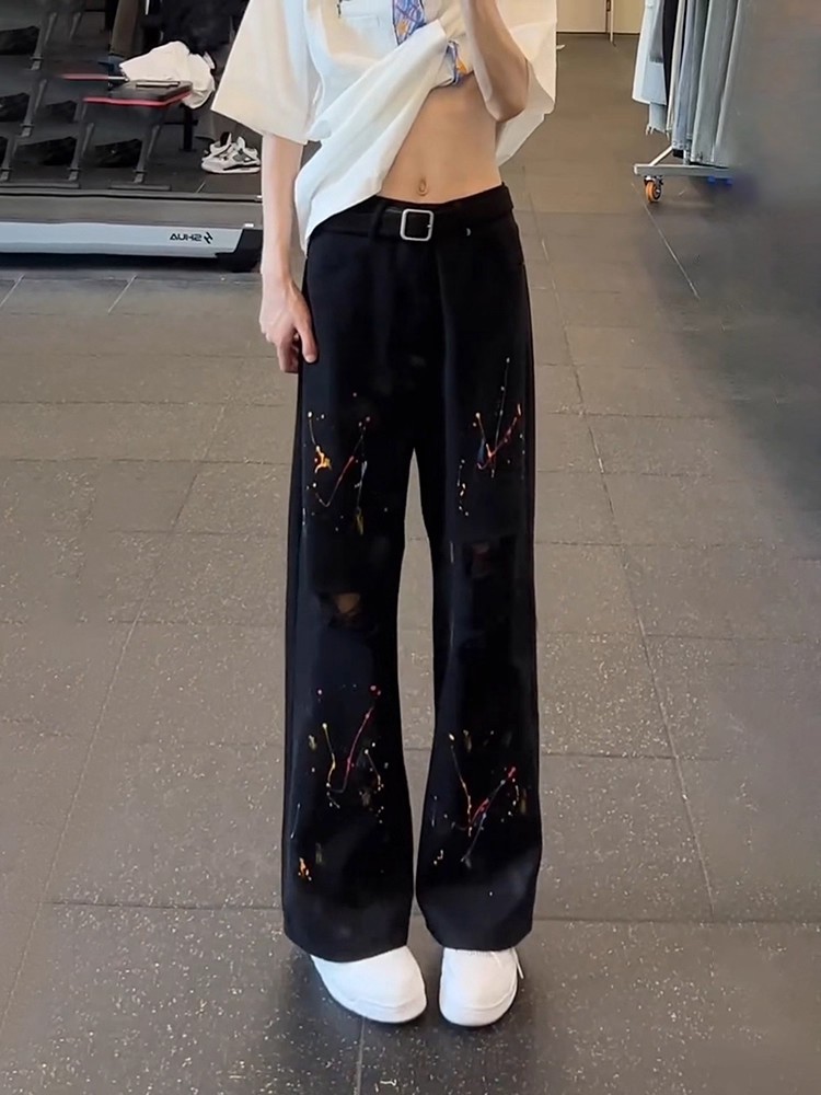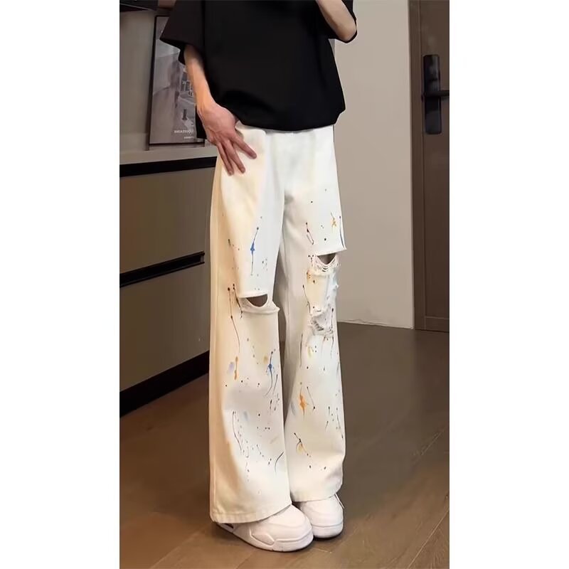 남성용 그래피티 찢어진 청바지, 여름 아메리칸 스타일, 핸섬한 고급 팬츠, 스트레이트 레그, 루즈하고 레그 피팅이 없는 부츠컷 팬츠