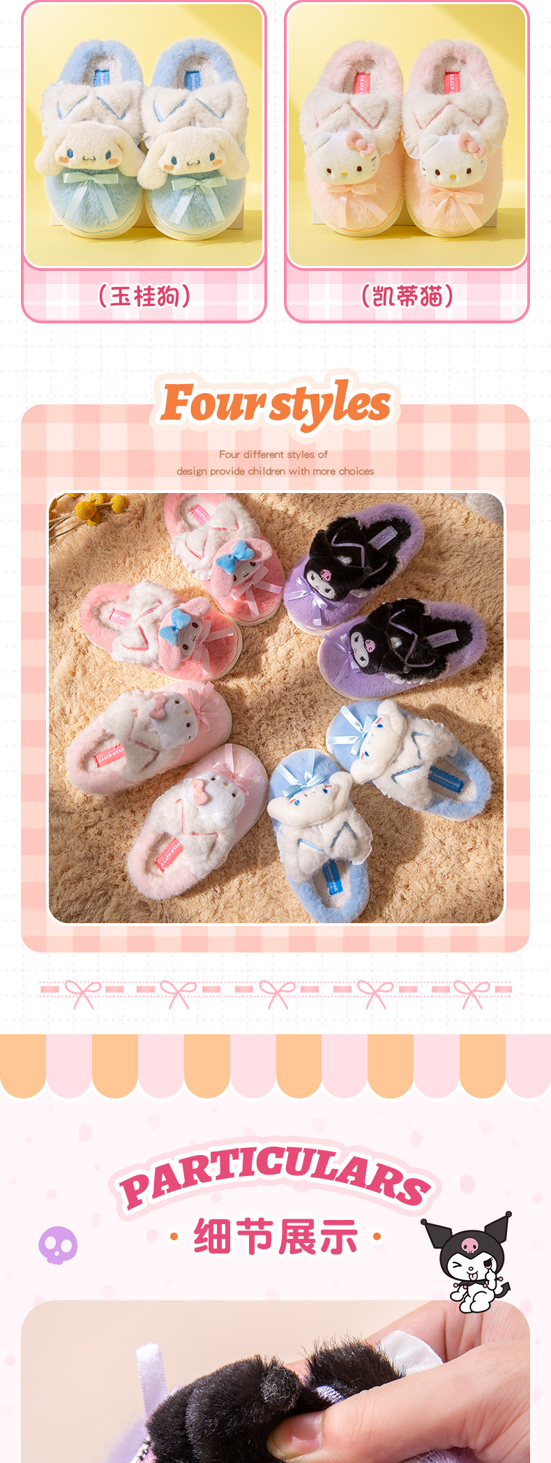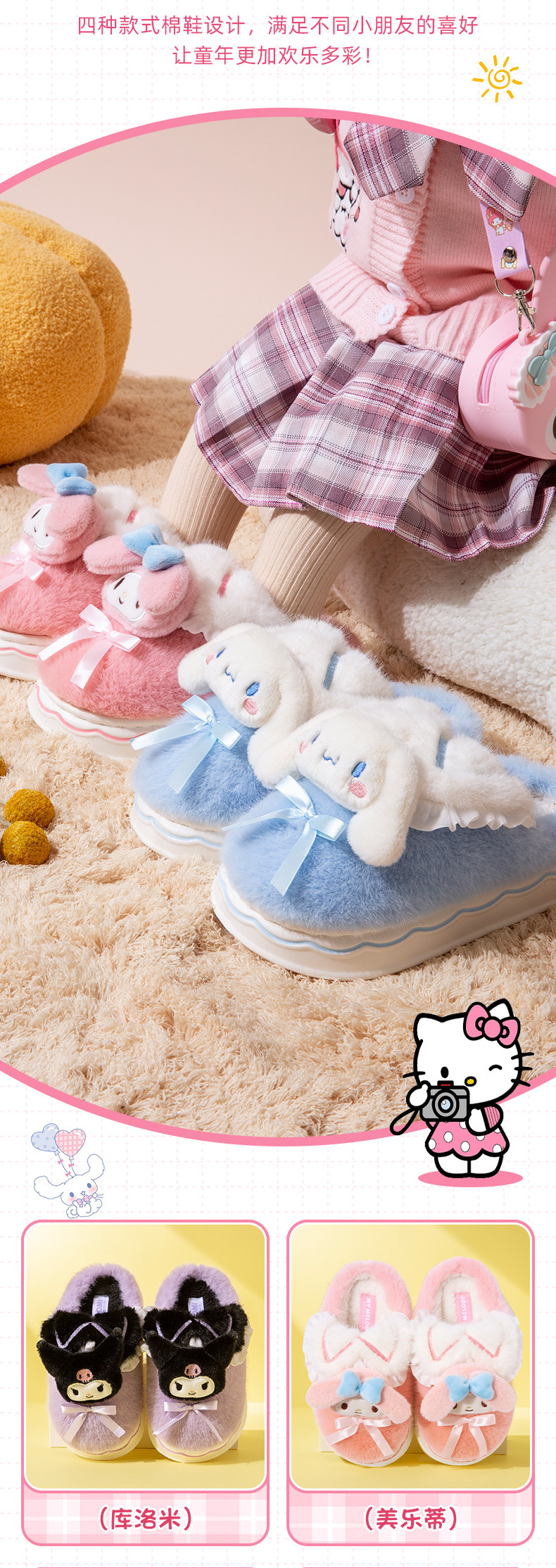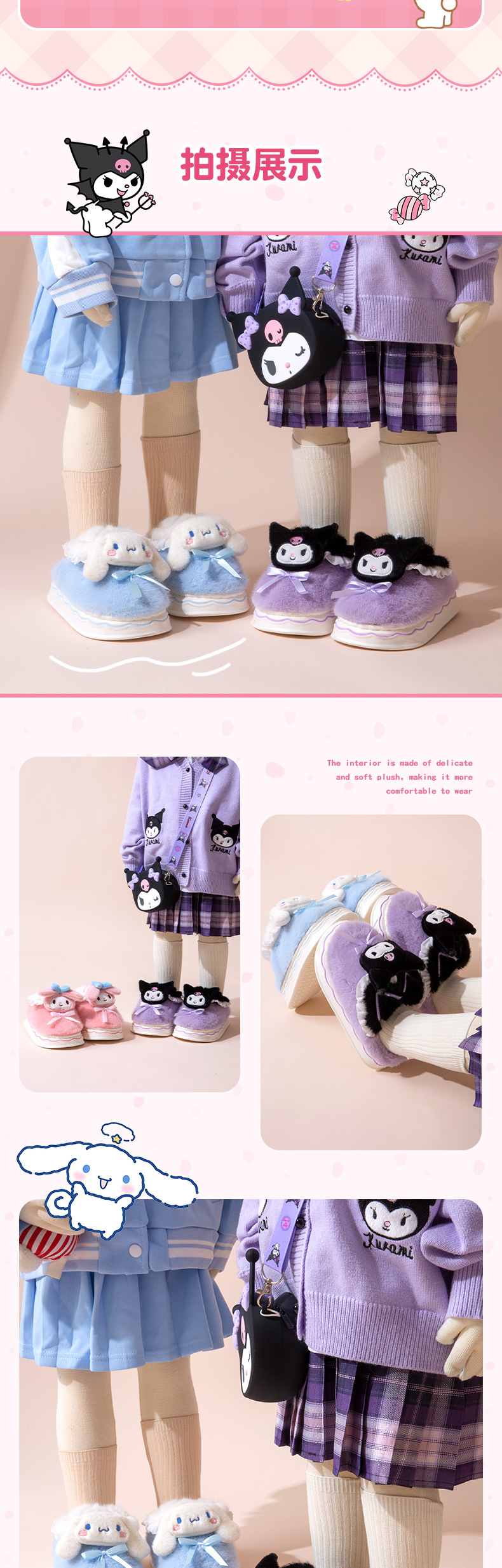 Kuromi 어린이 면화 슬리퍼 소녀 2024 새로운 겨울 부모-자식 플러시 따뜻한 실내 소녀 아기 슬리퍼스토어 가기