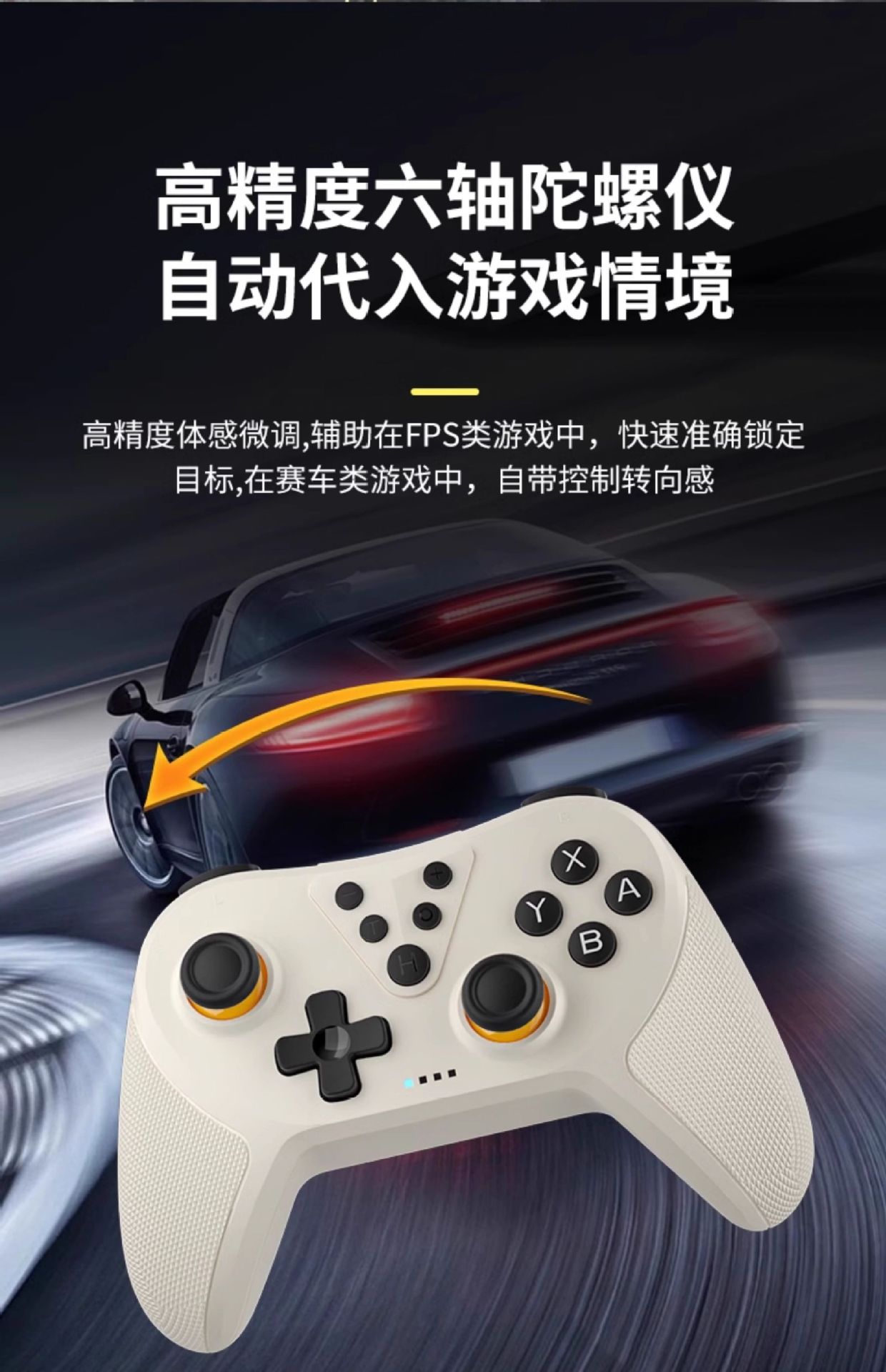 Switch蓝牙游戏手柄,带六轴陀螺仪,双马达震动,一键唤醒,一键连发功能。
