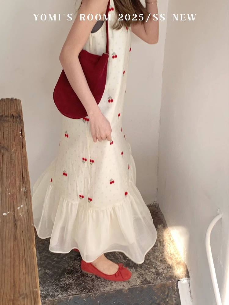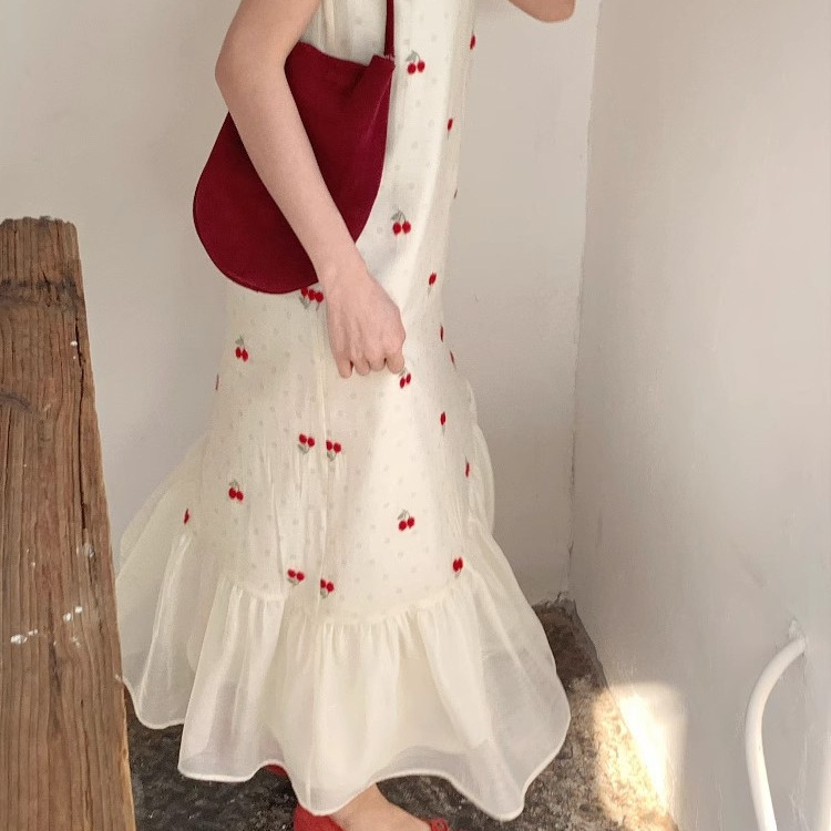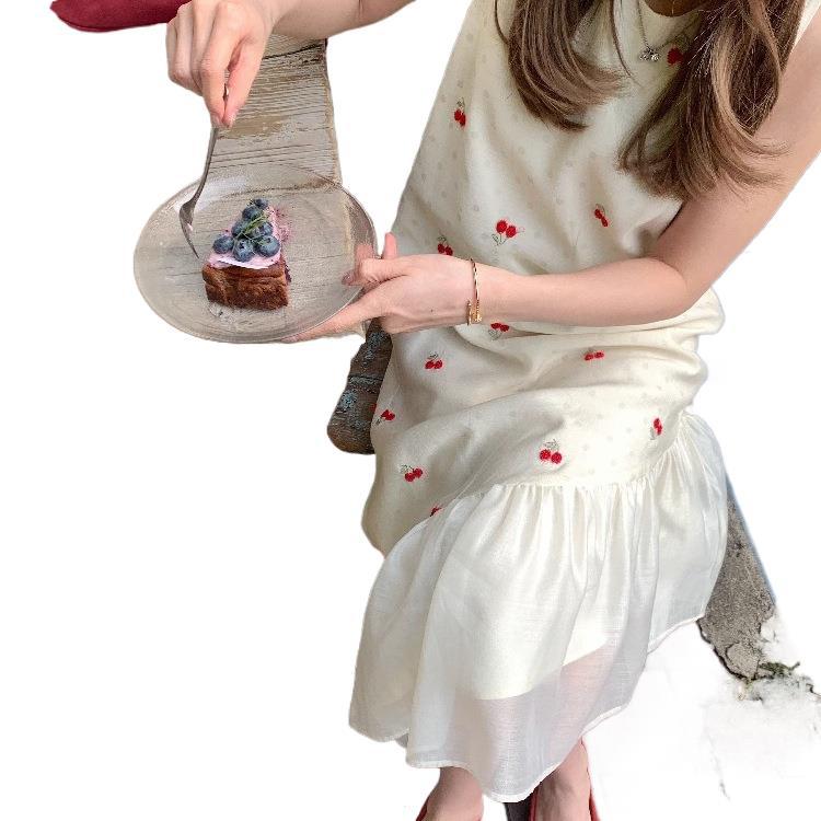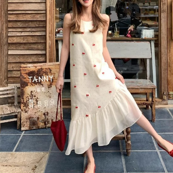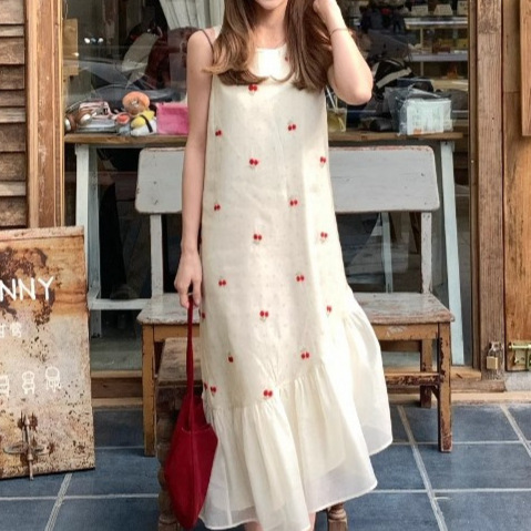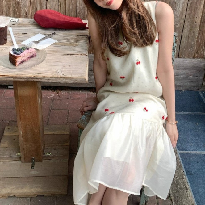 대외 무역 여름 한국 스타일 새로운 달콤한 꽃 기질 프랑스 민소매 조끼 메쉬 스플 라이스 롱 스커트 여성용 드레스스토어 가기