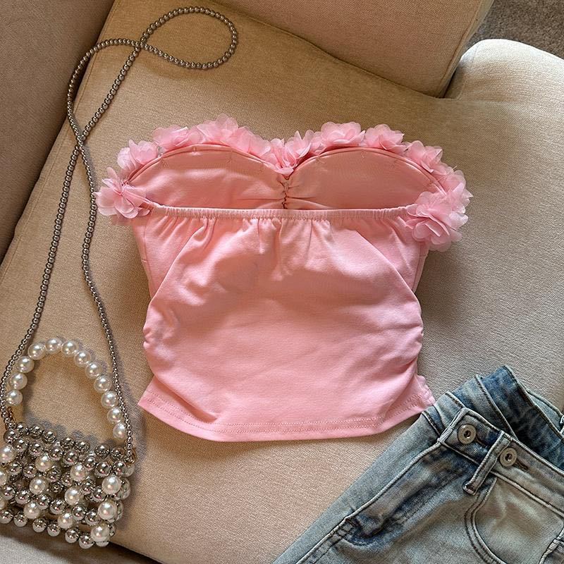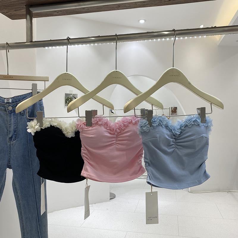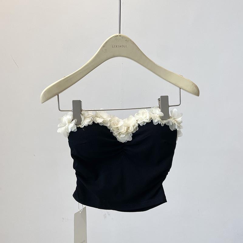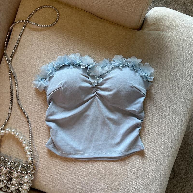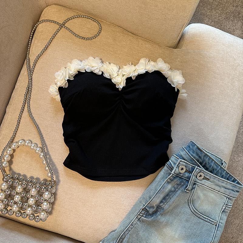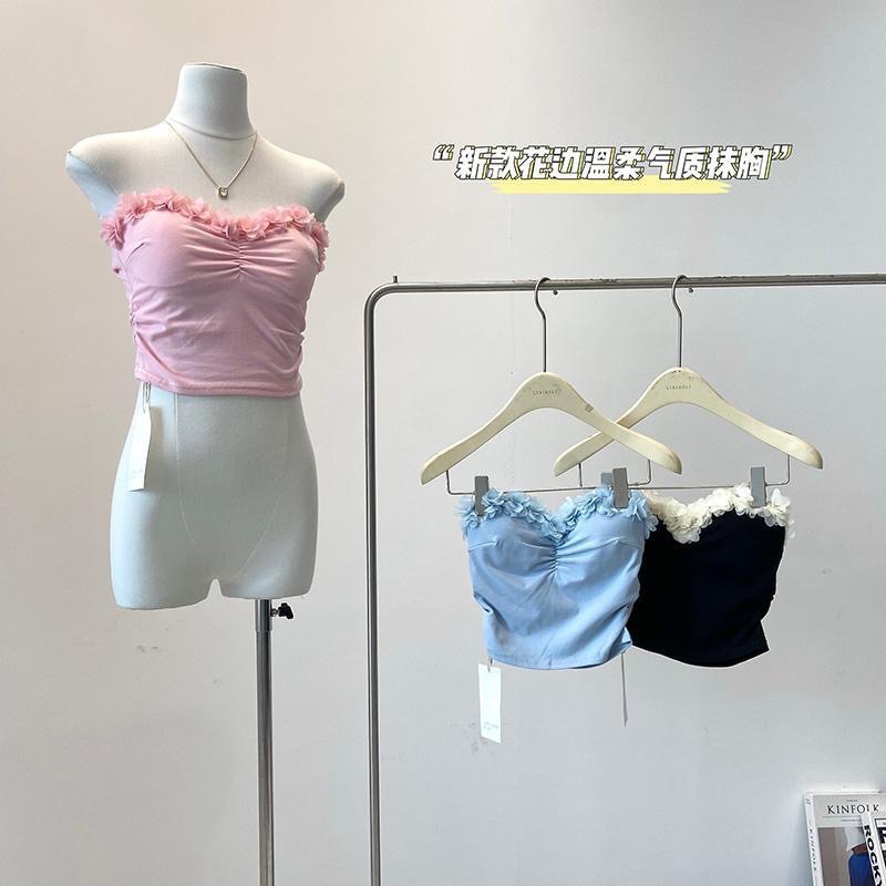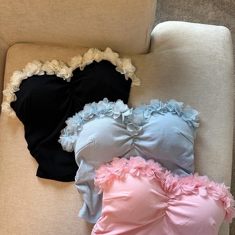 3055 # 가슴 패드가 있는 새로운 순수한 꽃무늬 튜브탑, 가슴을 감싸주는 튜브탑, 여성용 아름다운 등 짧은 탑스토어 가기