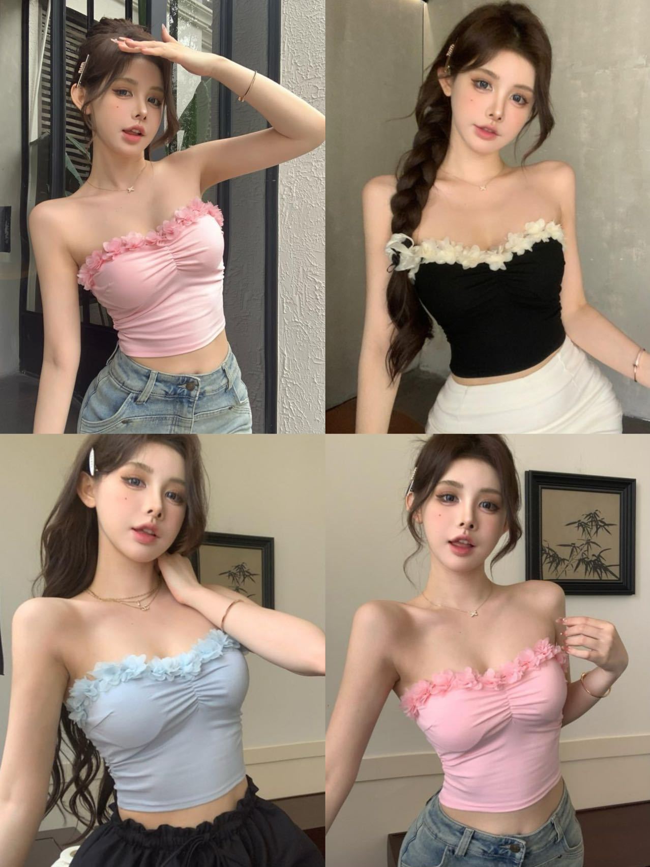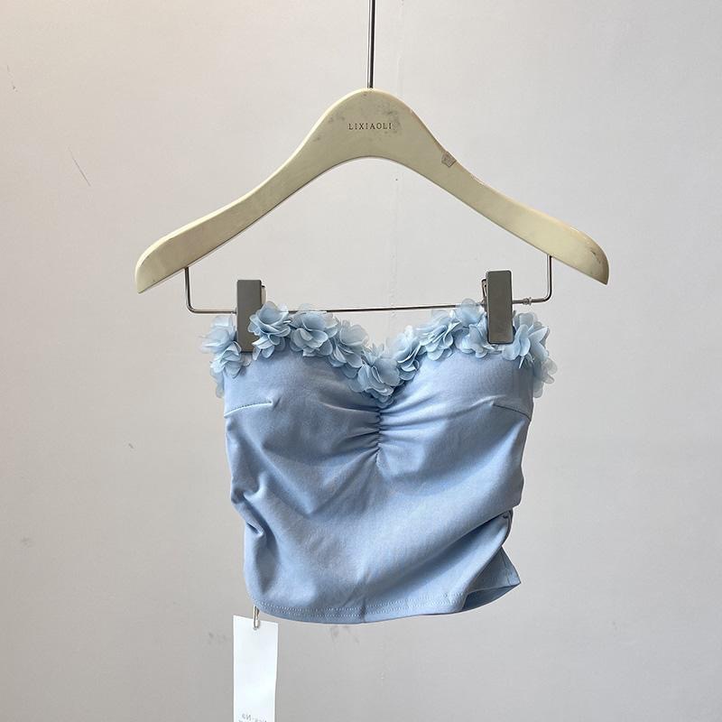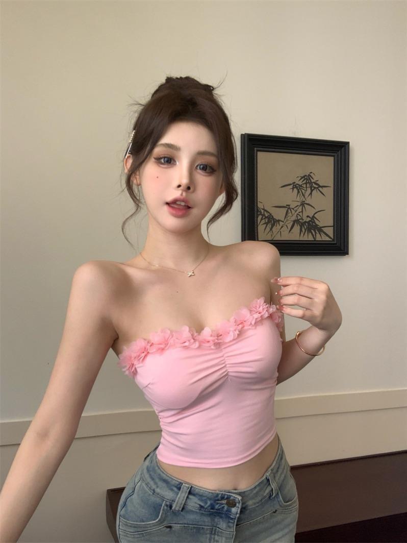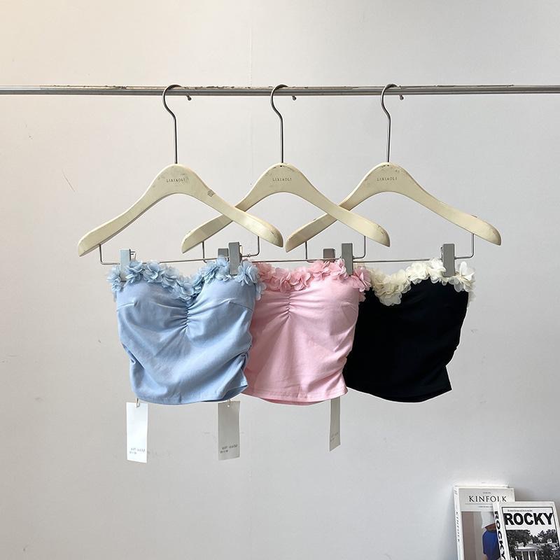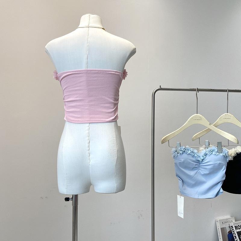 3055 # 가슴 패드가 있는 새로운 순수한 꽃무늬 튜브탑, 가슴을 감싸주는 튜브탑, 여성용 아름다운 등 짧은 탑스토어 가기