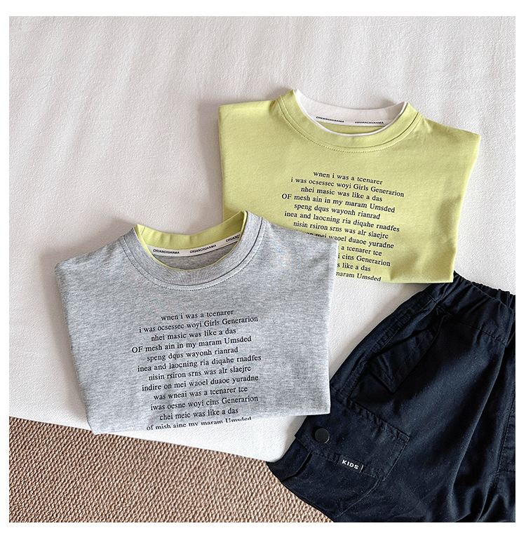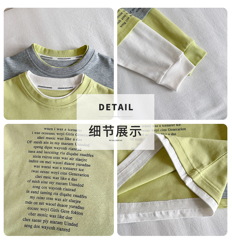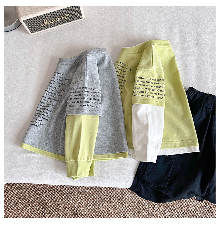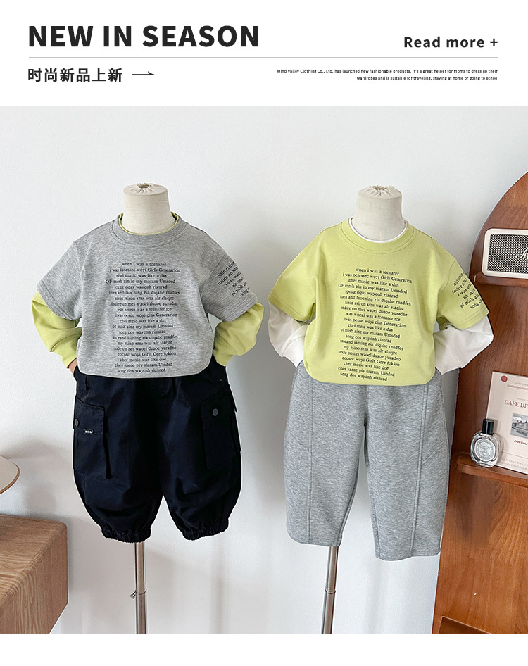 바람의 계곡 2025 가을 신작 아동복 아동 한국어 버전 가짜 투피스 스플라이스 티셔츠 소년 맞춤형 레터 탑스토어 가기