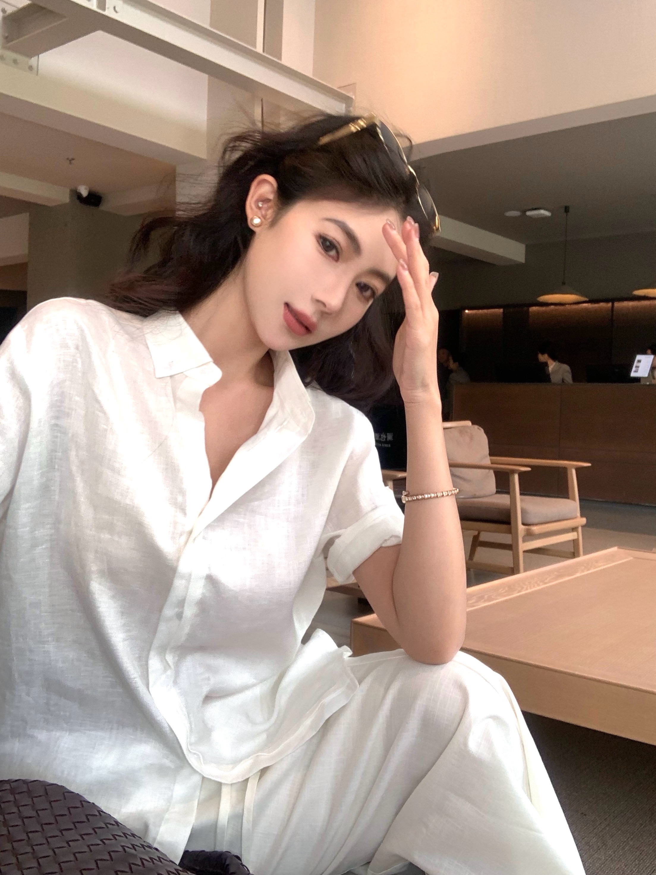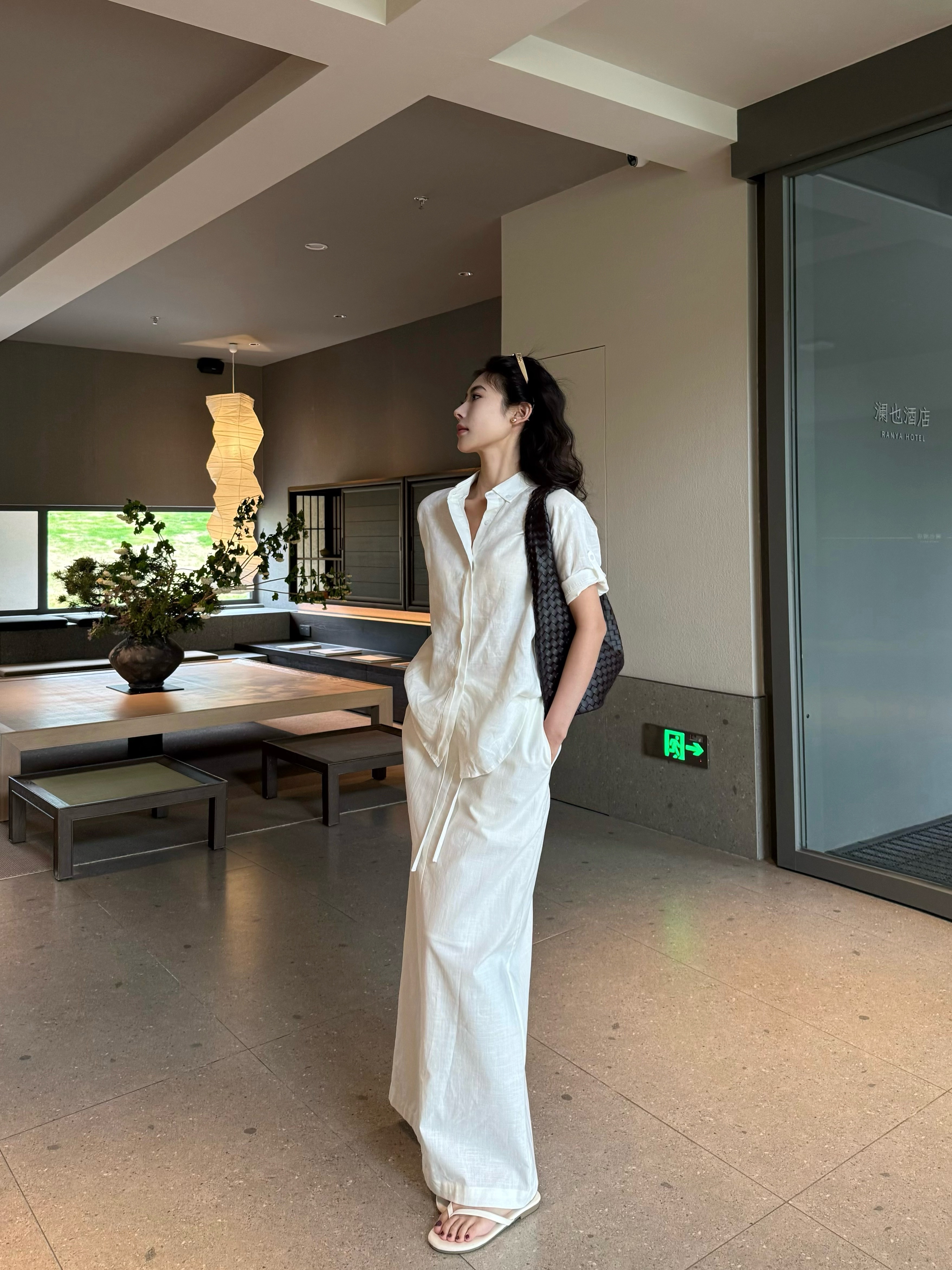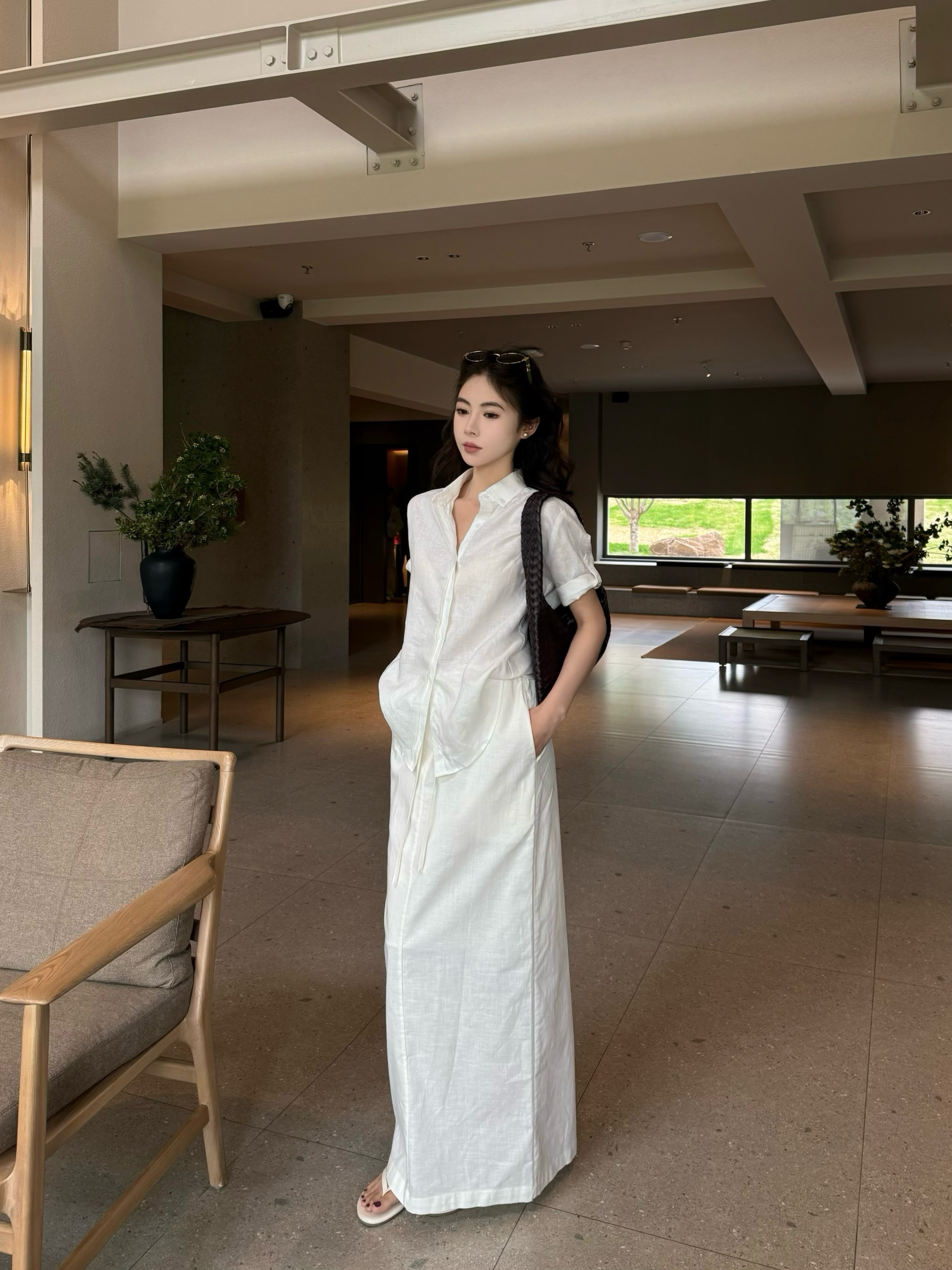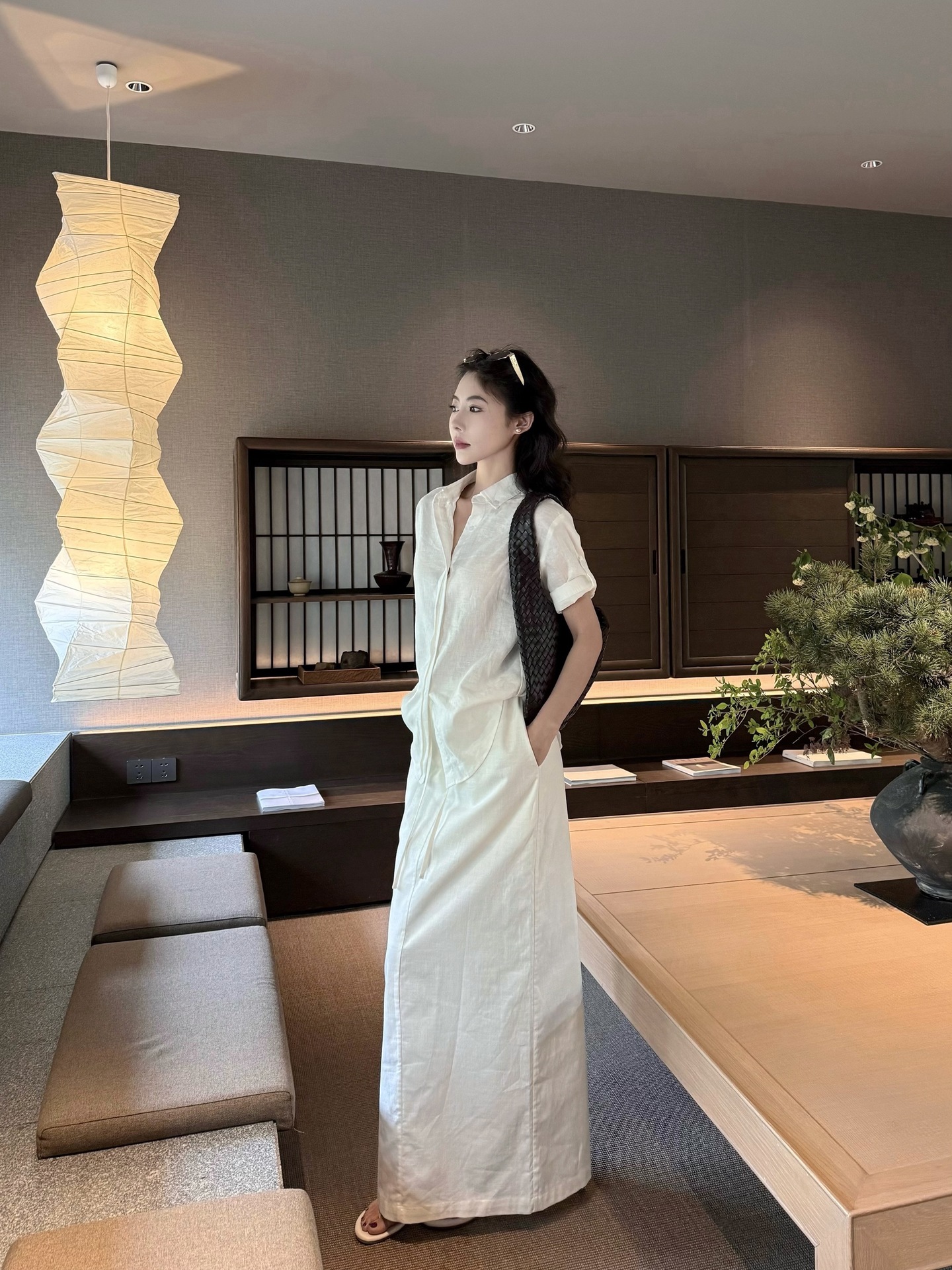 시메이 2025 여름 패션 세트 화이트 폴로 칼라 반팔 셔츠 여성용 드레이프 하이웨이스트 스커트 투피스 세트