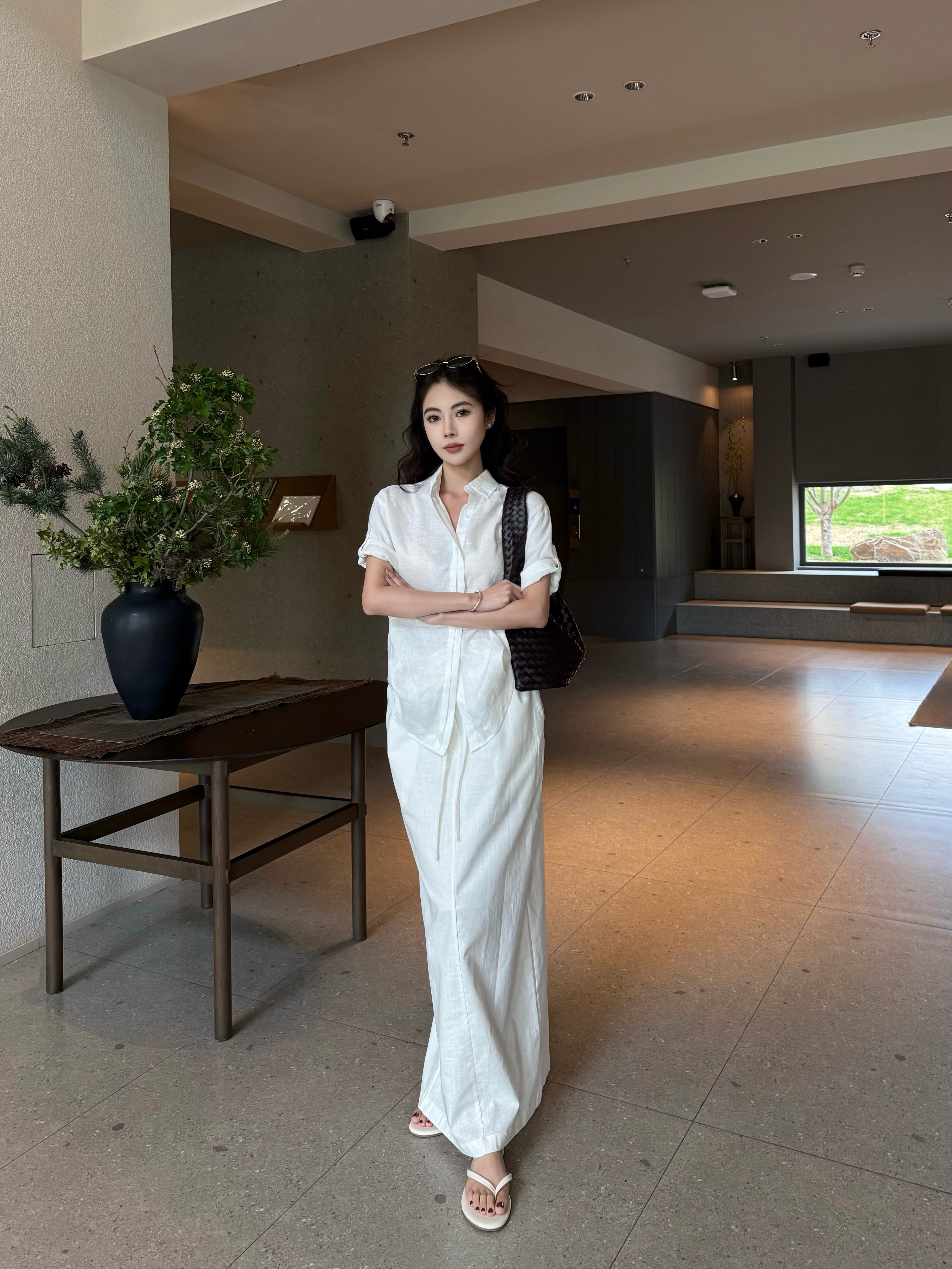 시메이 2025 여름 패션 세트 화이트 폴로 칼라 반팔 셔츠 여성용 드레이프 하이웨이스트 스커트 투피스 세트스토어 가기