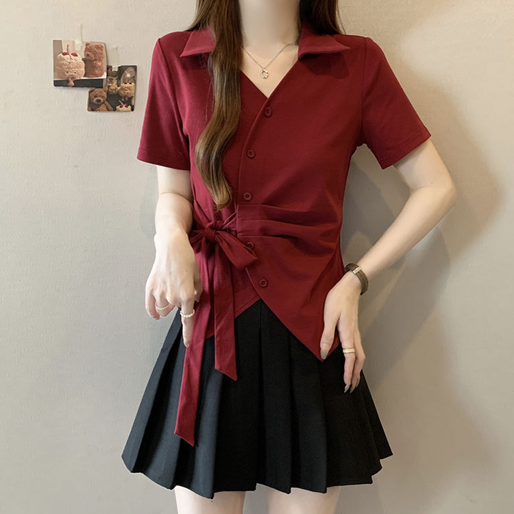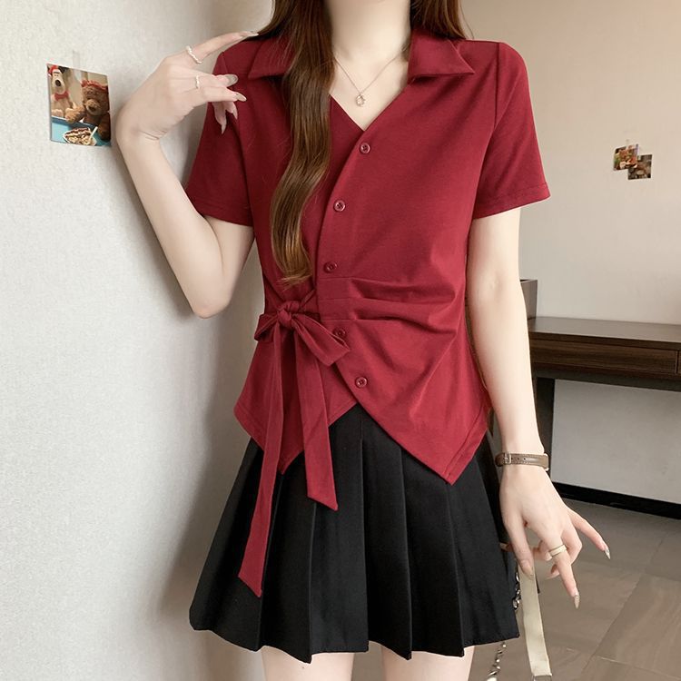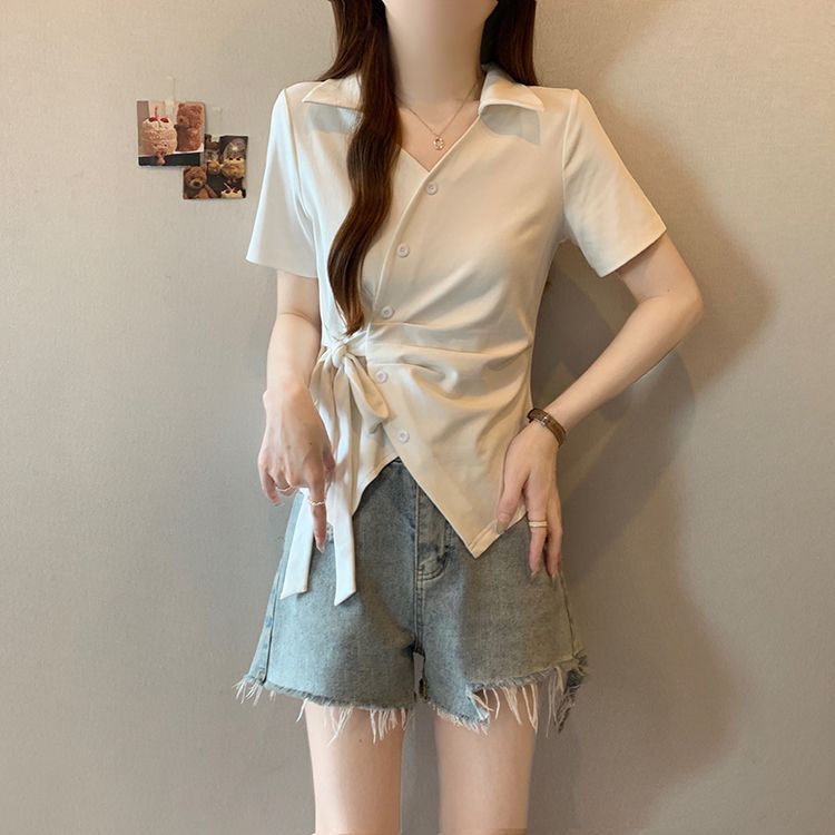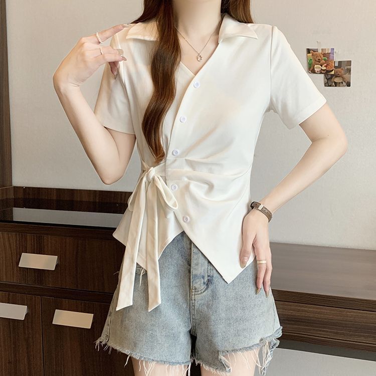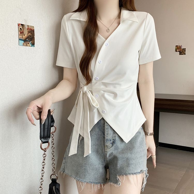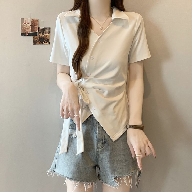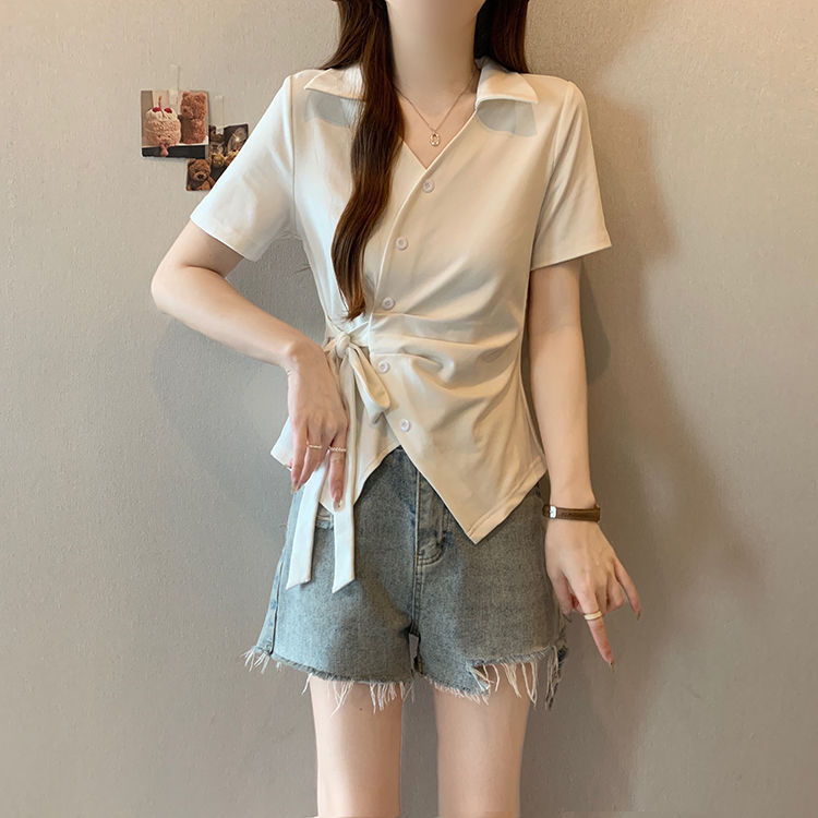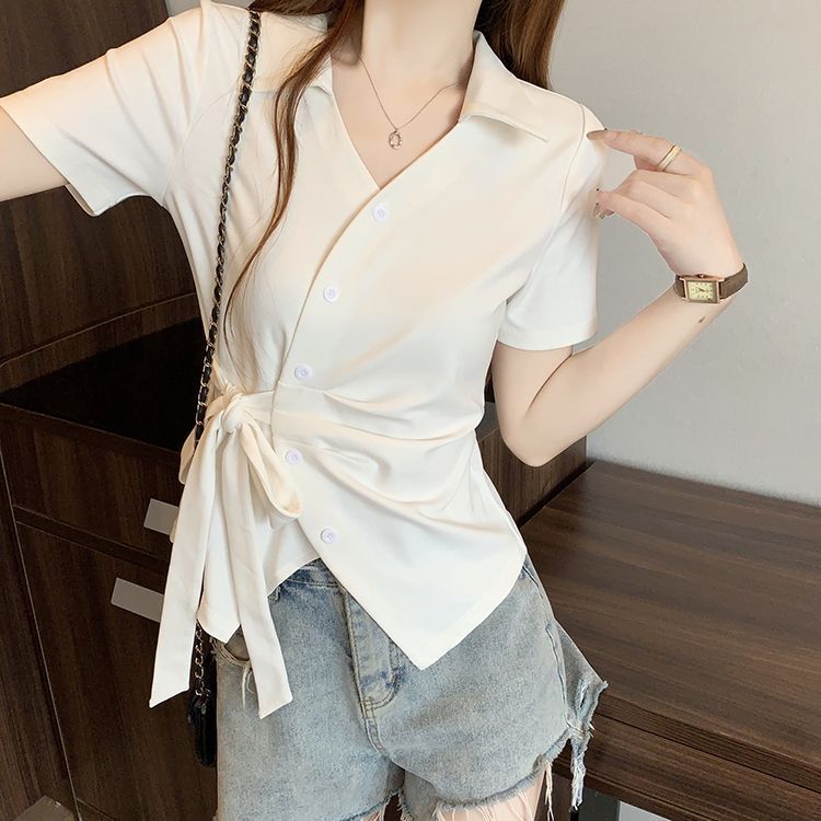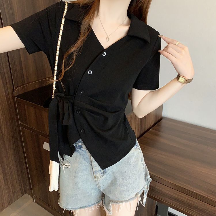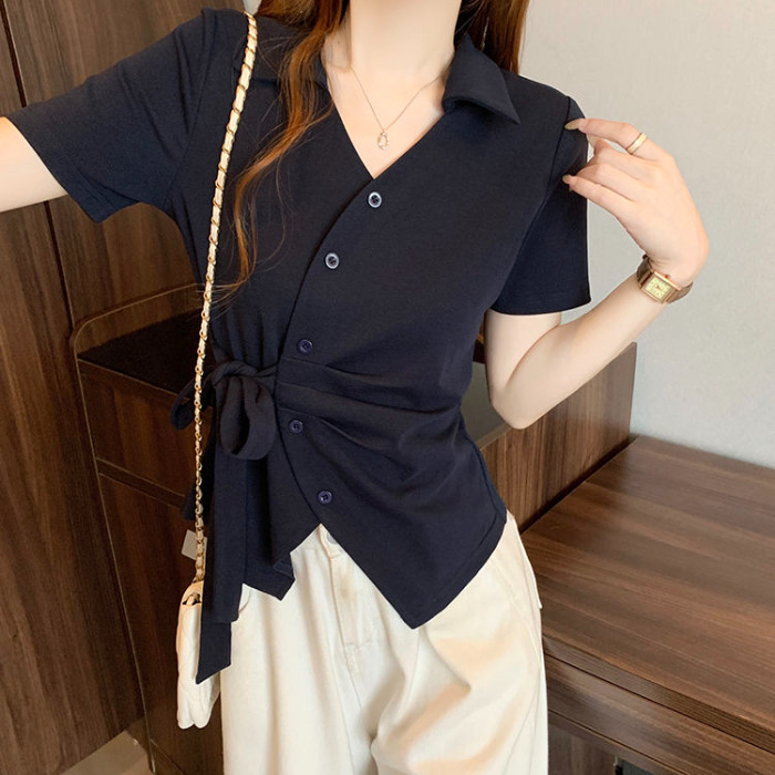 2025 여름 새 스타일 세련되고 세련된 불규칙한 허리 스트랩 반팔 티셔츠 뚱뚱한 여성을위한 플러스 사이즈 슬리밍 탑스토어 가기