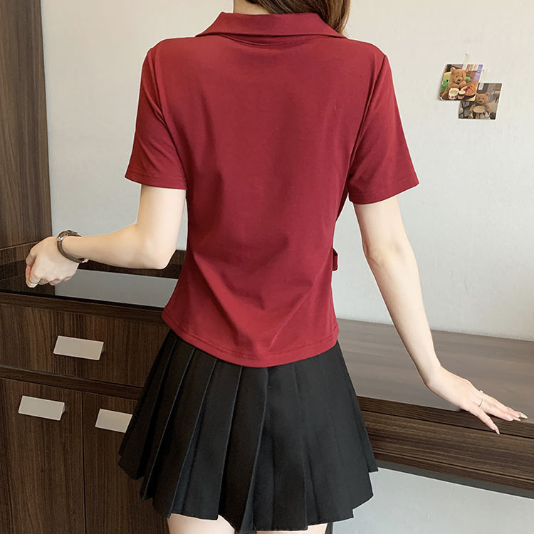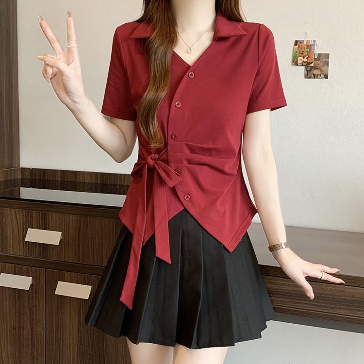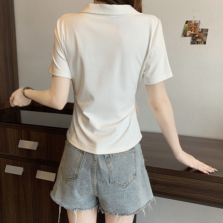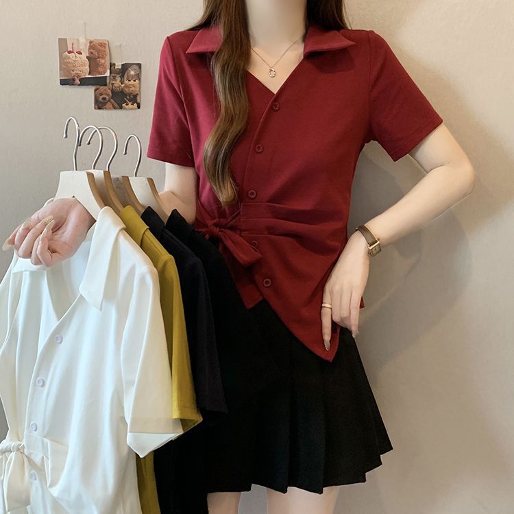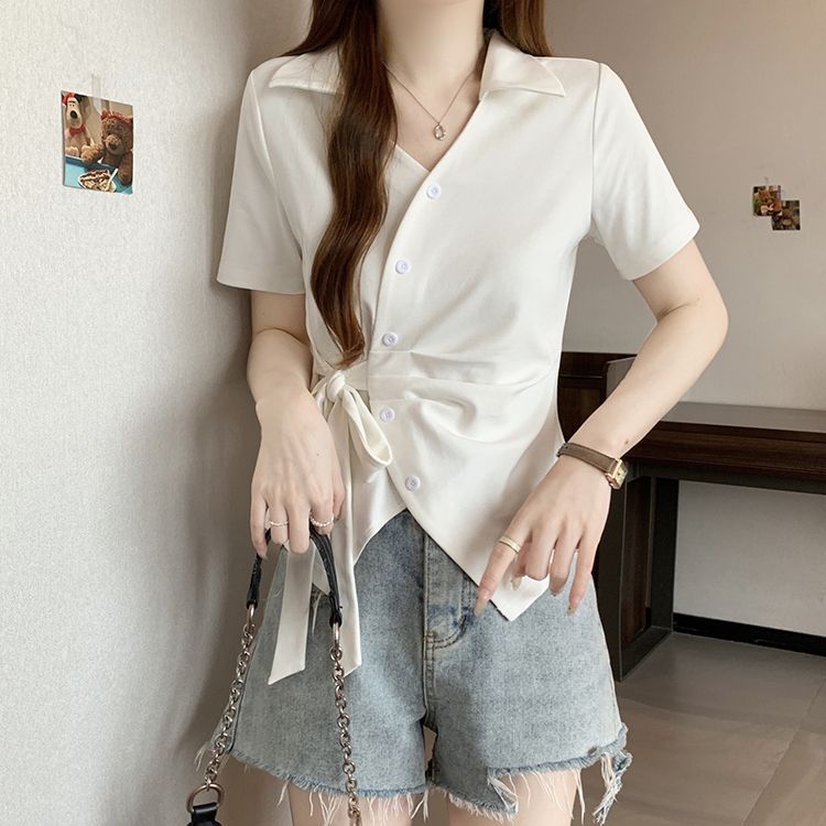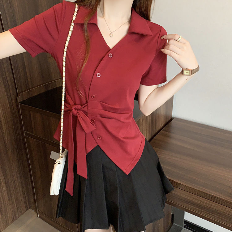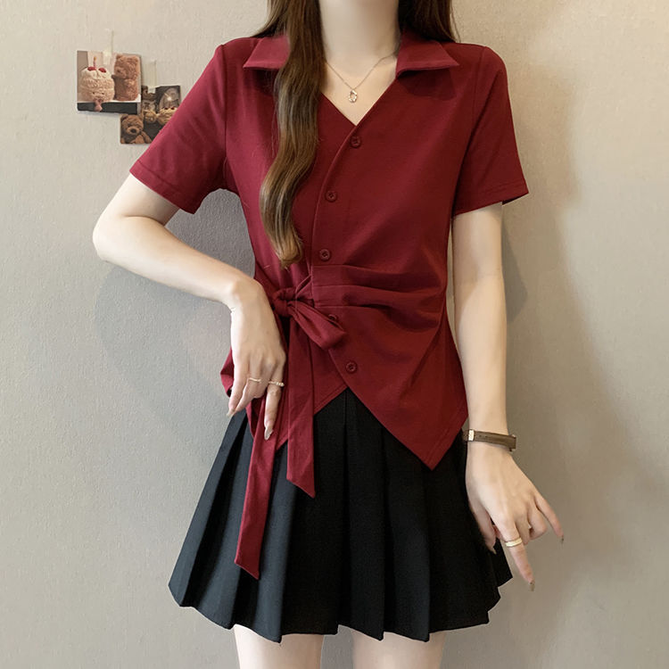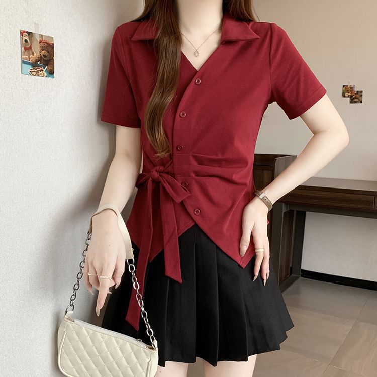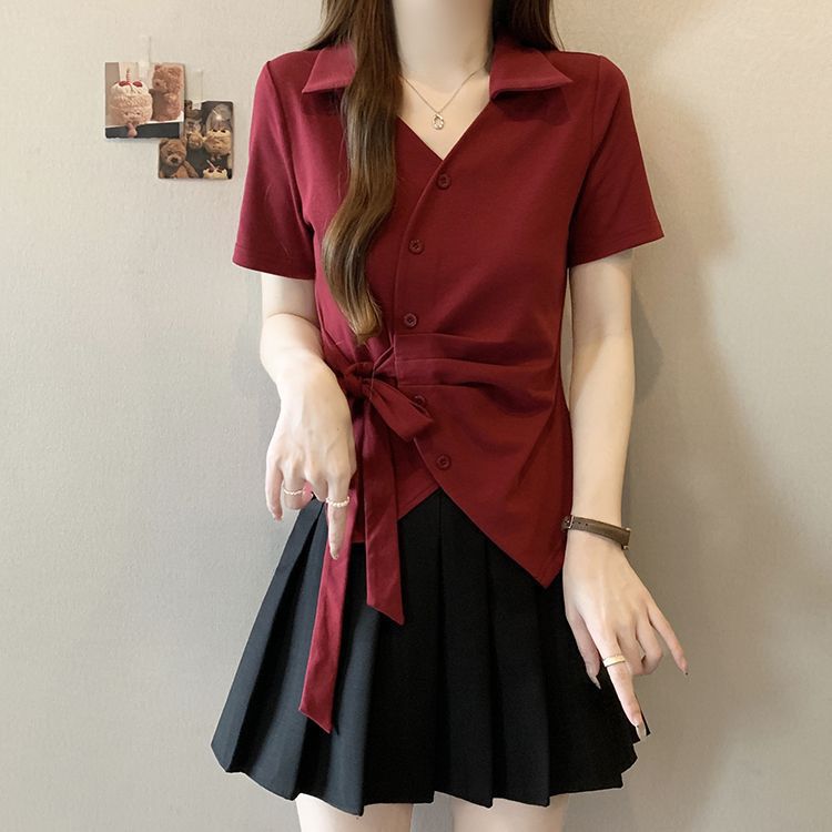 2025 여름 새 스타일 세련되고 세련된 불규칙한 허리 스트랩 반팔 티셔츠 뚱뚱한 여성을위한 플러스 사이즈 슬리밍 탑스토어 가기