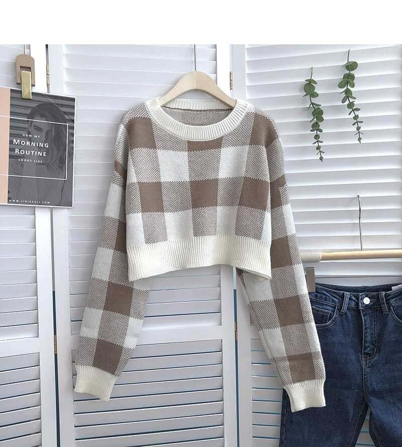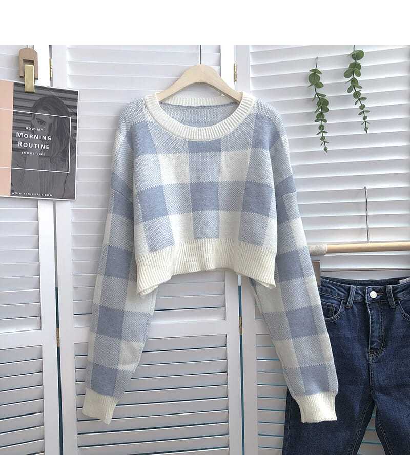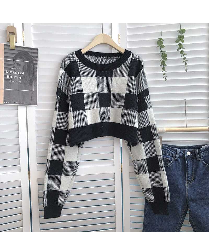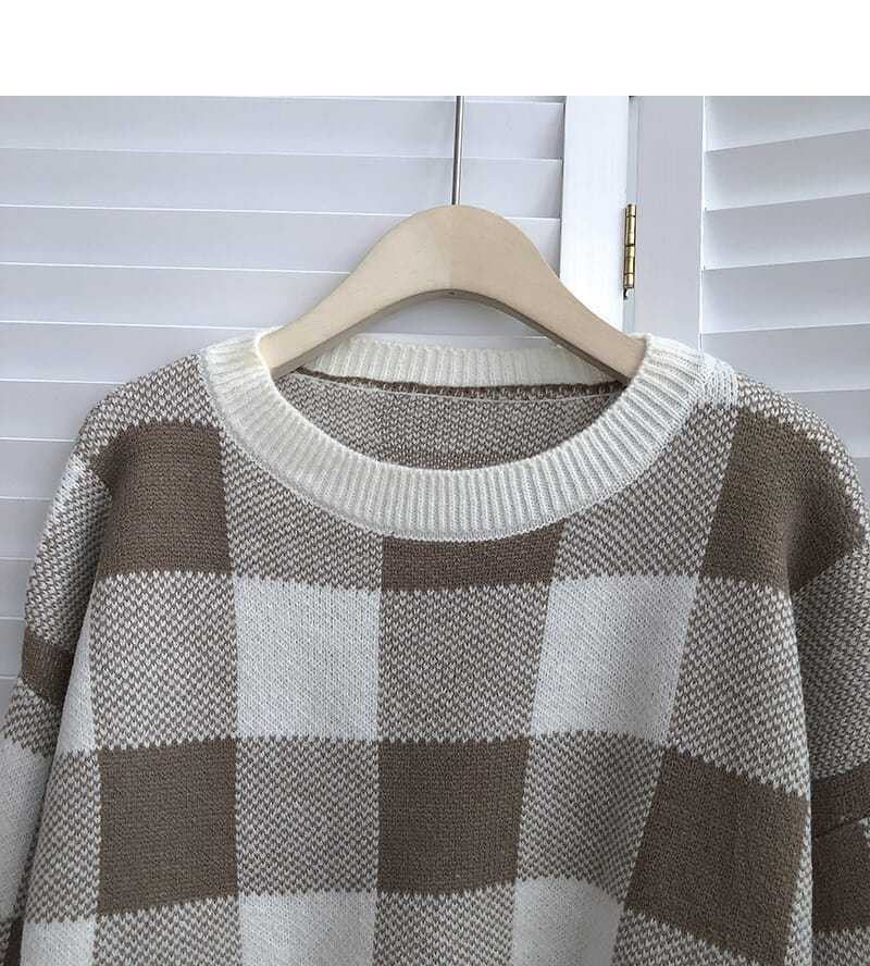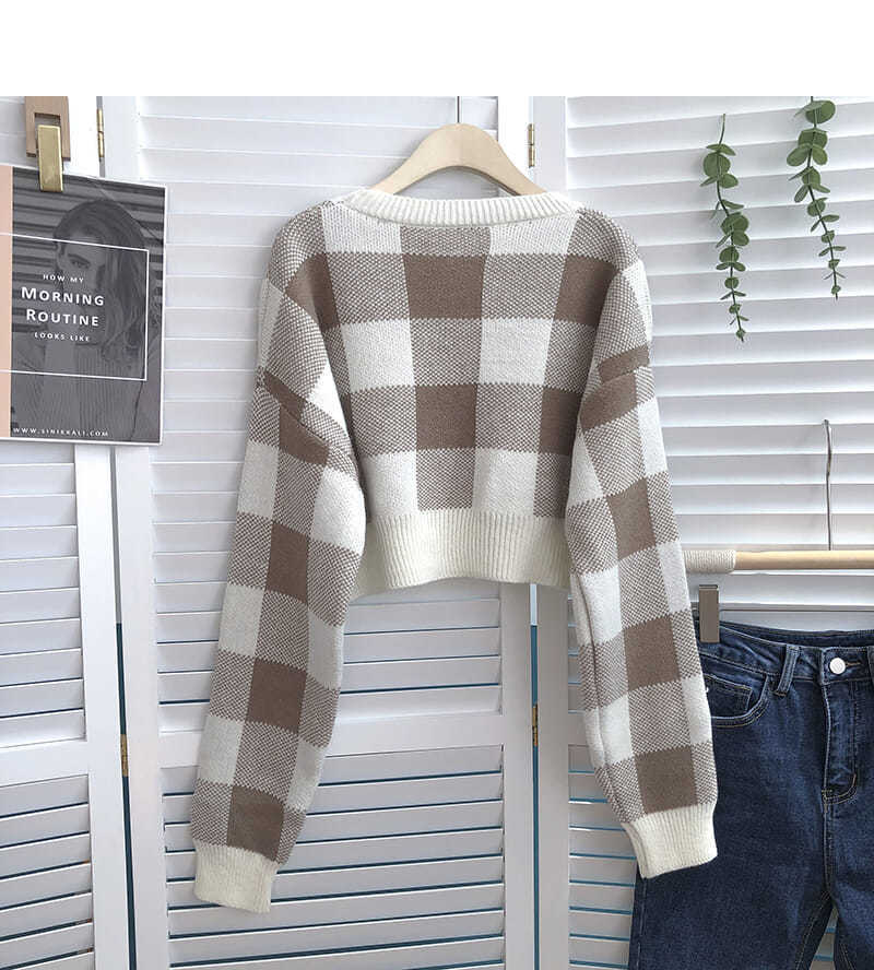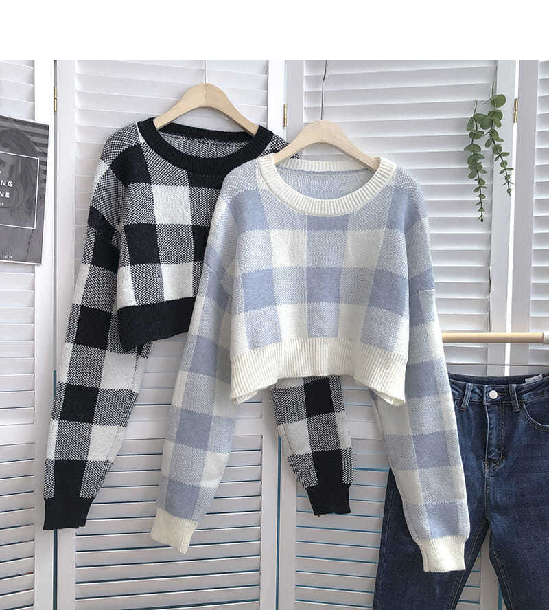 여성을위한 대형 격자 무늬 대비 색상 라운드 넥 짧은 긴팔 스웨터 2025 가을, 겨울 한국 스타일 다목적 풀오버 슬리밍 스웨터스토어 가기