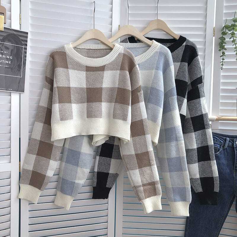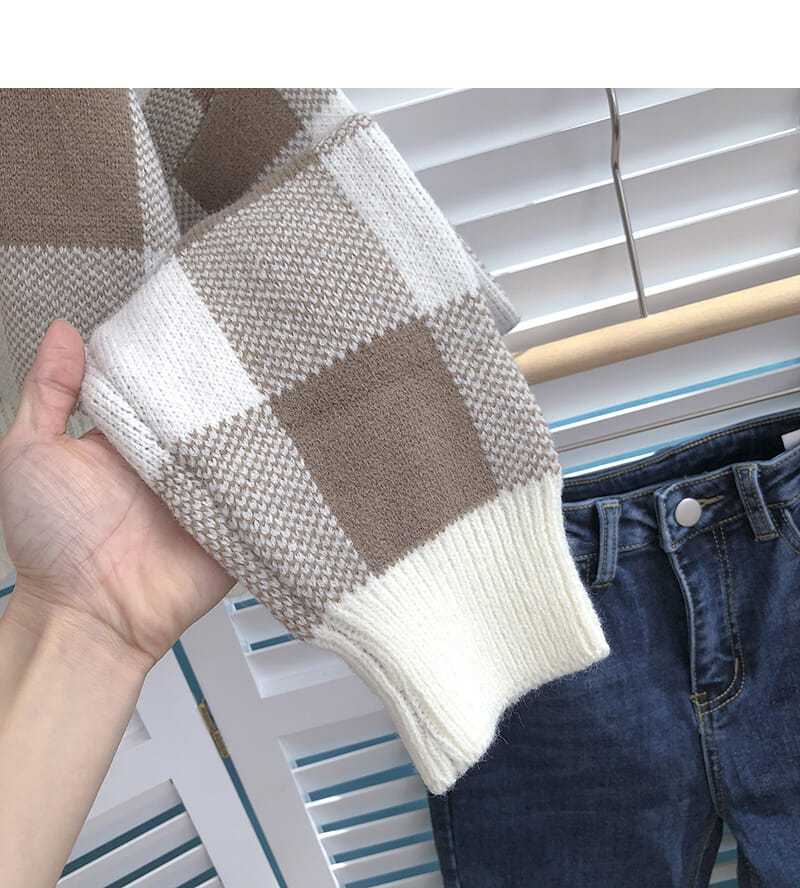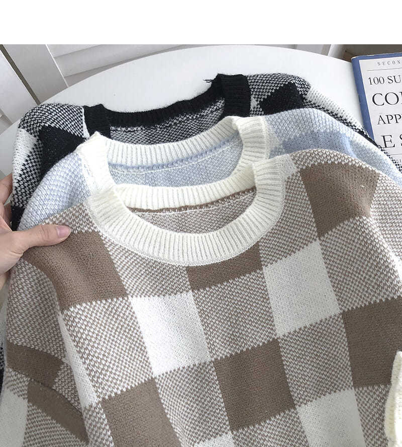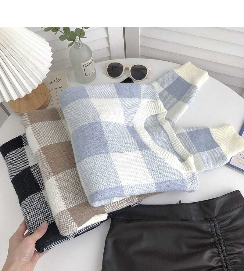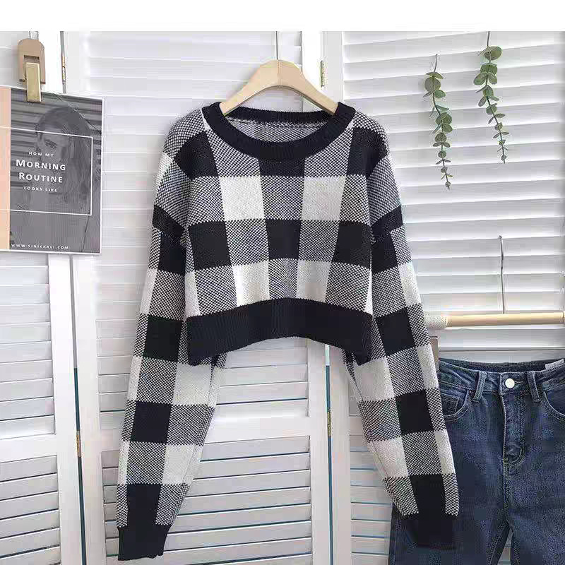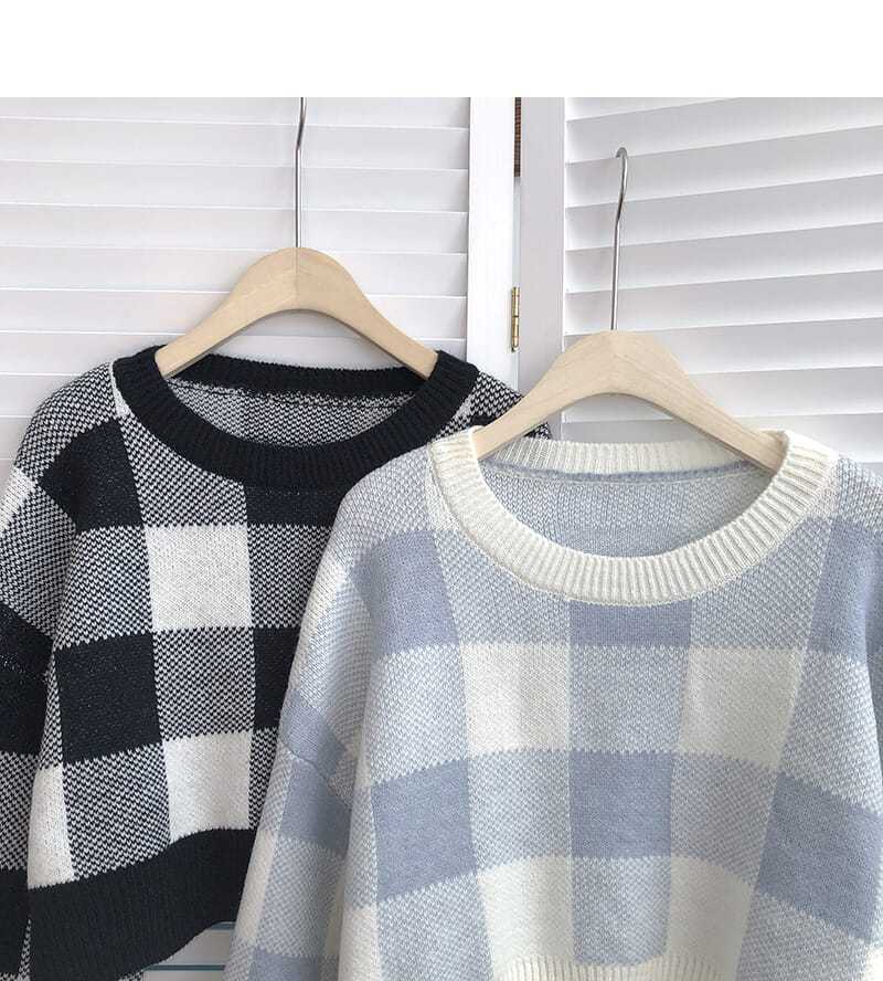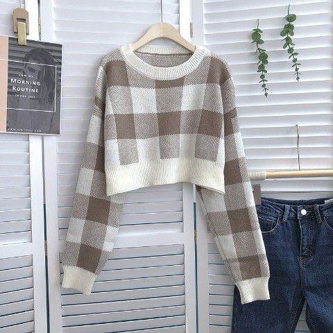 여성을위한 대형 격자 무늬 대비 색상 라운드 넥 짧은 긴팔 스웨터 2025 가을, 겨울 한국 스타일 다목적 풀오버 슬리밍 스웨터스토어 가기