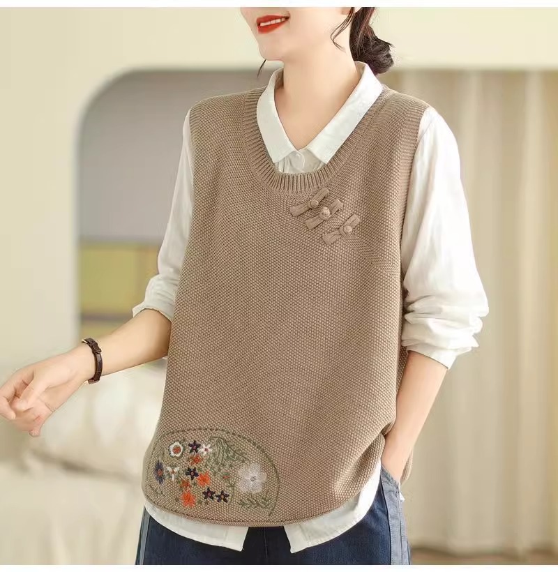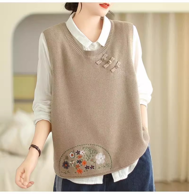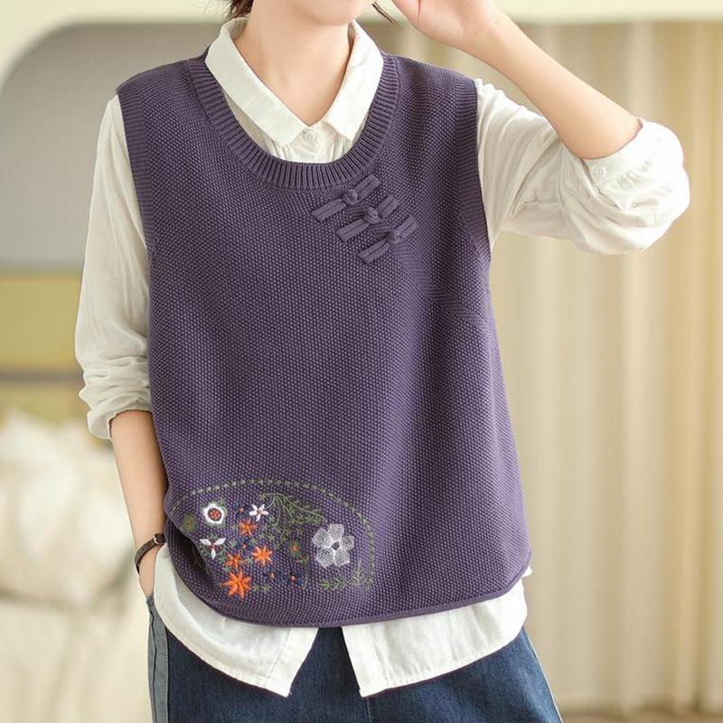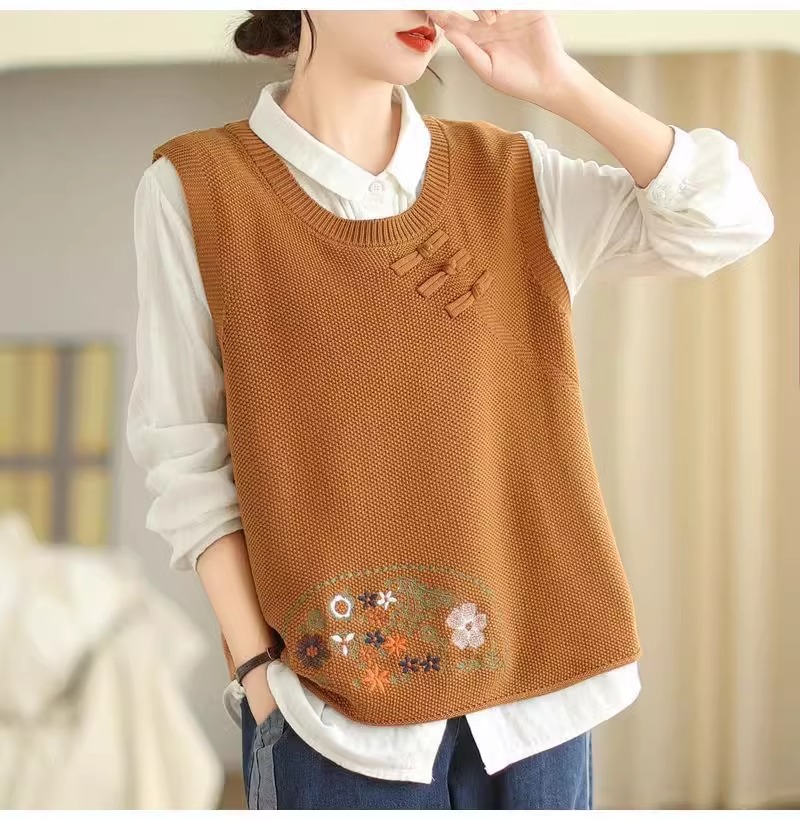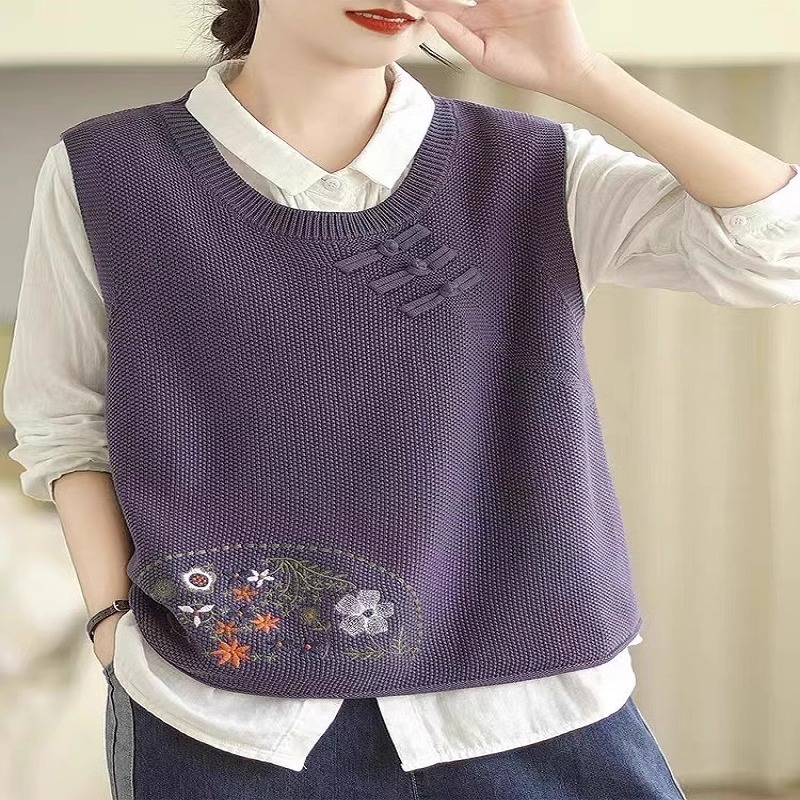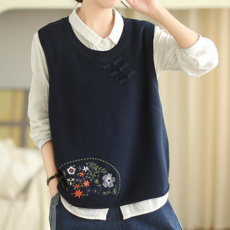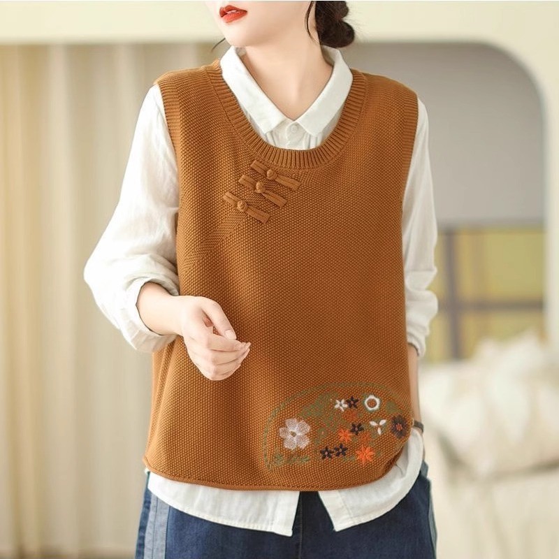 2025 가을 니트 조끼 솔리드 컬러 민소매 풀오버 여성 복고풍 자수 라운드 넥 버튼 어깨 탑