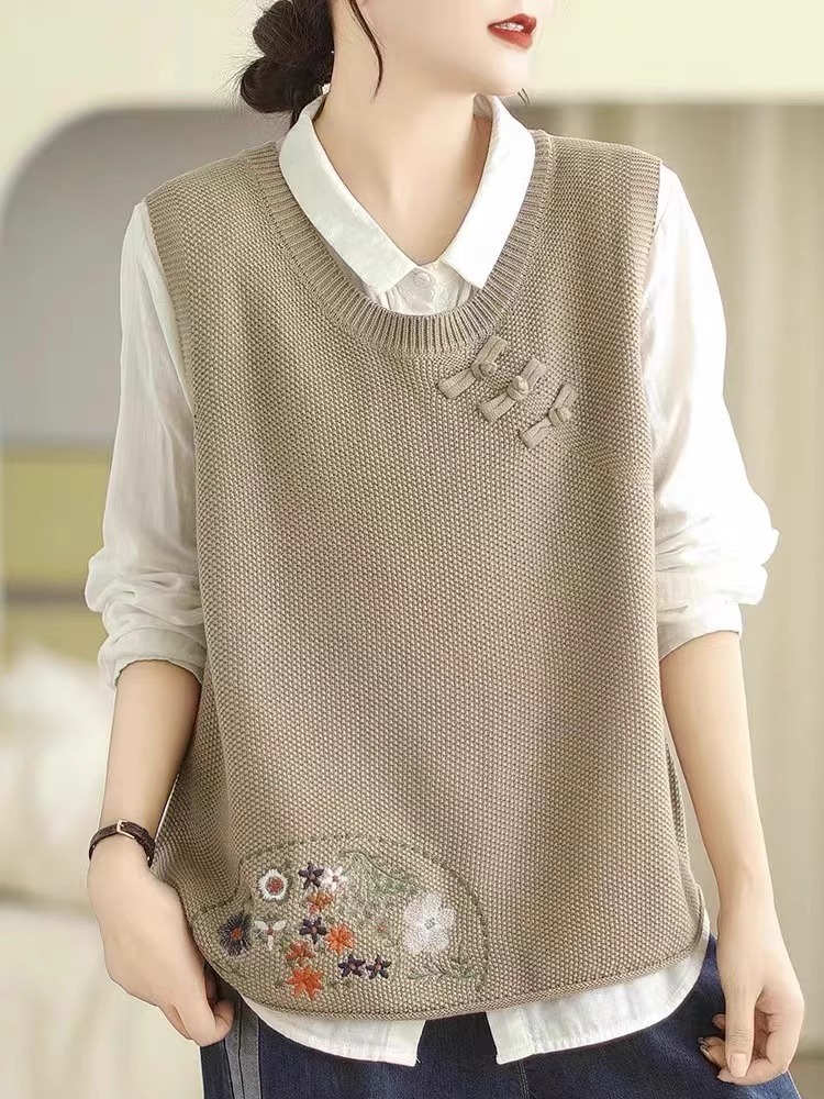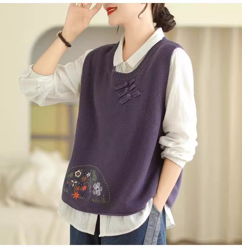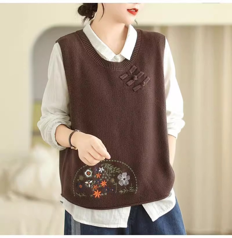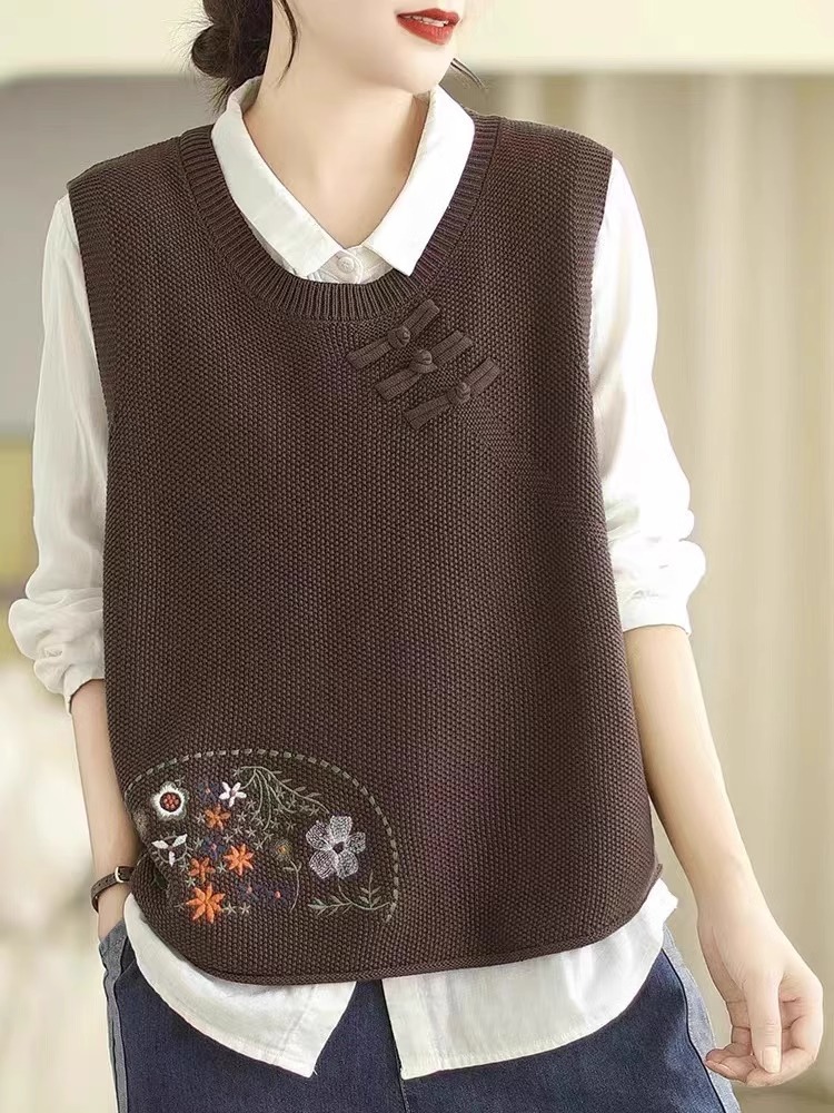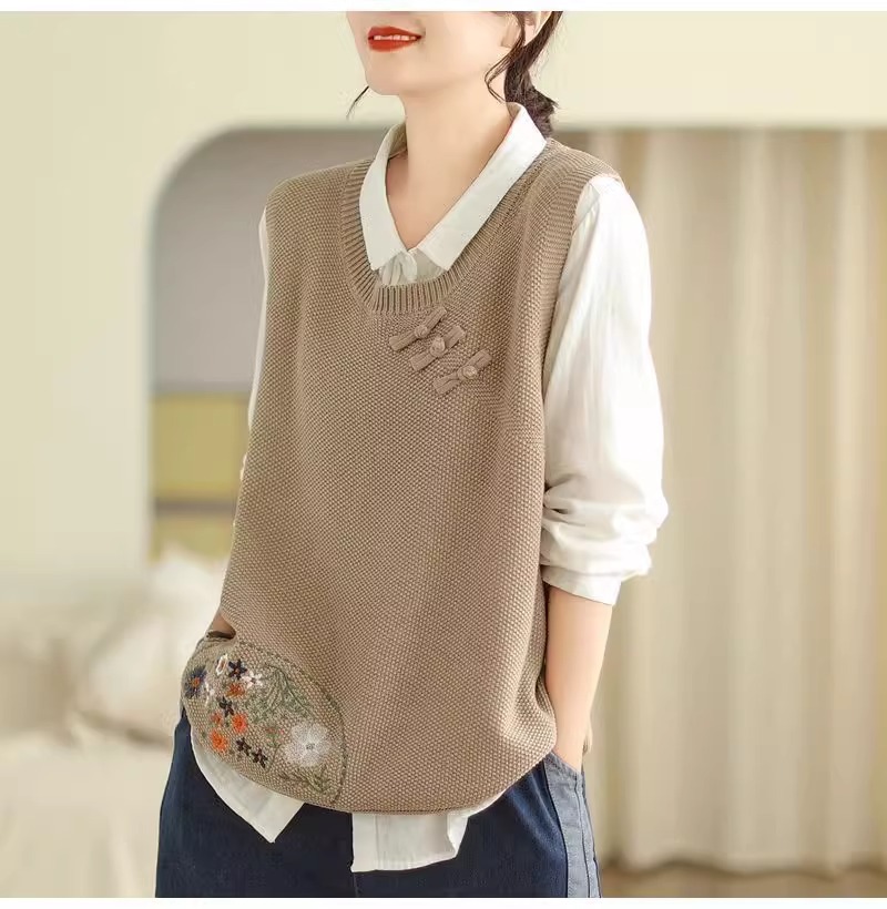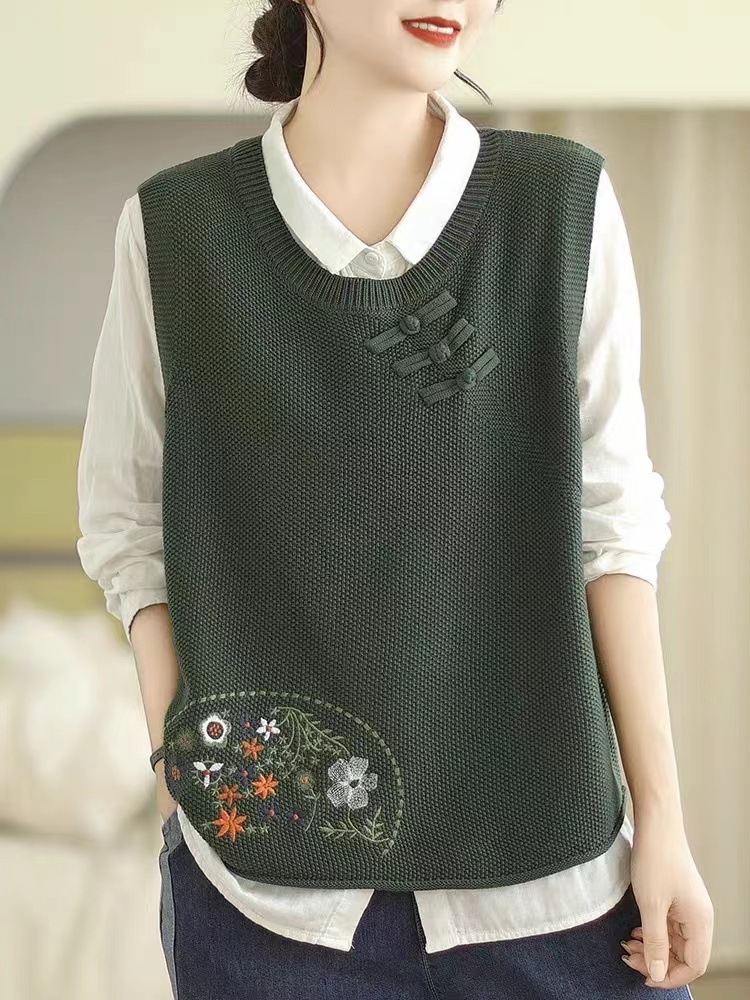2025 가을 니트 조끼 솔리드 컬러 민소매 풀오버 여성 복고풍 자수 라운드 넥 버튼 어깨 탑