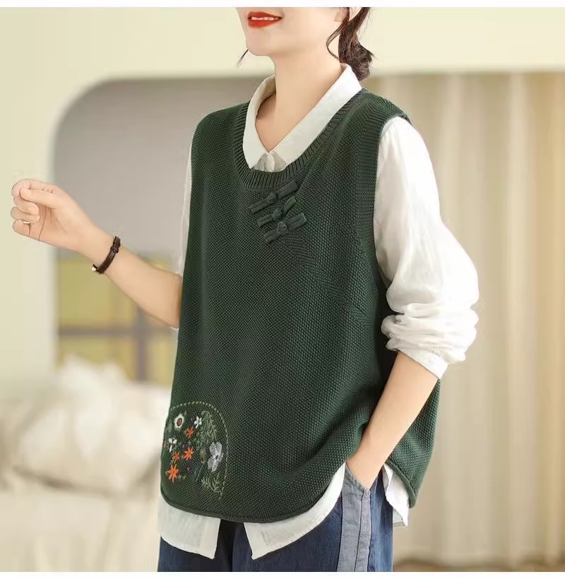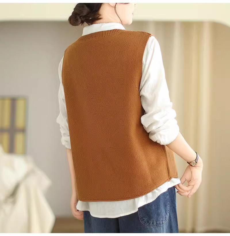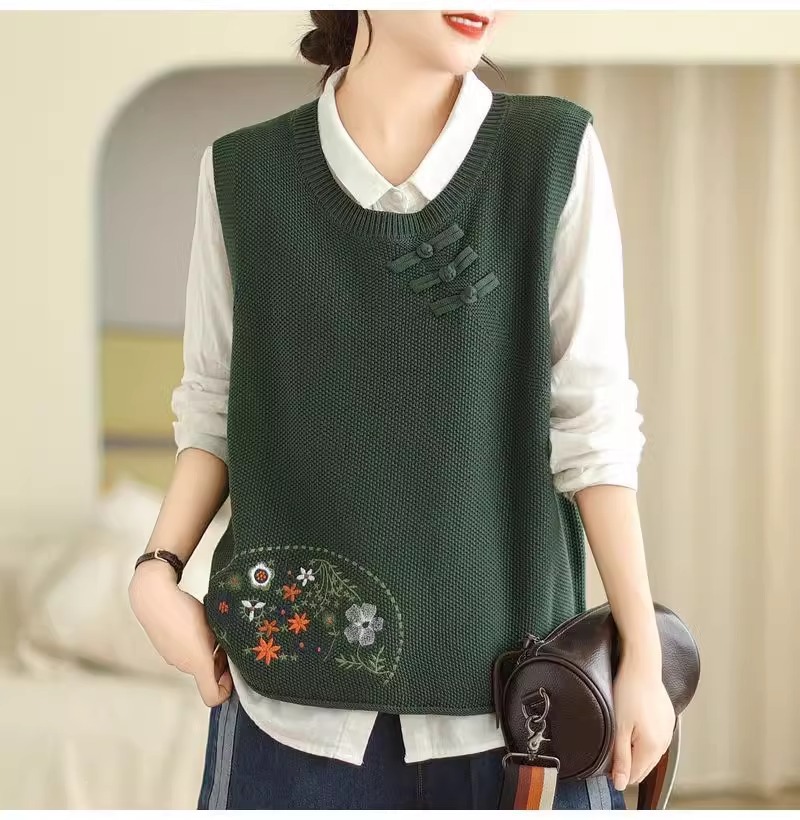 2025 가을 니트 조끼 솔리드 컬러 민소매 풀오버 여성 복고풍 자수 라운드 넥 버튼 어깨 탑스토어 가기
