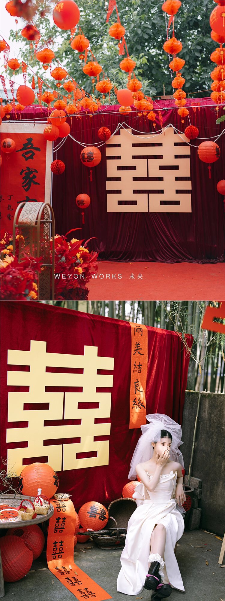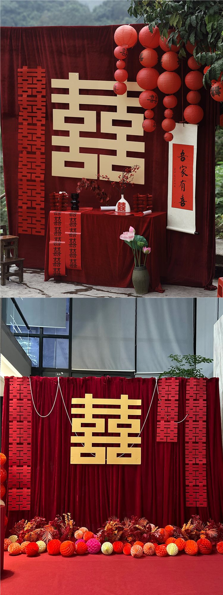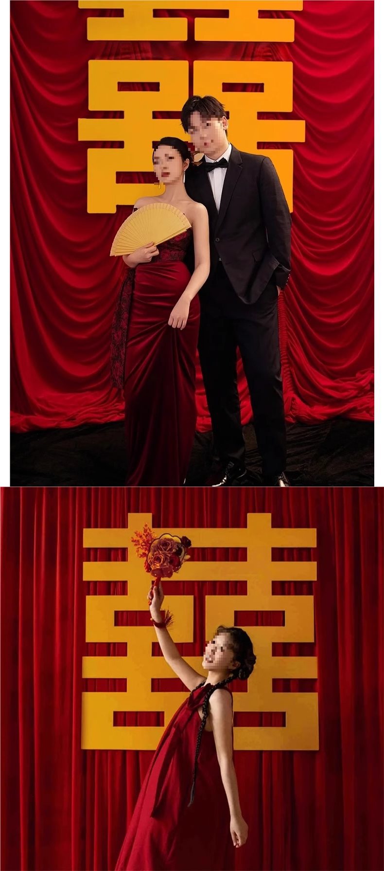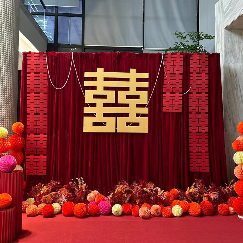 황금색 행복한 단어와 부르고뉴 컬러의 커튼이 있는 중국식 약혼 연회 장식, 웨딩 사진 배경, 농촌 안뜰 장식