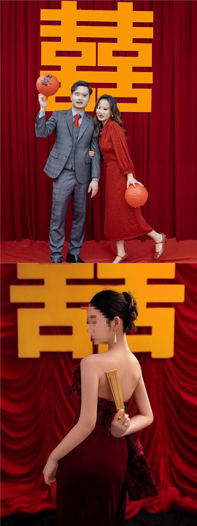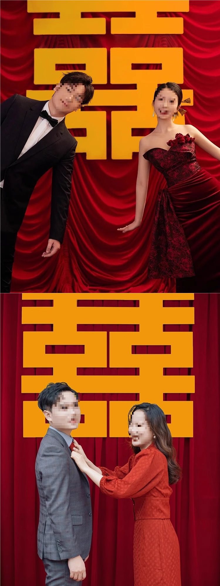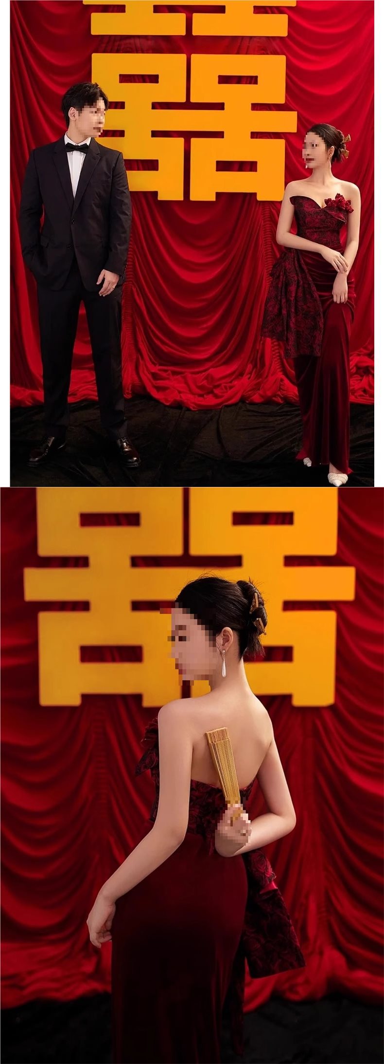 황금색 행복한 단어와 부르고뉴 컬러의 커튼이 있는 중국식 약혼 연회 장식, 웨딩 사진 배경, 농촌 안뜰 장식