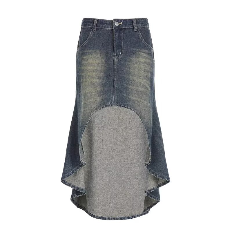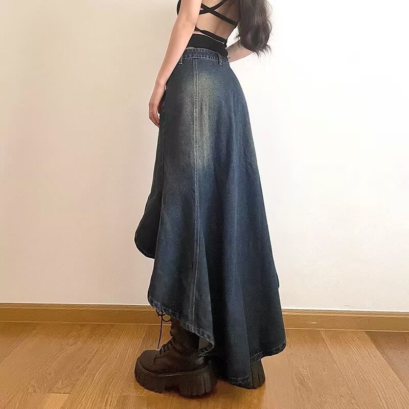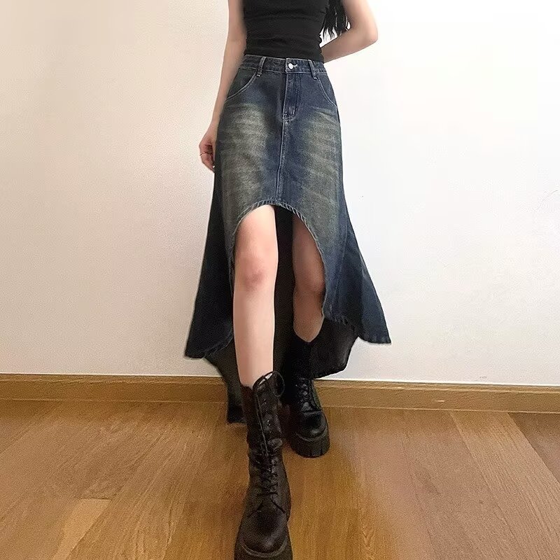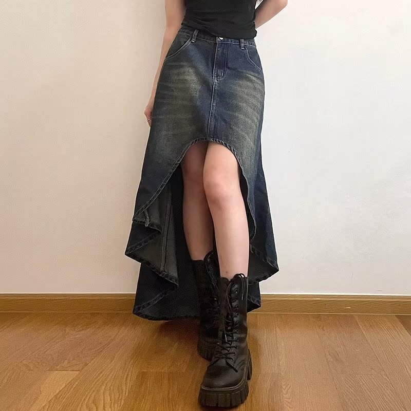 아메리칸 스트리트 핫걸 A라인 데님 스커트 여성 여름 하이웨이스트 워싱 디스트레스드 디자인 불규칙한 하프 스커트