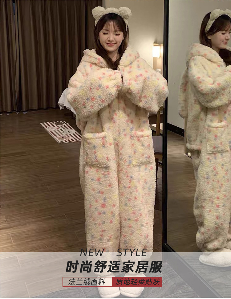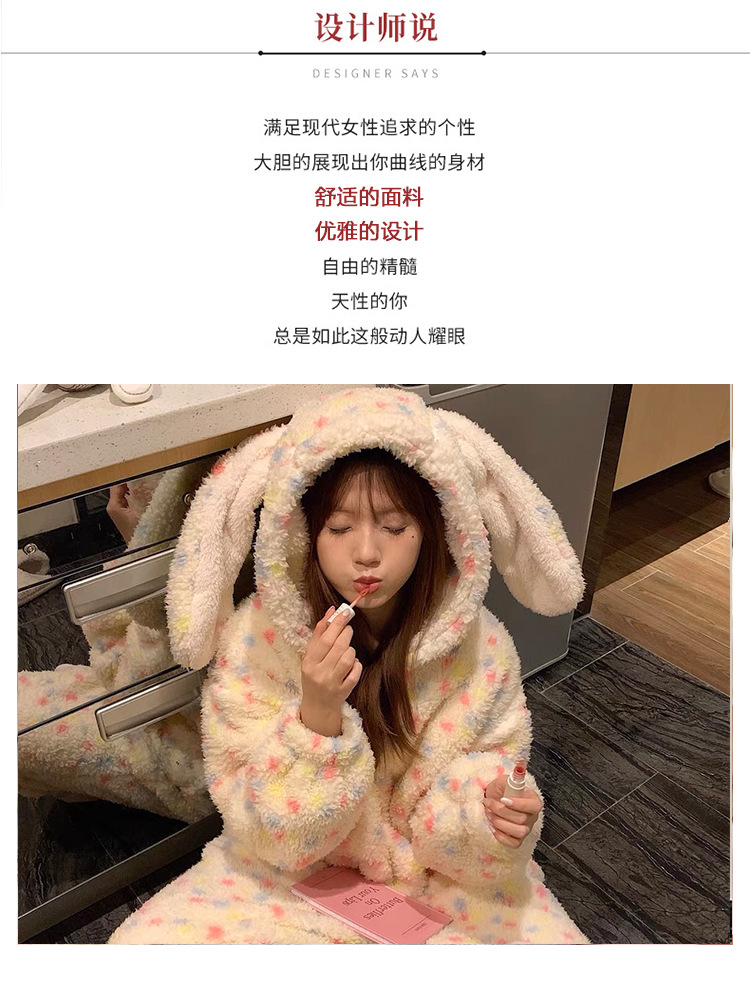 여성을위한 귀여운 토끼 귀 산호 벨벳 원피스 잠옷 겨울 벨벳 두꺼운 달콤한 가정 의류 2025 새로운 겨울