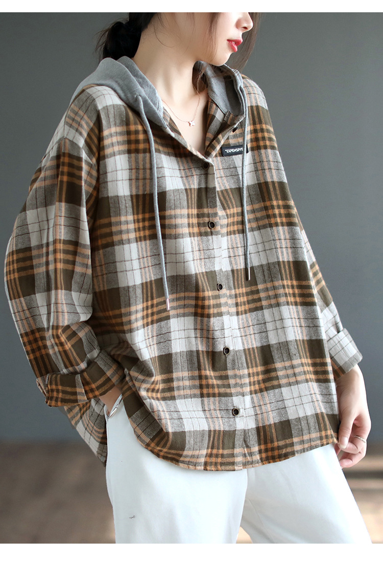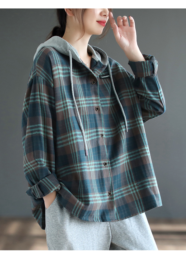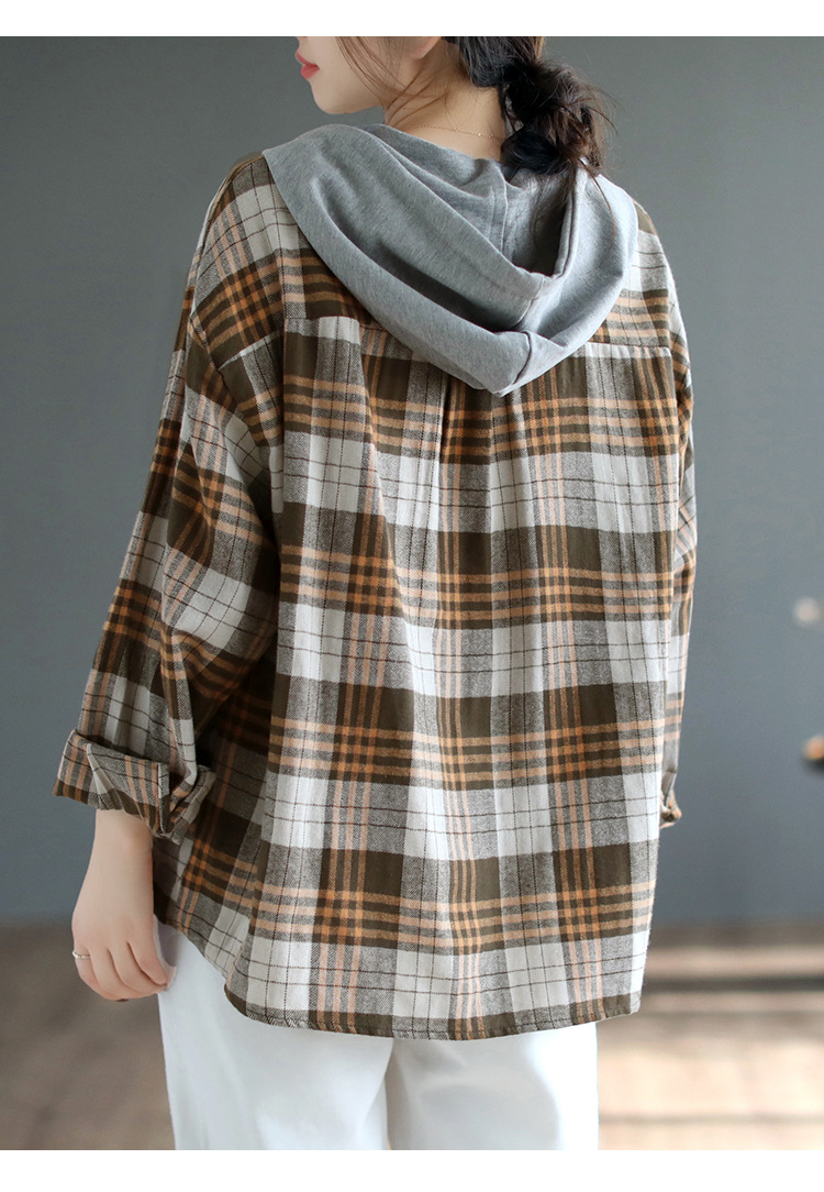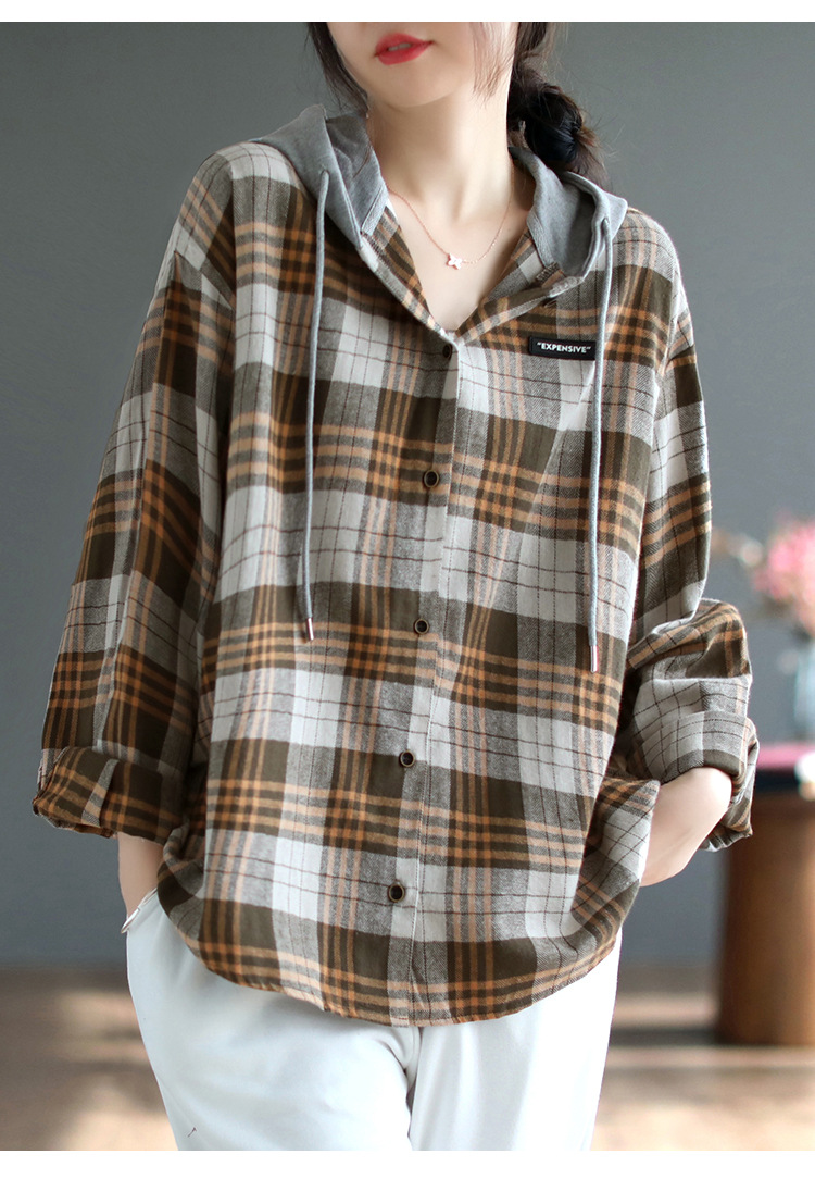 가을 싱글 브레스트 격자 무늬 얇은 기모 긴팔 셔츠 여성 예술적 캐주얼 대형 캐주얼 후드 셔츠