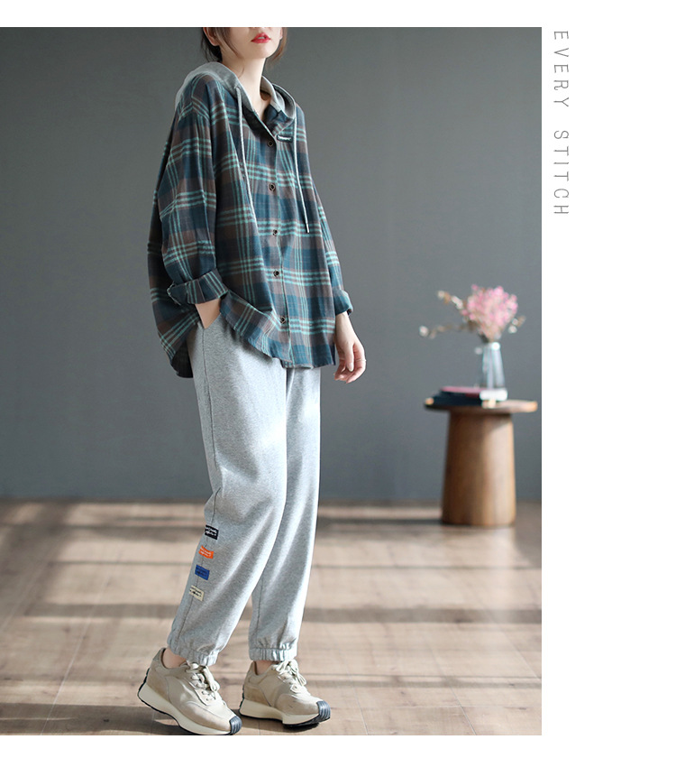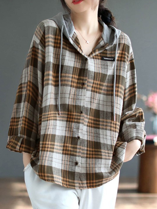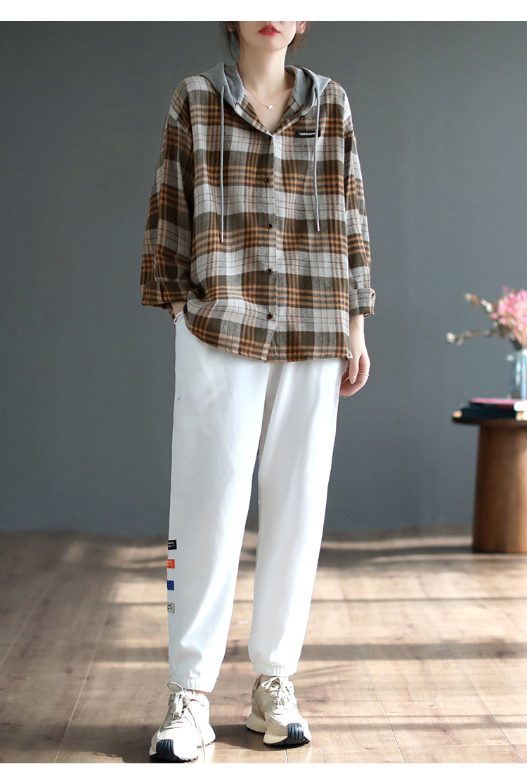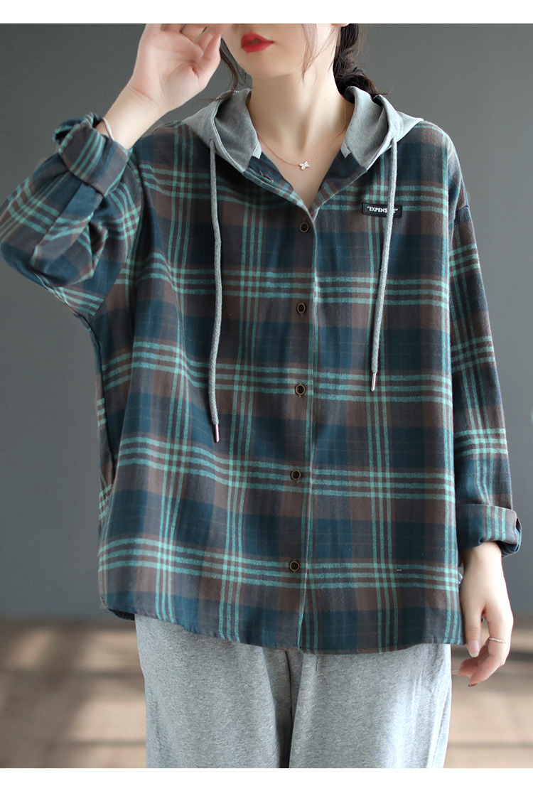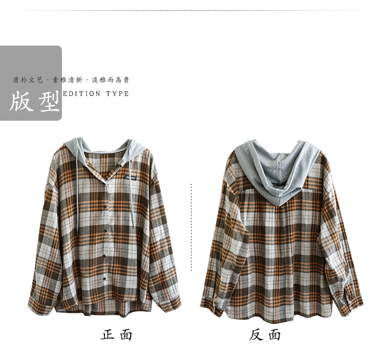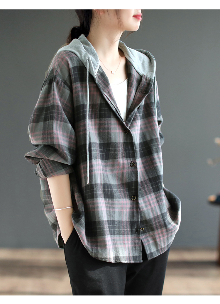 가을 싱글 브레스트 격자 무늬 얇은 기모 긴팔 셔츠 여성 예술적 캐주얼 대형 캐주얼 후드 셔츠