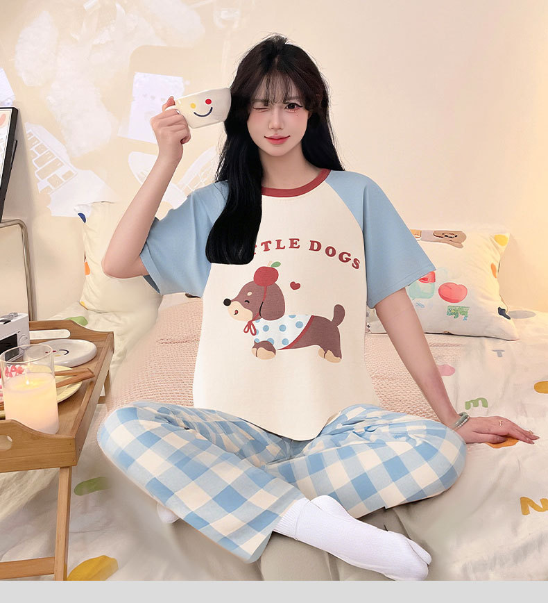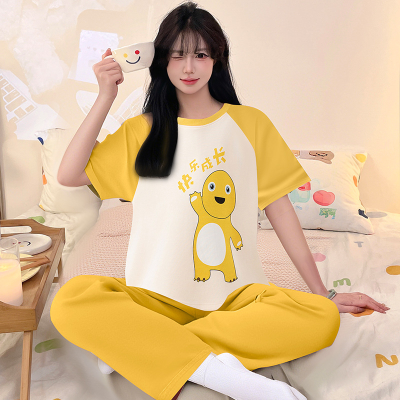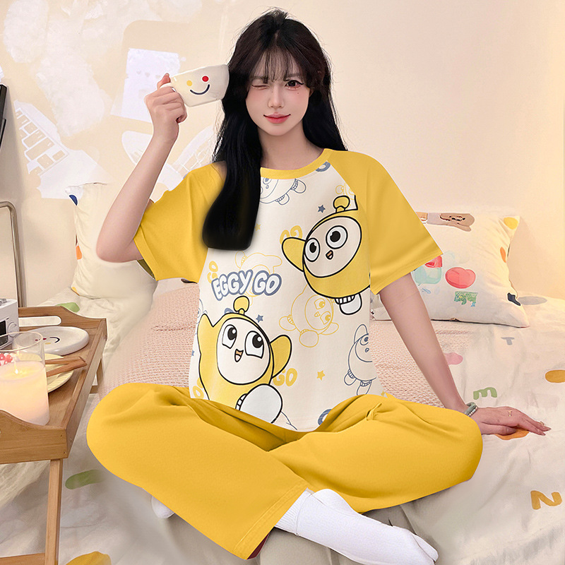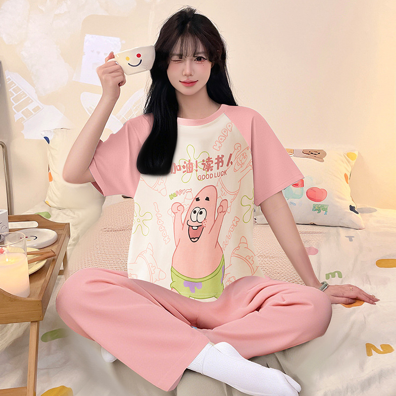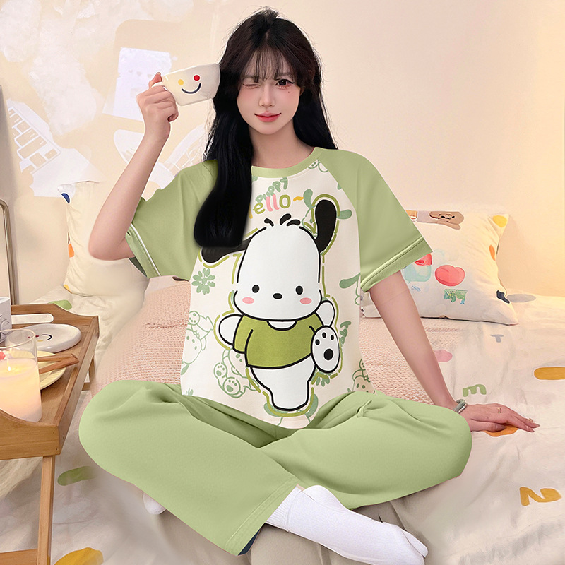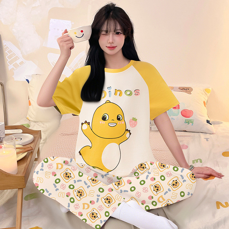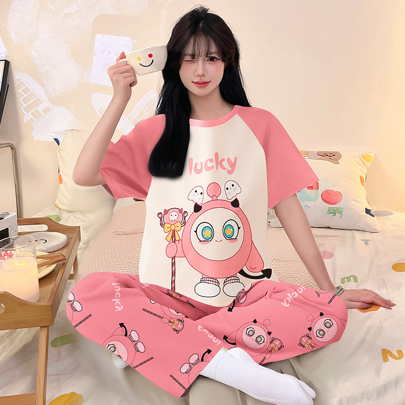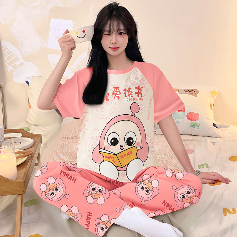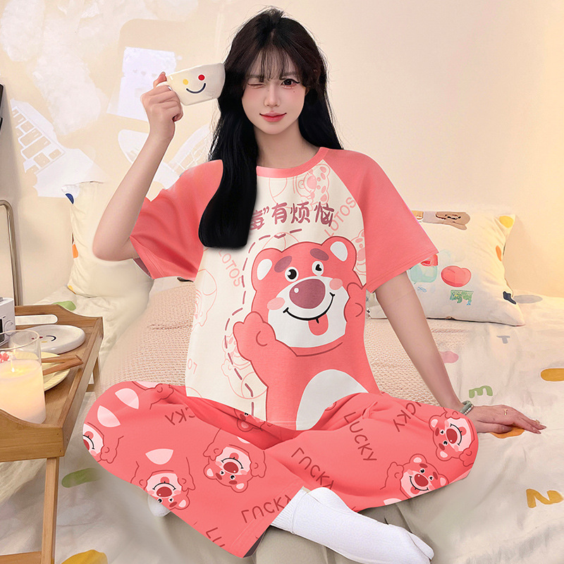 여성을위한 순수 코튼 잠옷 봄과 여름 반팔 바지 만화 소녀 18 세 중학생 큰 소녀 느슨한 가정 옷스토어 가기