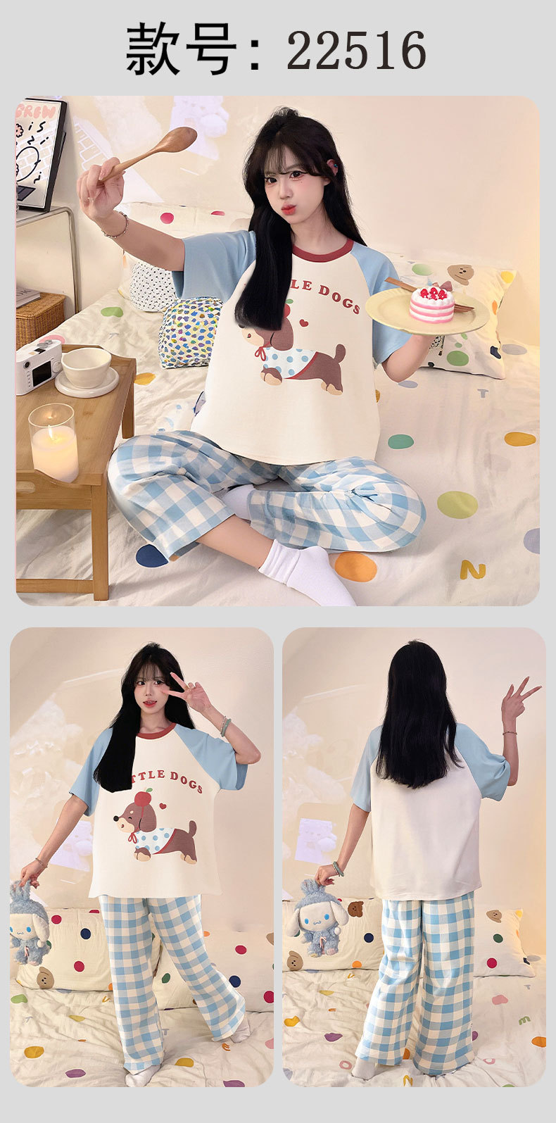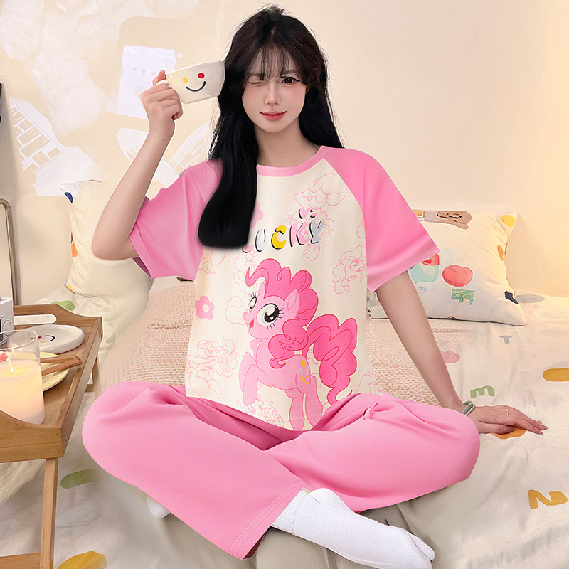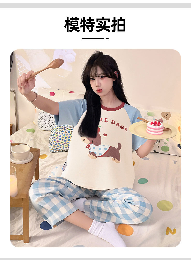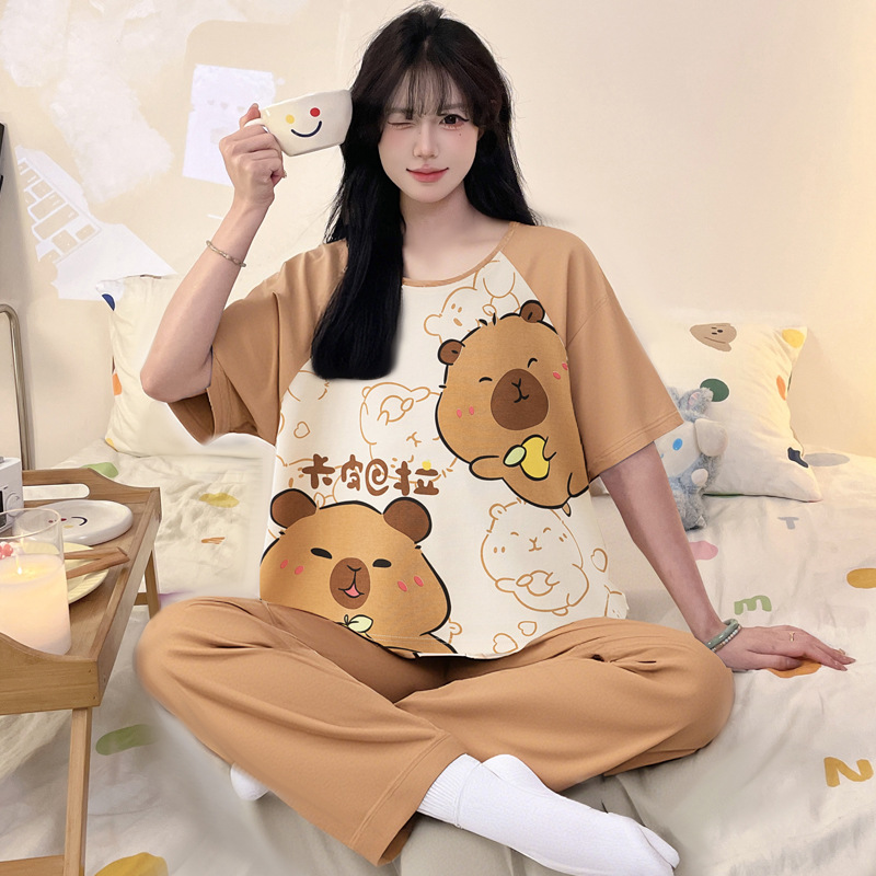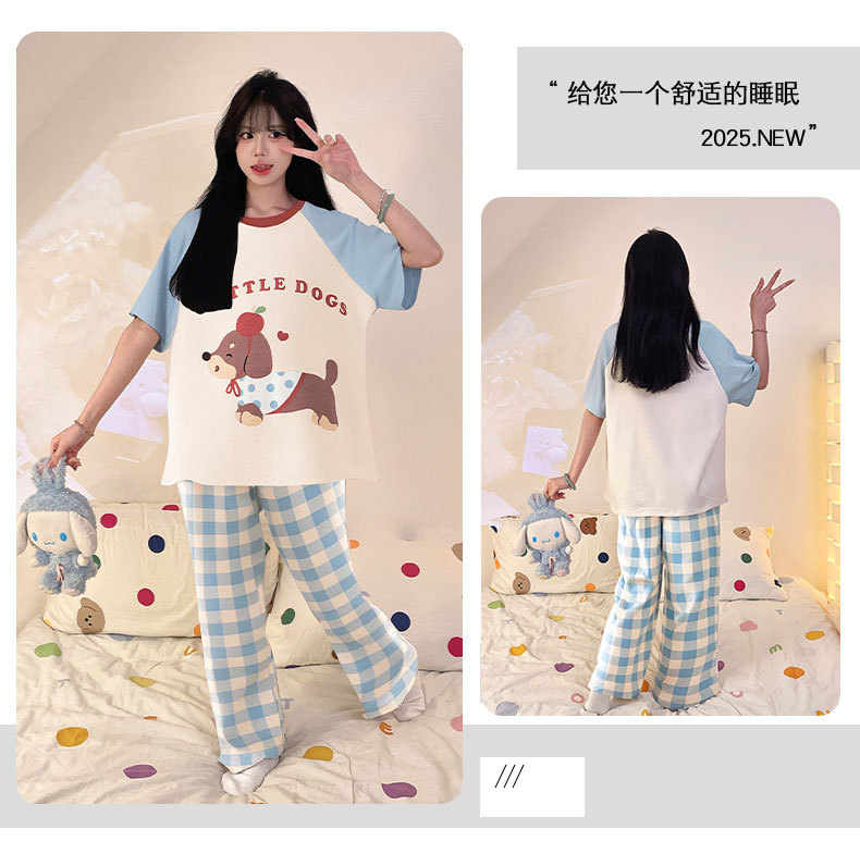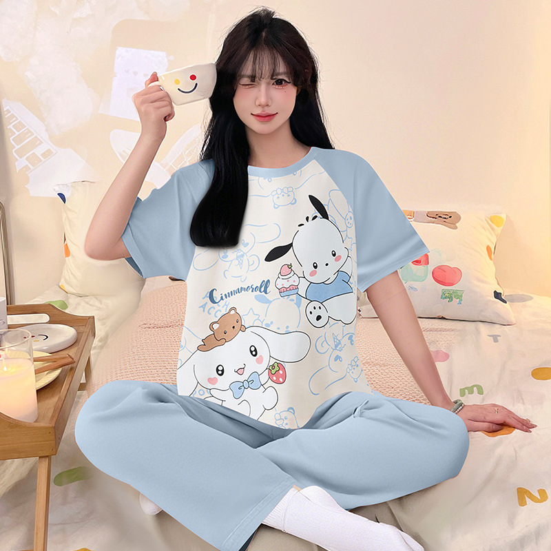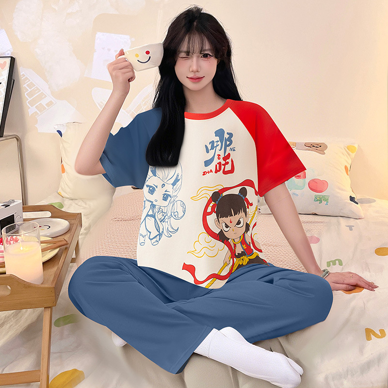 여성을위한 순수 코튼 잠옷 봄과 여름 반팔 바지 만화 소녀 18 세 중학생 큰 소녀 느슨한 가정 옷스토어 가기