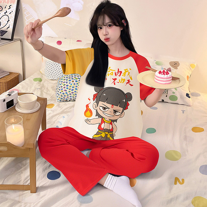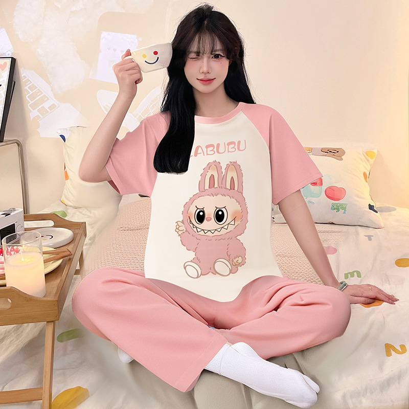 여성을위한 순수 코튼 잠옷 봄과 여름 반팔 바지 만화 소녀 18 세 중학생 큰 소녀 느슨한 가정 옷