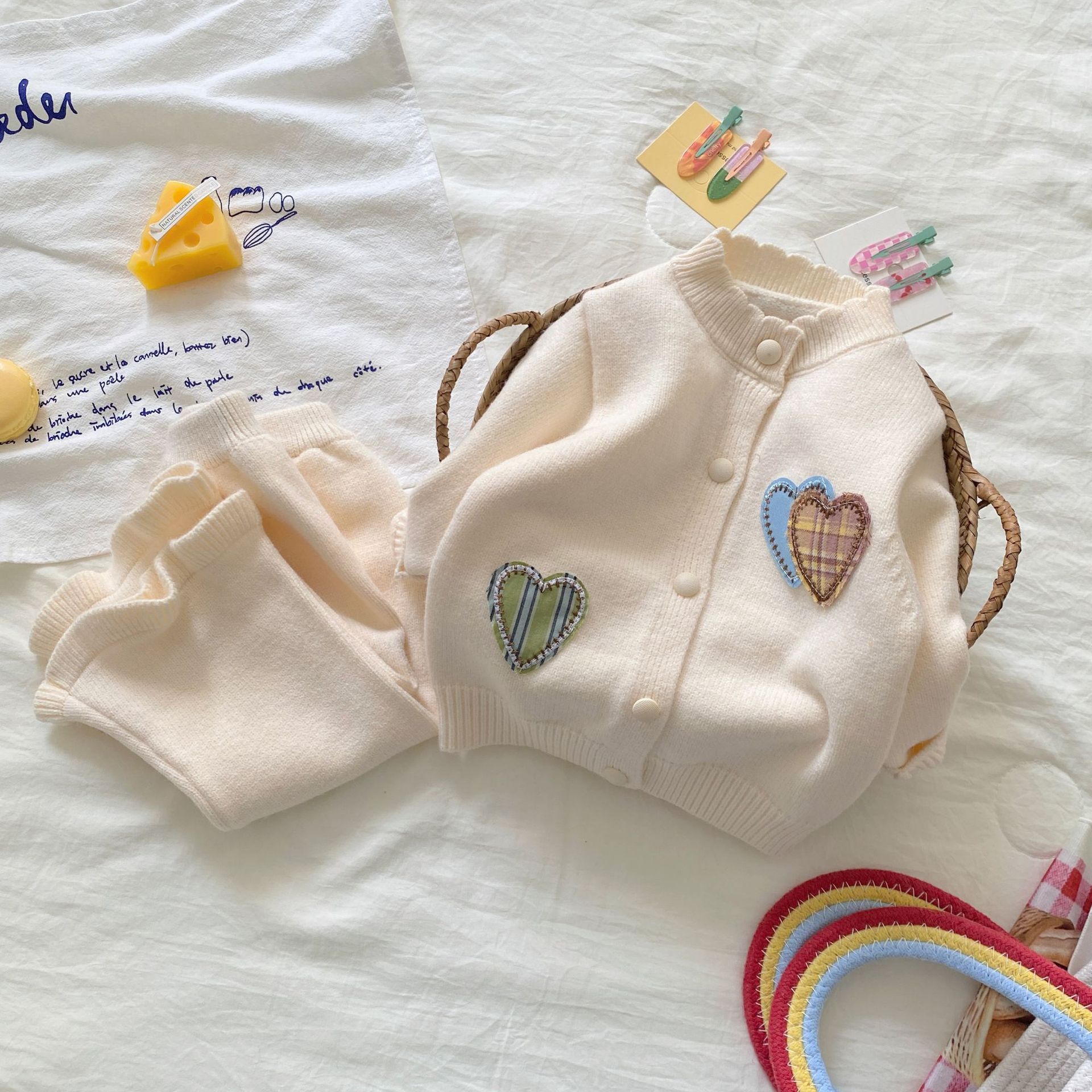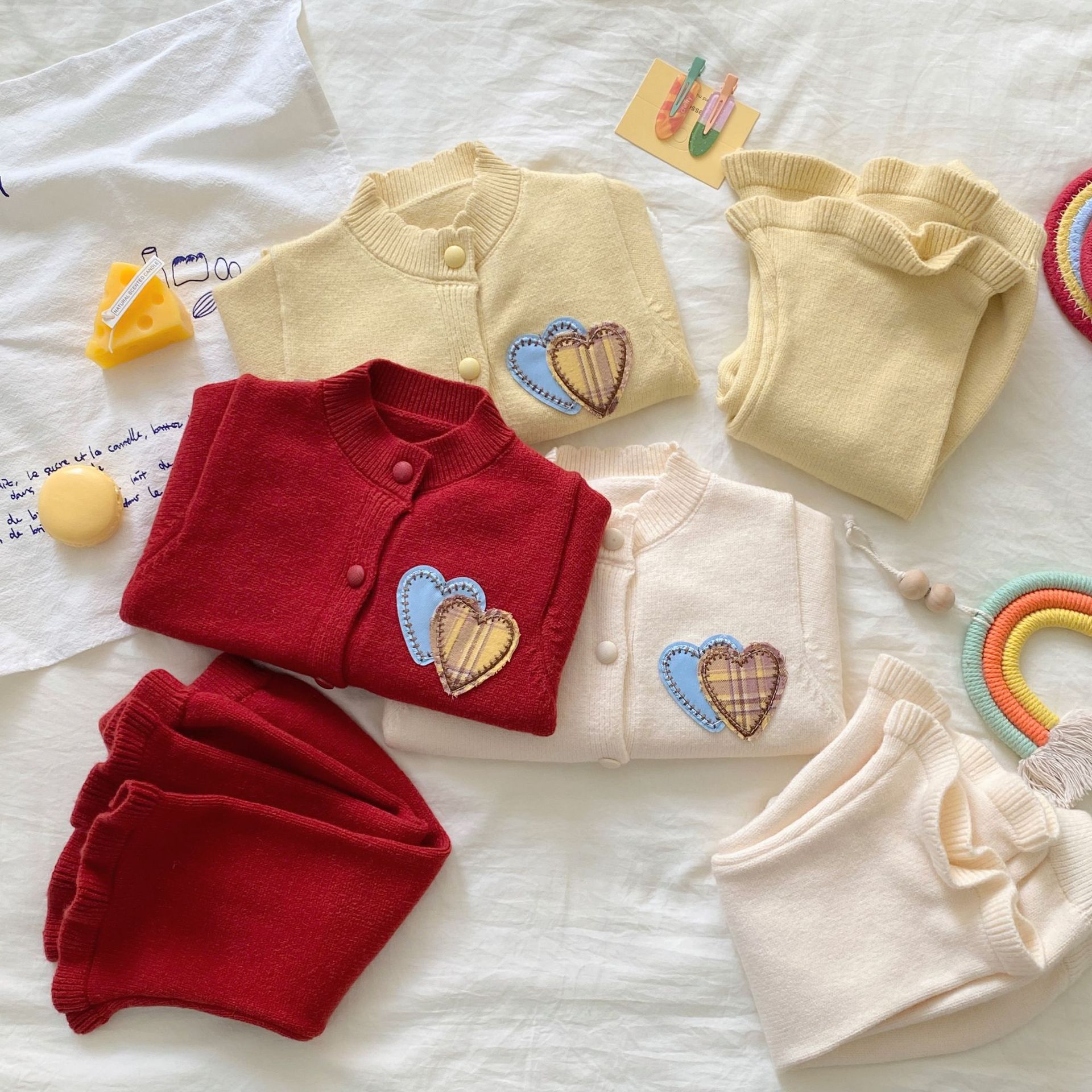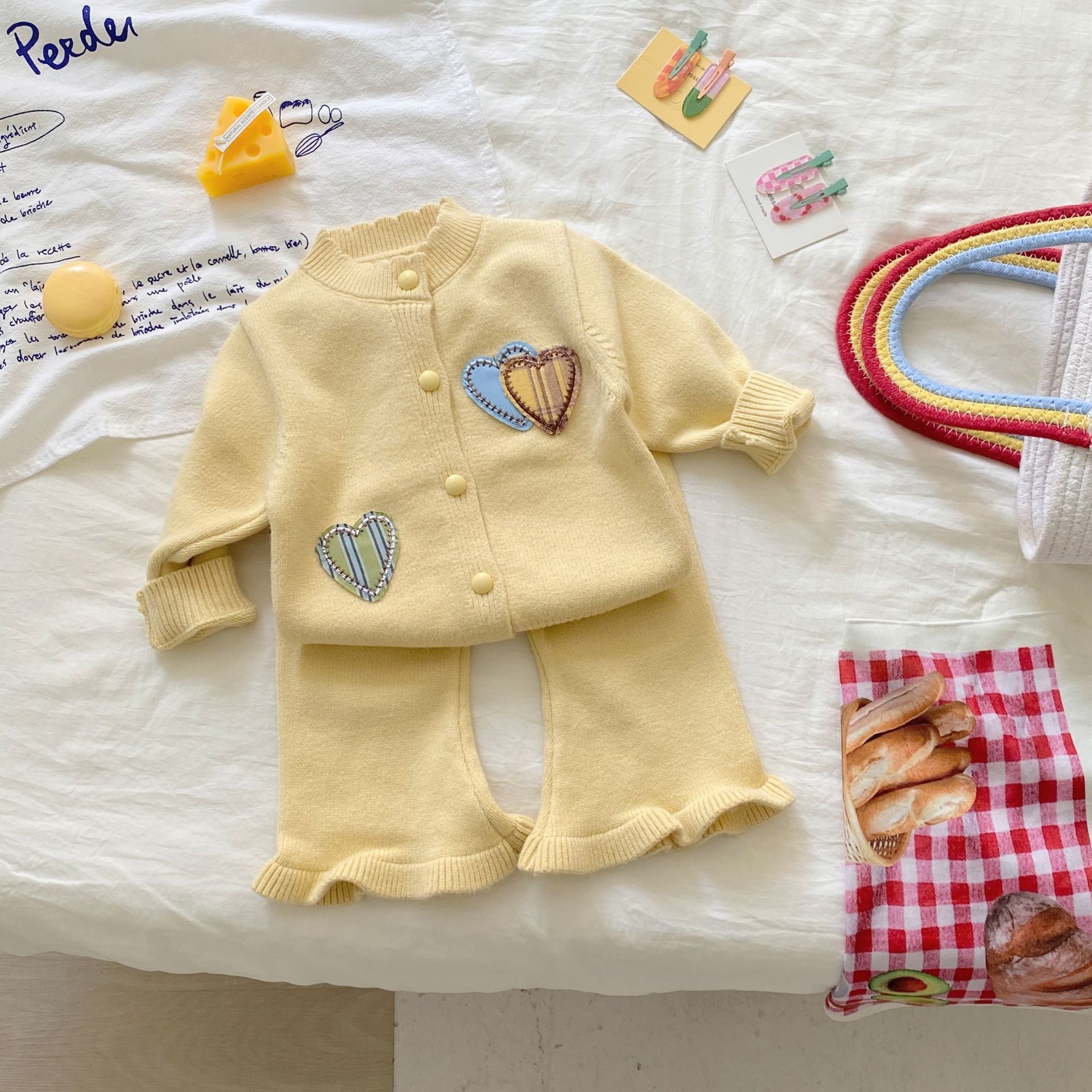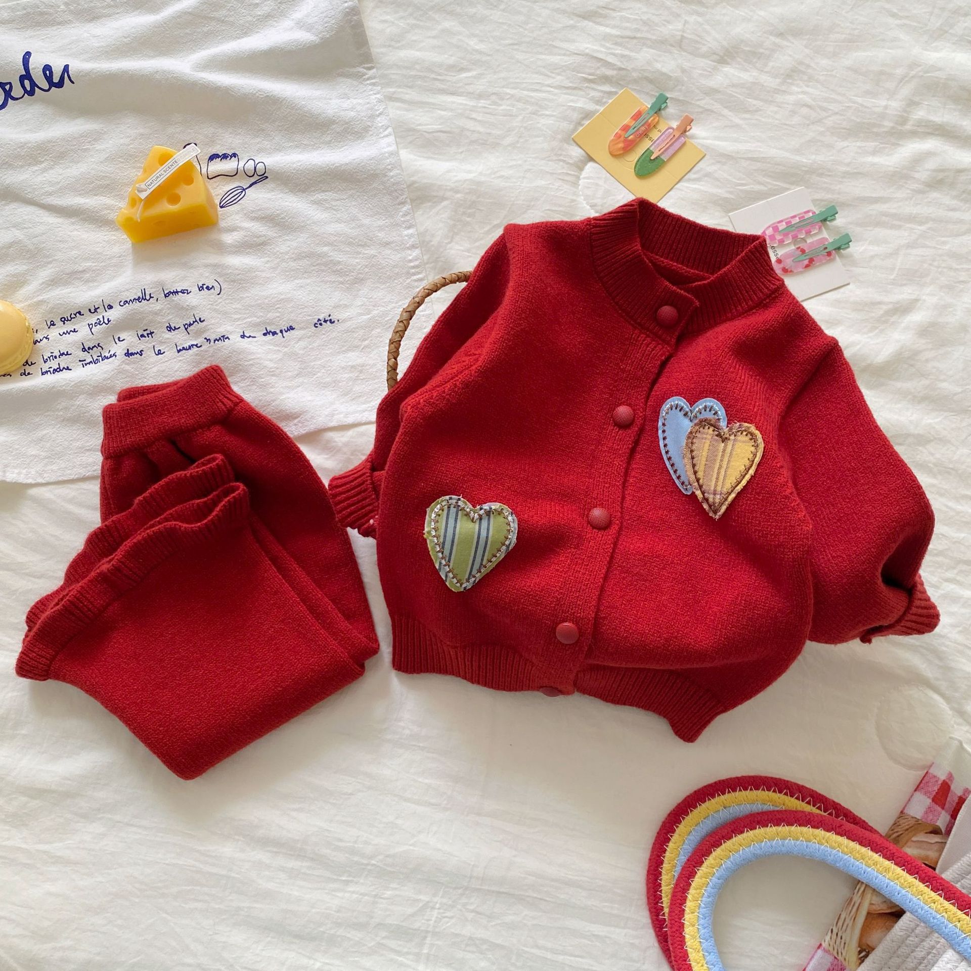 여자 정장 가을, 겨울 2025 새로운 스웨터 투피스 세트 아기 소녀 사랑 카디건 바지 니트 옷