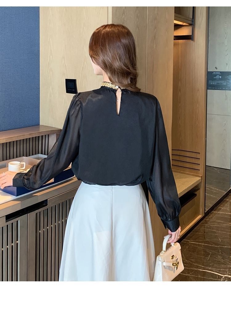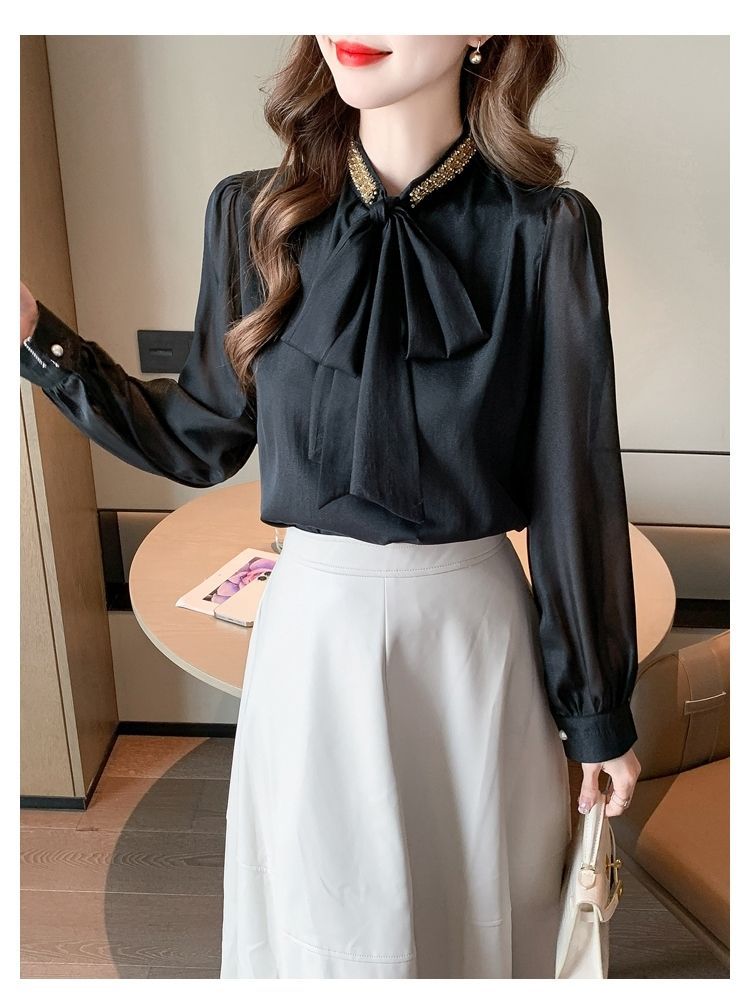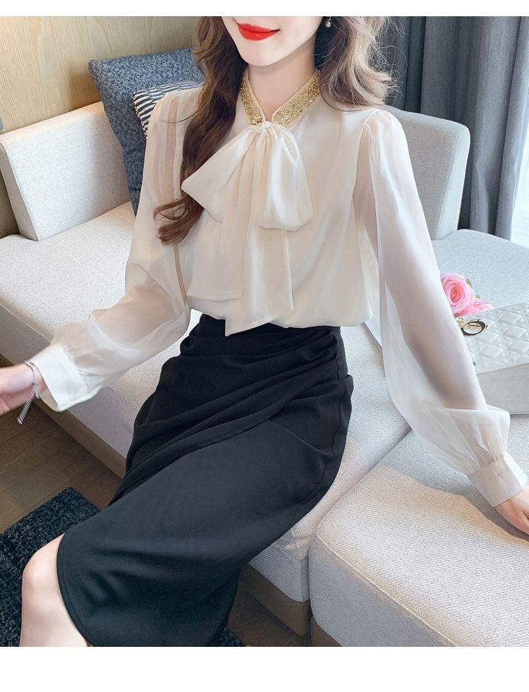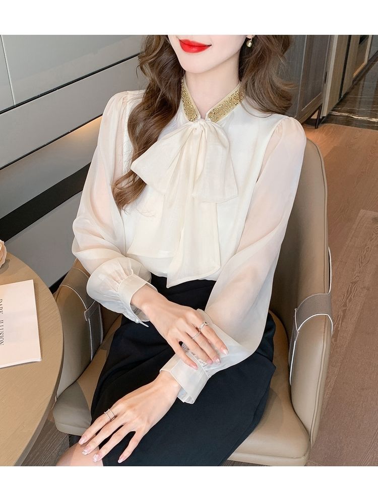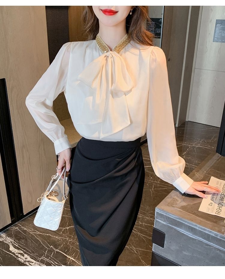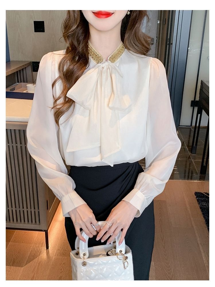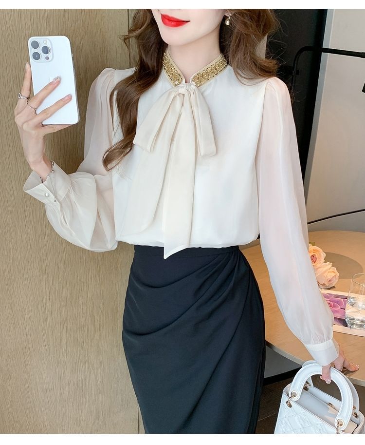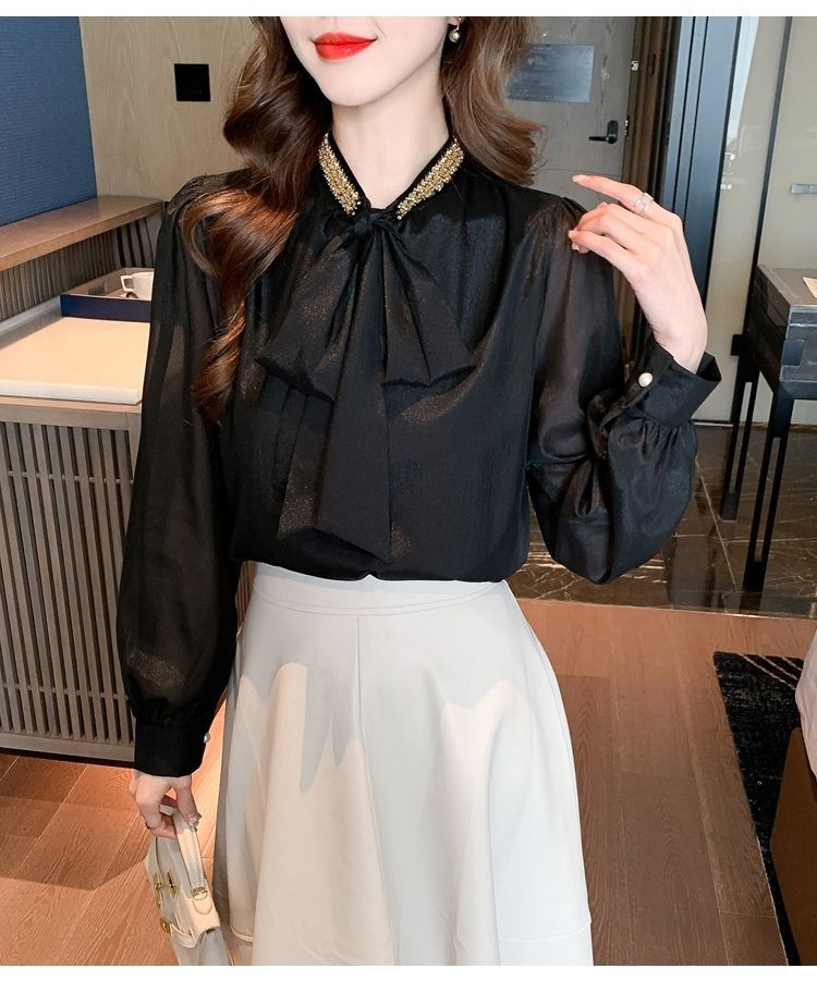 여성을위한 프랑스 고급 스팽글 보우 셔츠 2025 새로운 봄 독특하고 아름다운 셔츠 세련된 쉬폰 탑스토어 가기