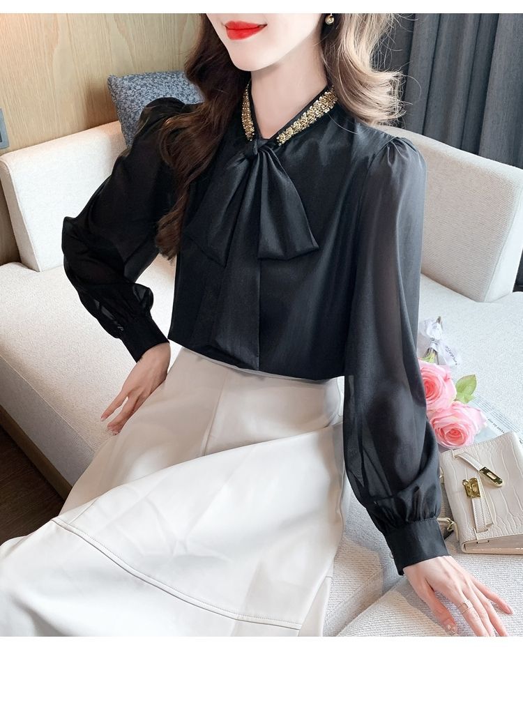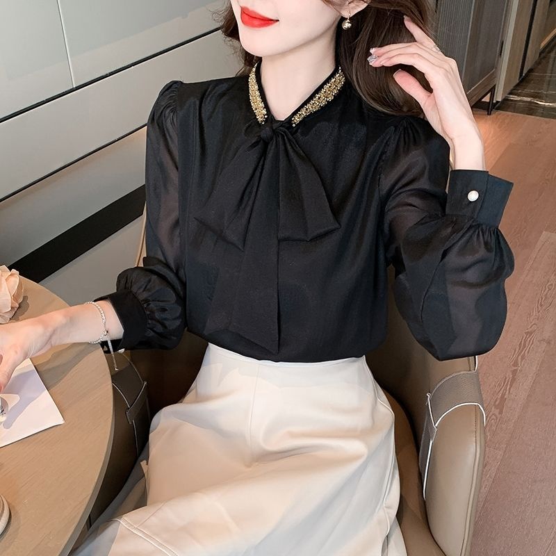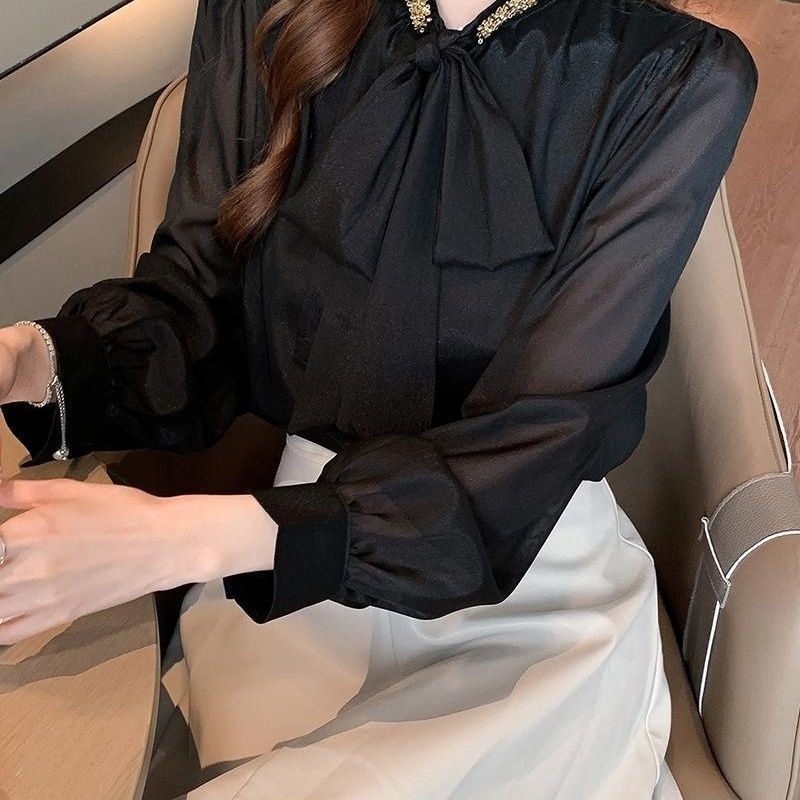 여성을위한 프랑스 고급 스팽글 보우 셔츠 2025 새로운 봄 독특하고 아름다운 셔츠 세련된 쉬폰 탑