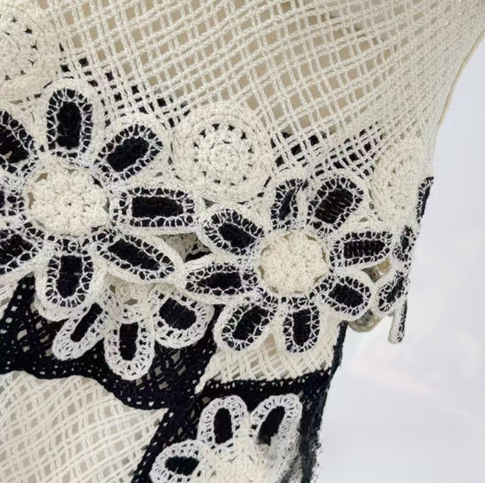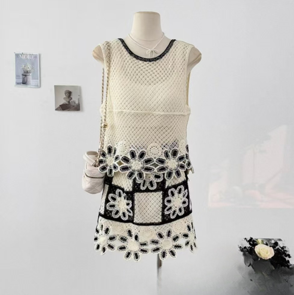 여성을위한 보헤미안 스타일 중공 크로 셰 뜨개질 라운드 넥 민소매 조끼 여름 하이 웨이스트 A 라인 니트 힙 스커트 슈트