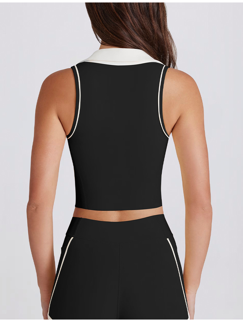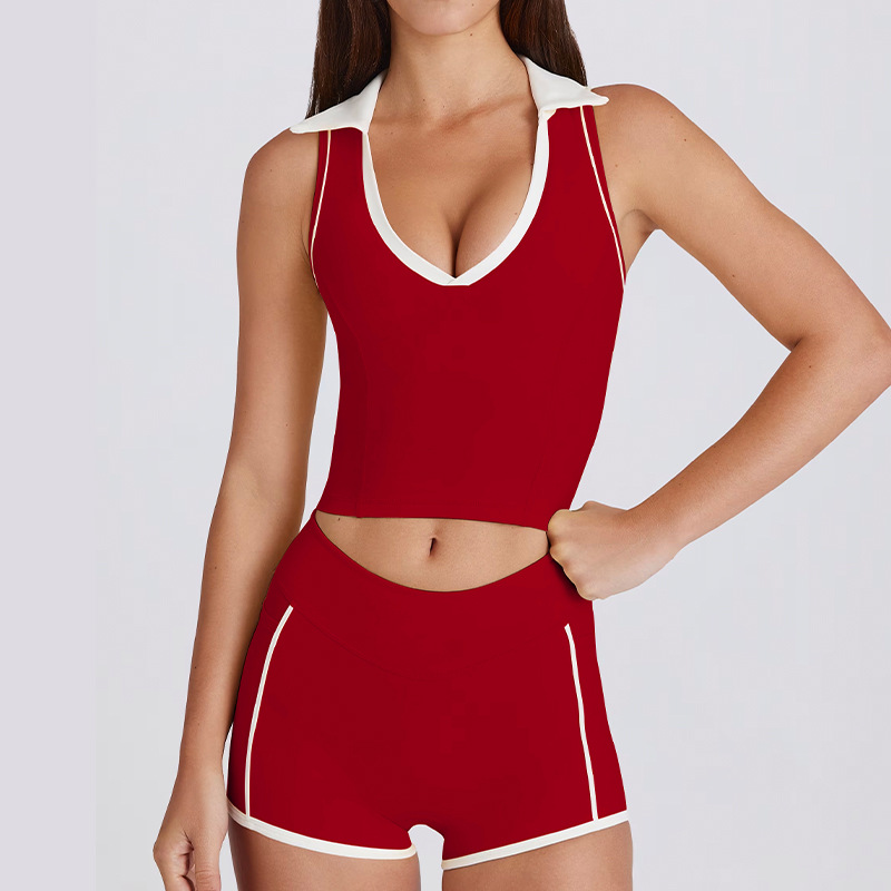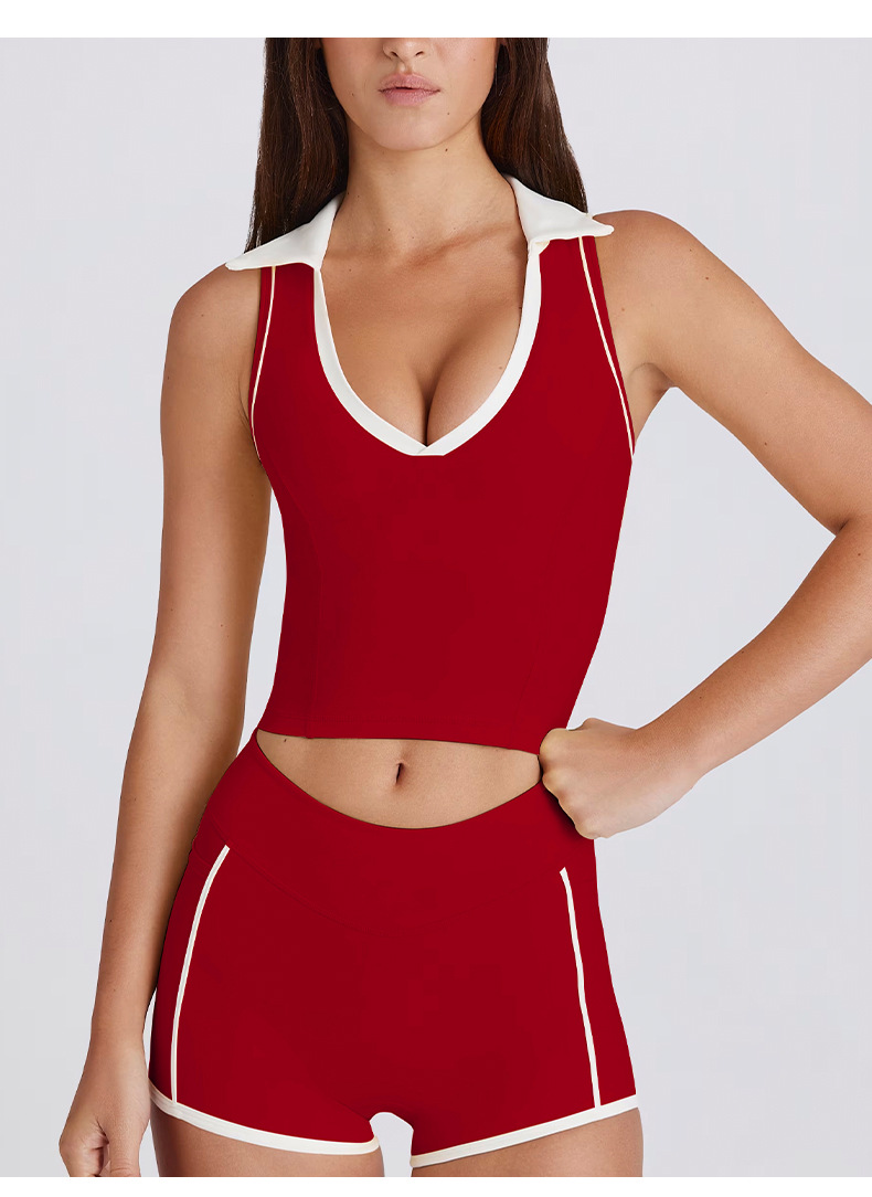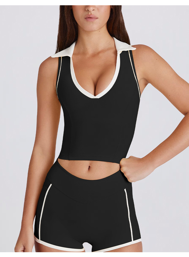 민소매 러닝 스포츠 필라테스 피트니스 브이넥 탑 조끼 가슴 패드가 있는 상의 배색 라펠 요가복 세트