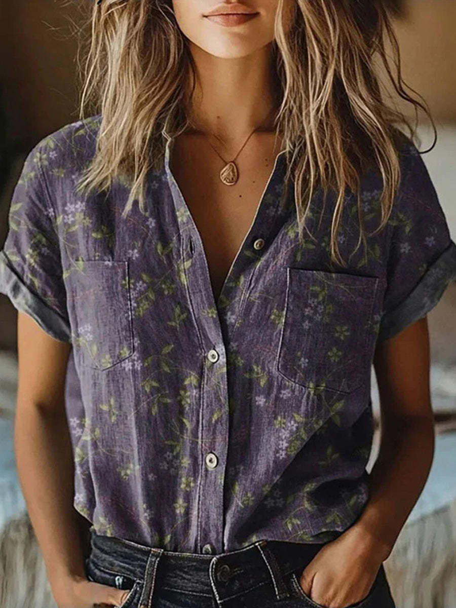 324238 유럽과 미국의 새로운 여성 의류 크로스보더 인기 마이크로 탄성 탑 식물 프린트 반팔 셔츠 v 넥 대형스토어 가기