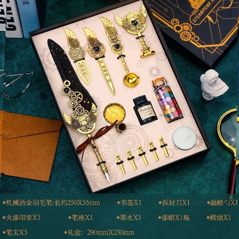 유럽 ​​복고풍 깃털 펜 세트 금색 기어 기계 날개 날개 만년필 선물스토어 가기