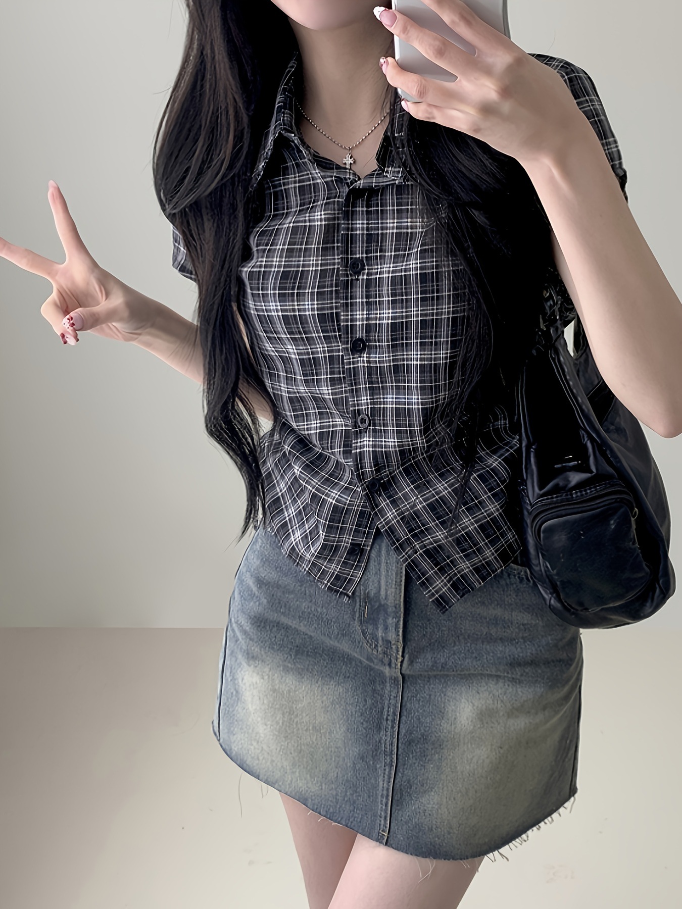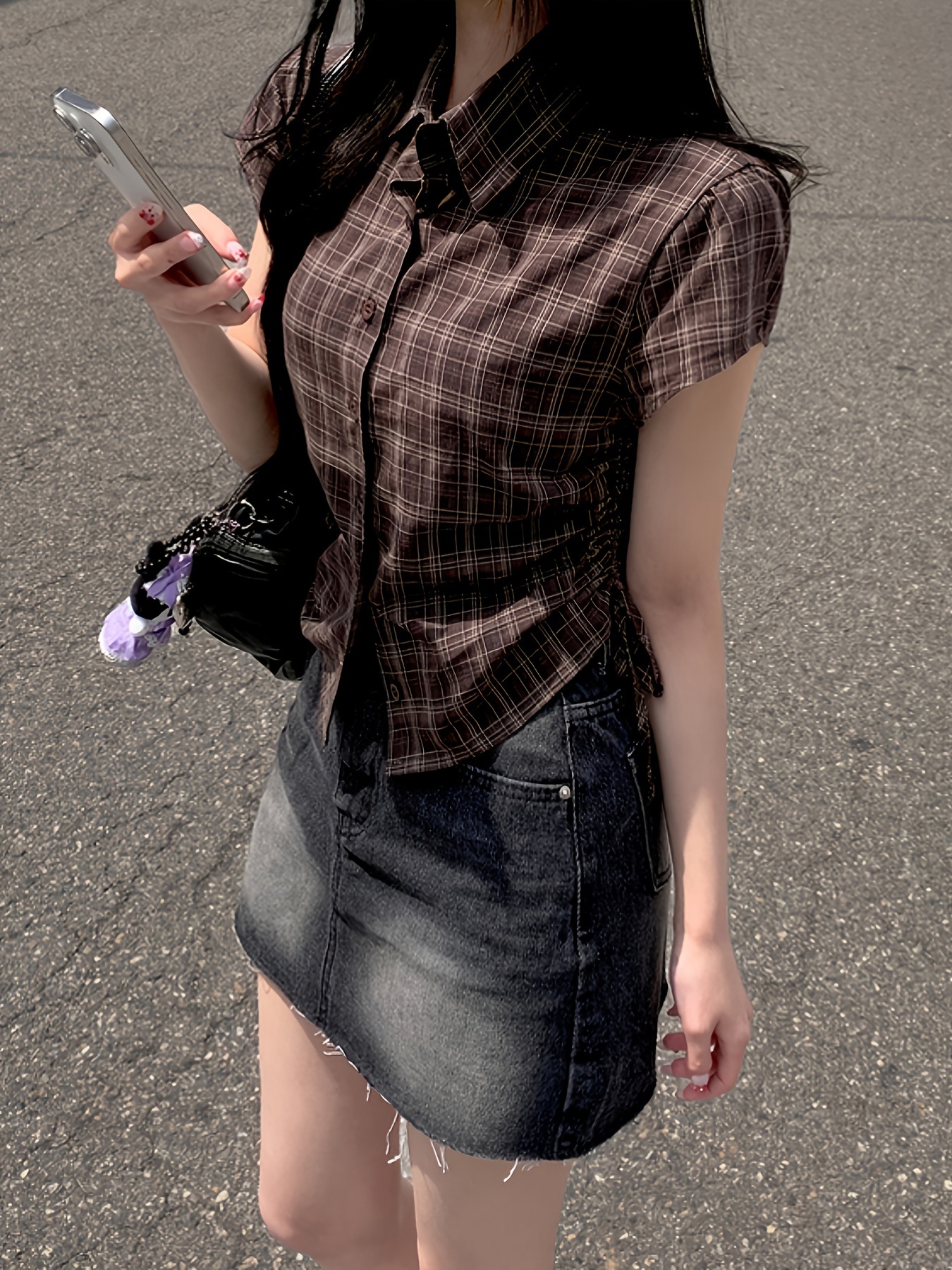 한국식 체크 무늬 반팔 싱글 브레스트 여성용 셔츠, 밑단 주름과 드로스트링 디자인, 여성용 다용도 연령 감소 탑 셔츠