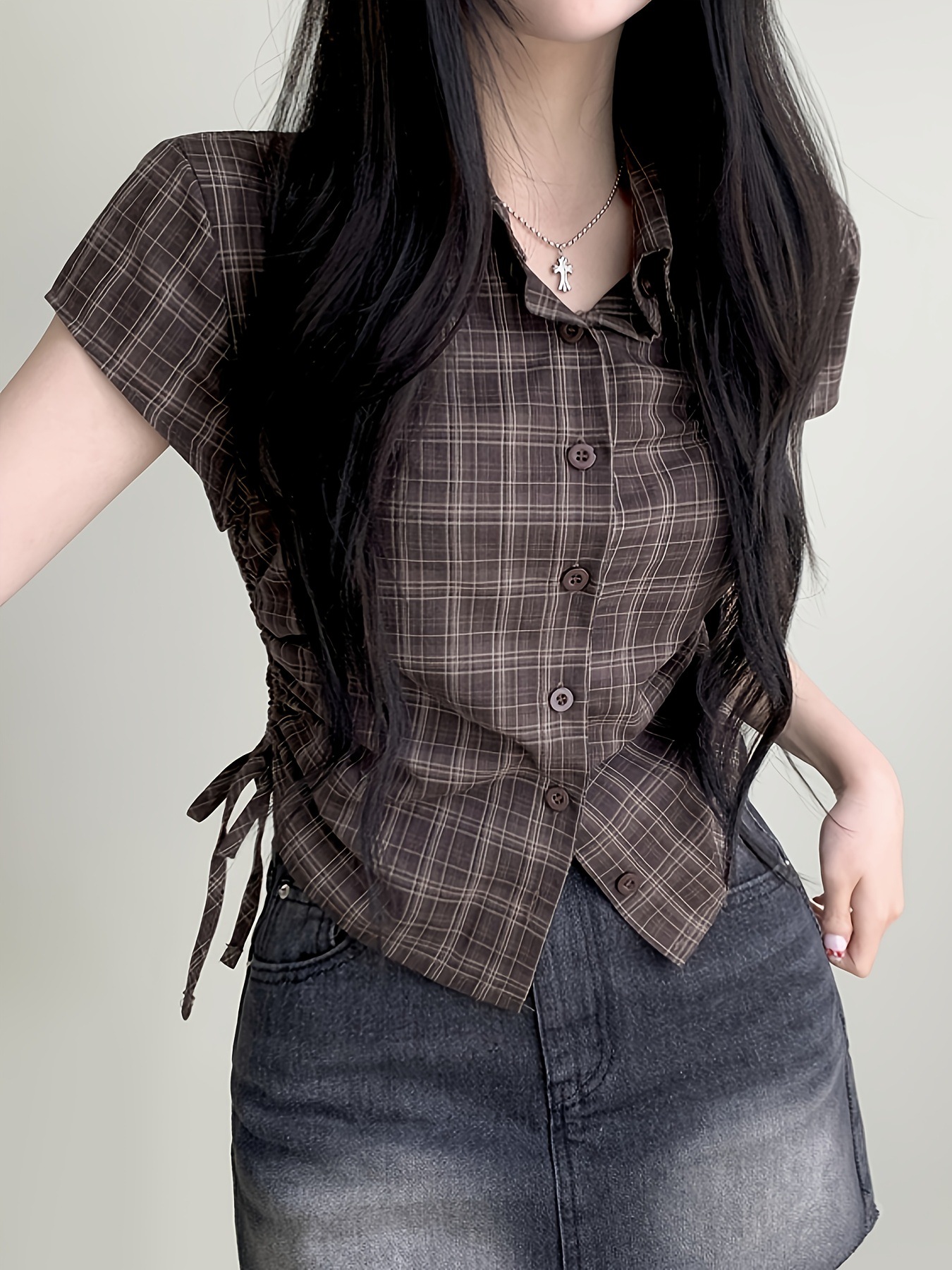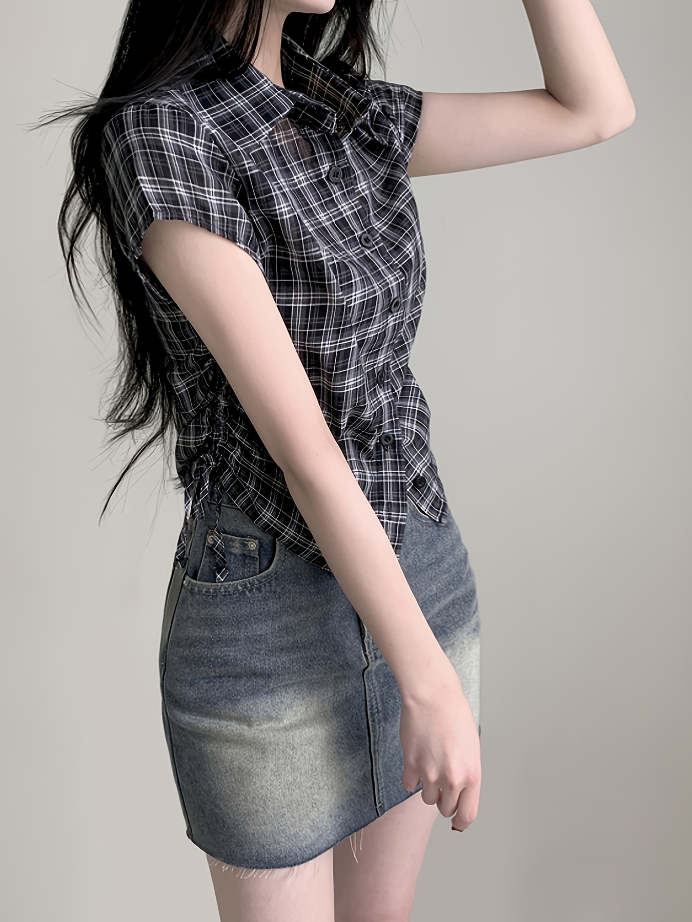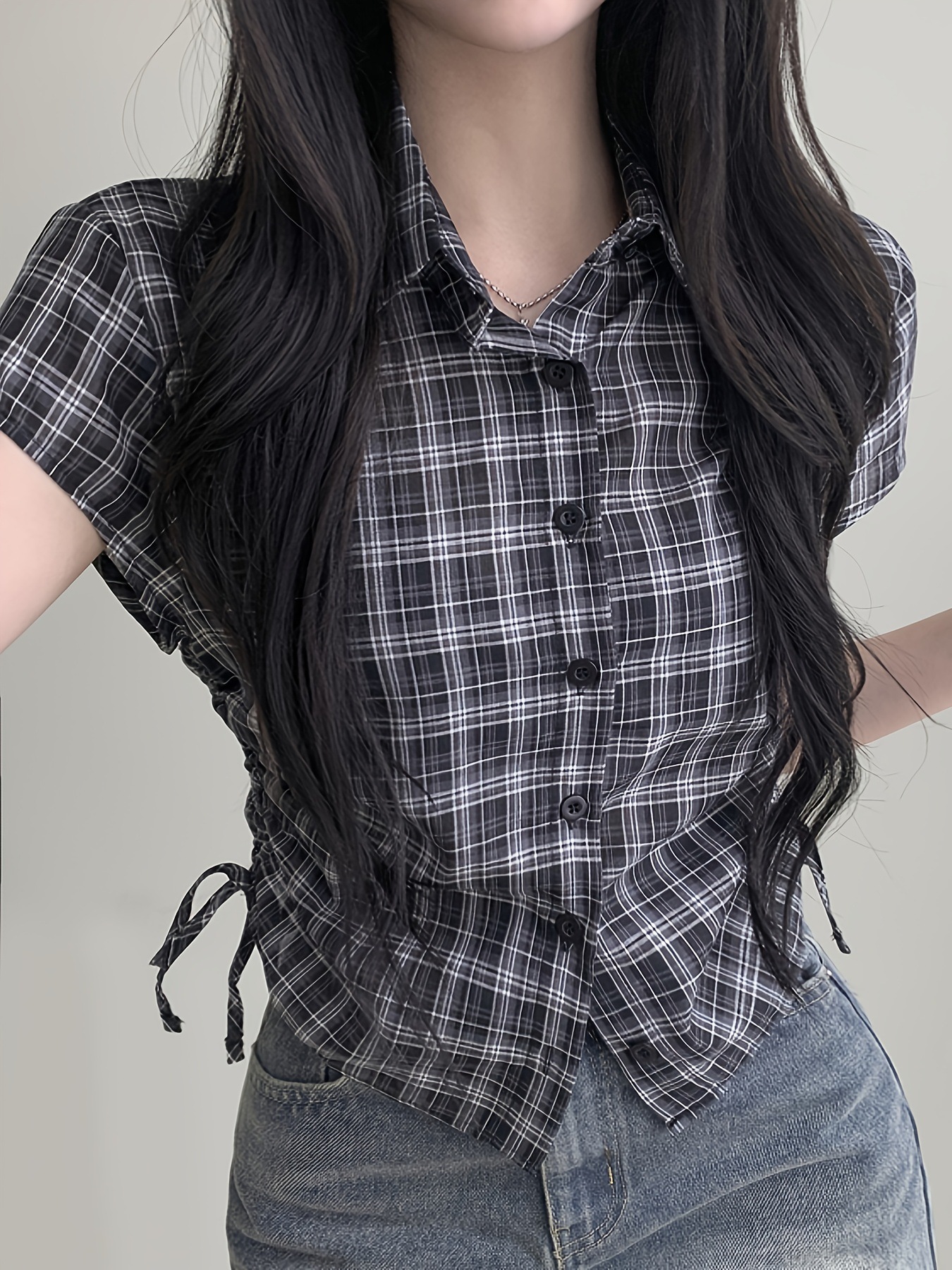 한국식 체크 무늬 반팔 싱글 브레스트 여성용 셔츠, 밑단 주름과 드로스트링 디자인, 여성용 다용도 연령 감소 탑 셔츠스토어 가기