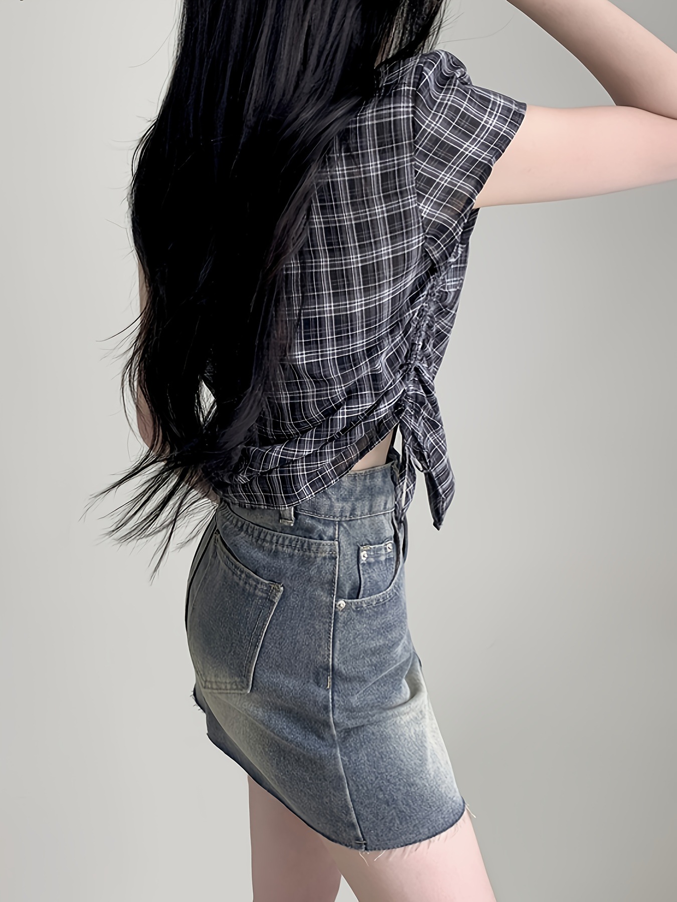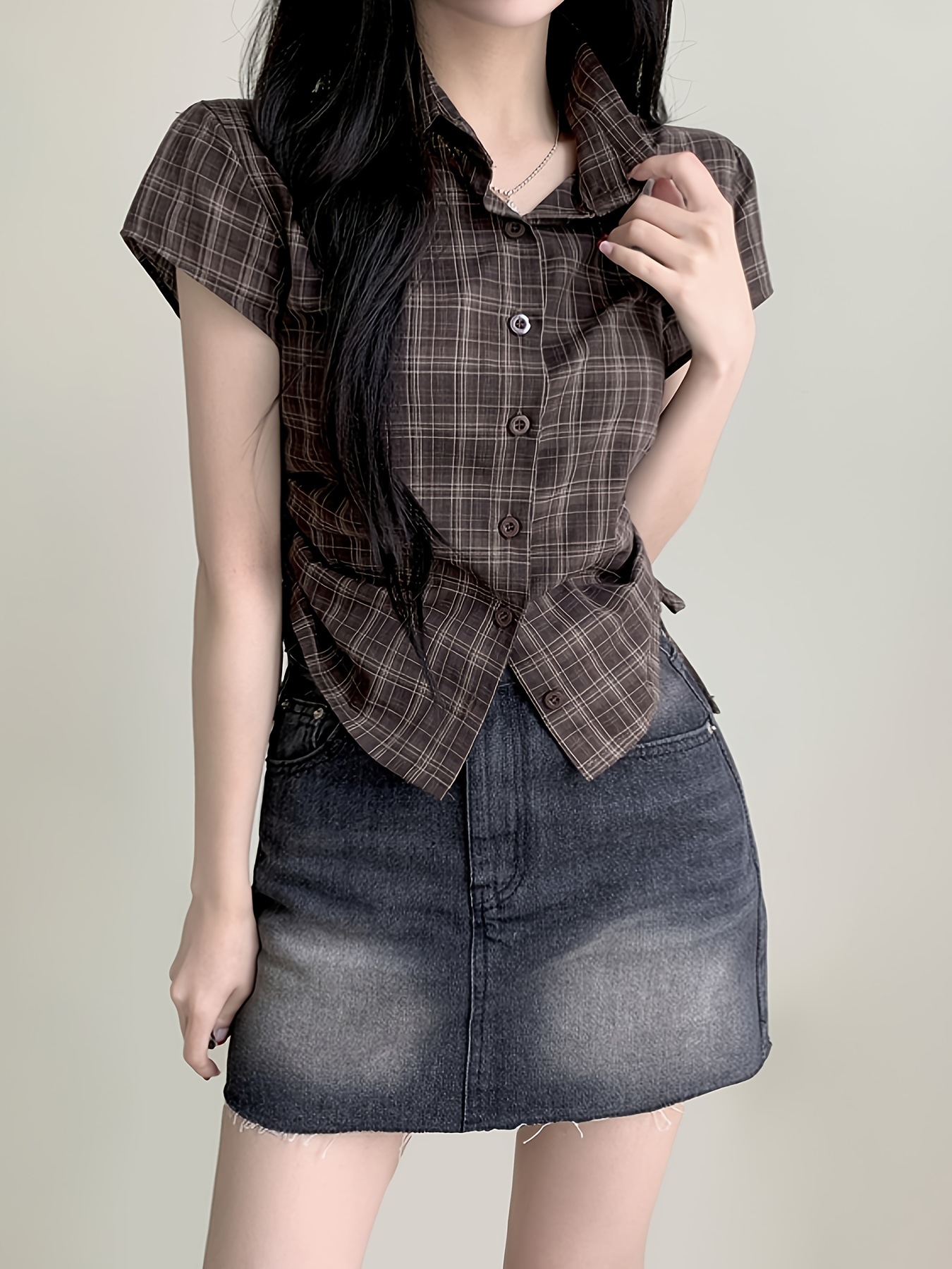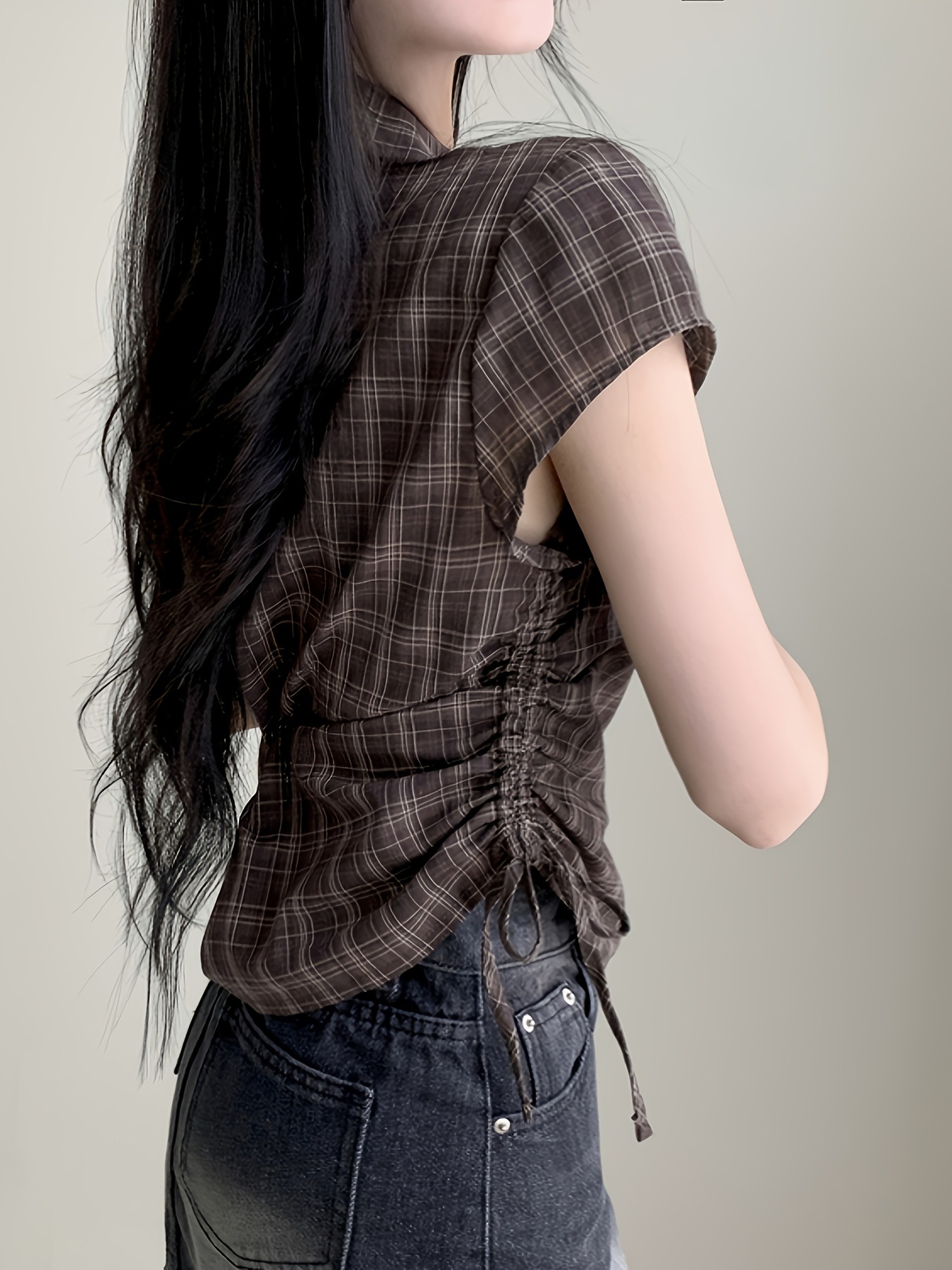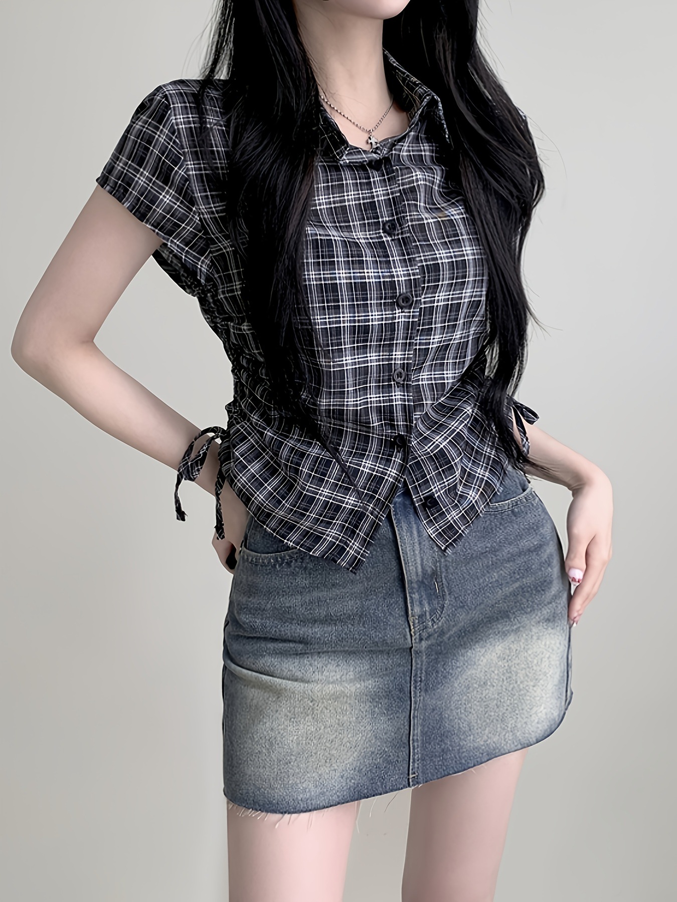한국식 체크 무늬 반팔 싱글 브레스트 여성용 셔츠, 밑단 주름과 드로스트링 디자인, 여성용 다용도 연령 감소 탑 셔츠스토어 가기