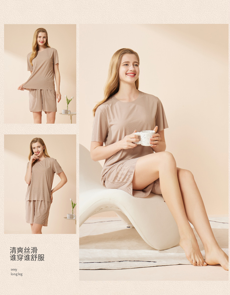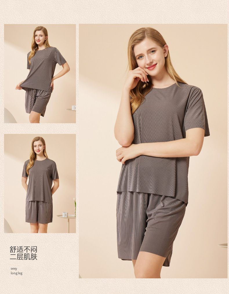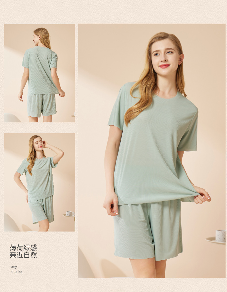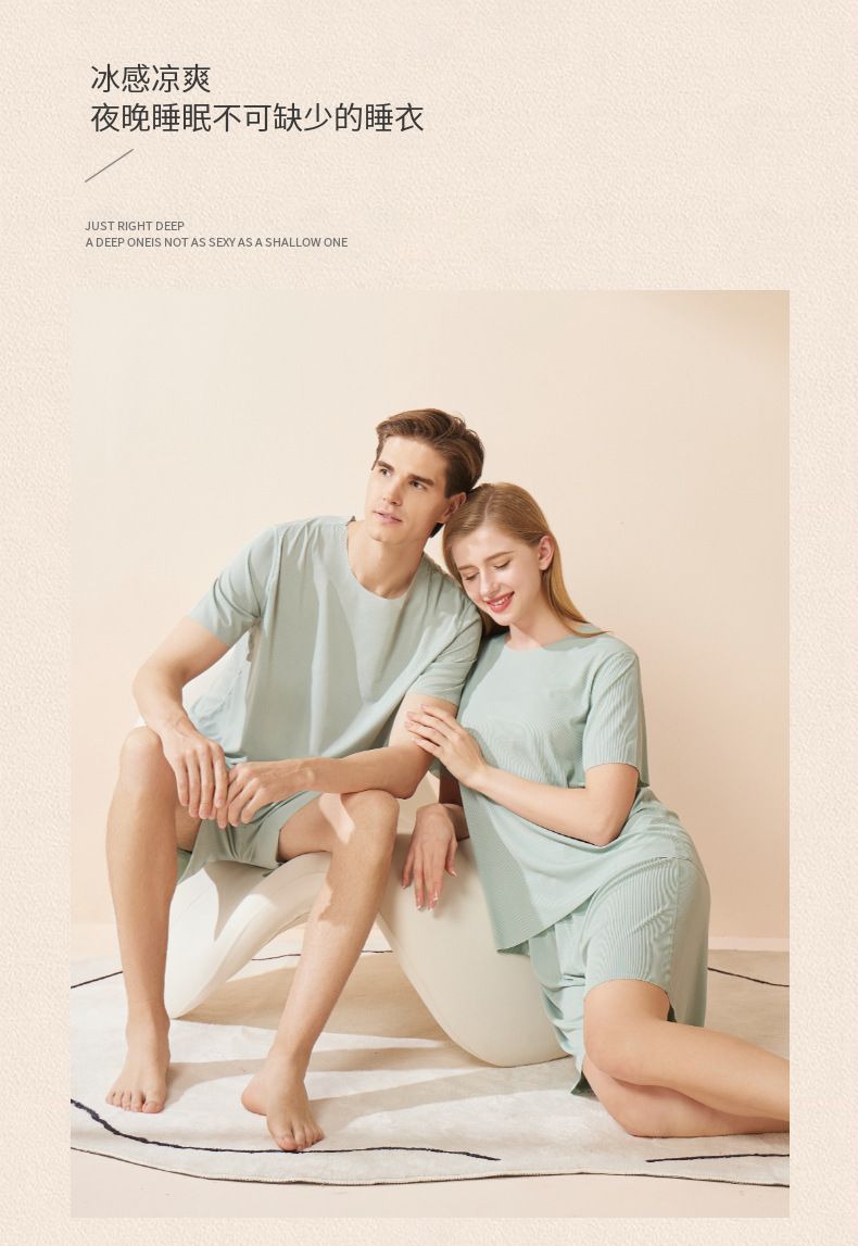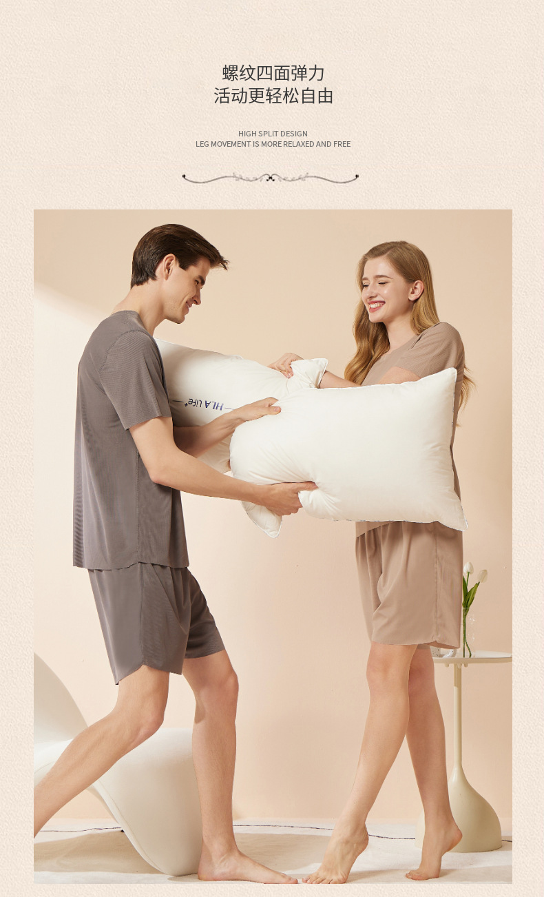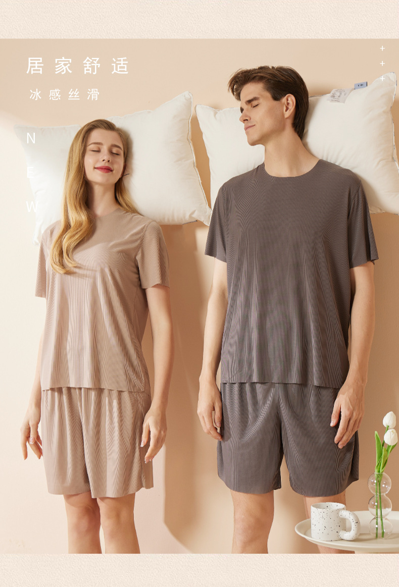 여름 남성과 여성의 아이스 실크 홈웨어 라운드 넥 커플 심리스 반팔 반바지 세트는 파자마와 파자마 바지와 함께 착용할 수 있습니다.스토어 가기