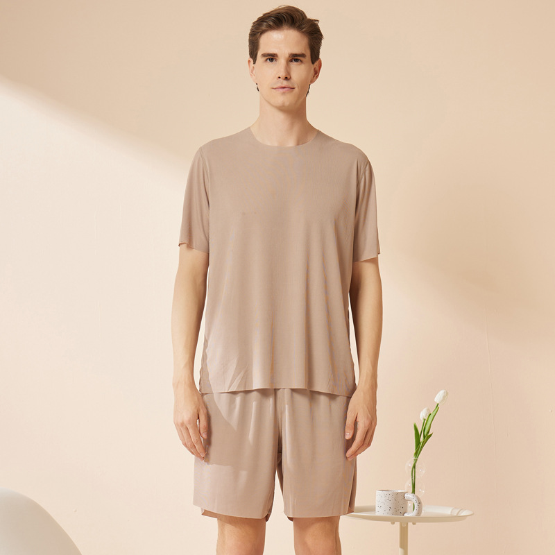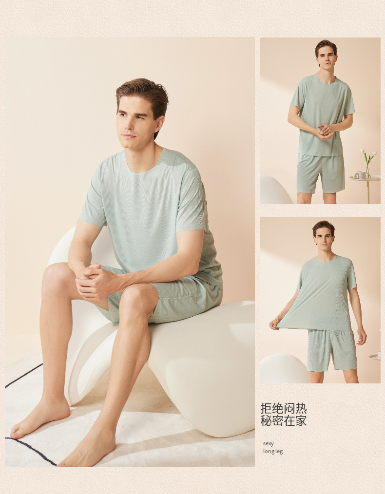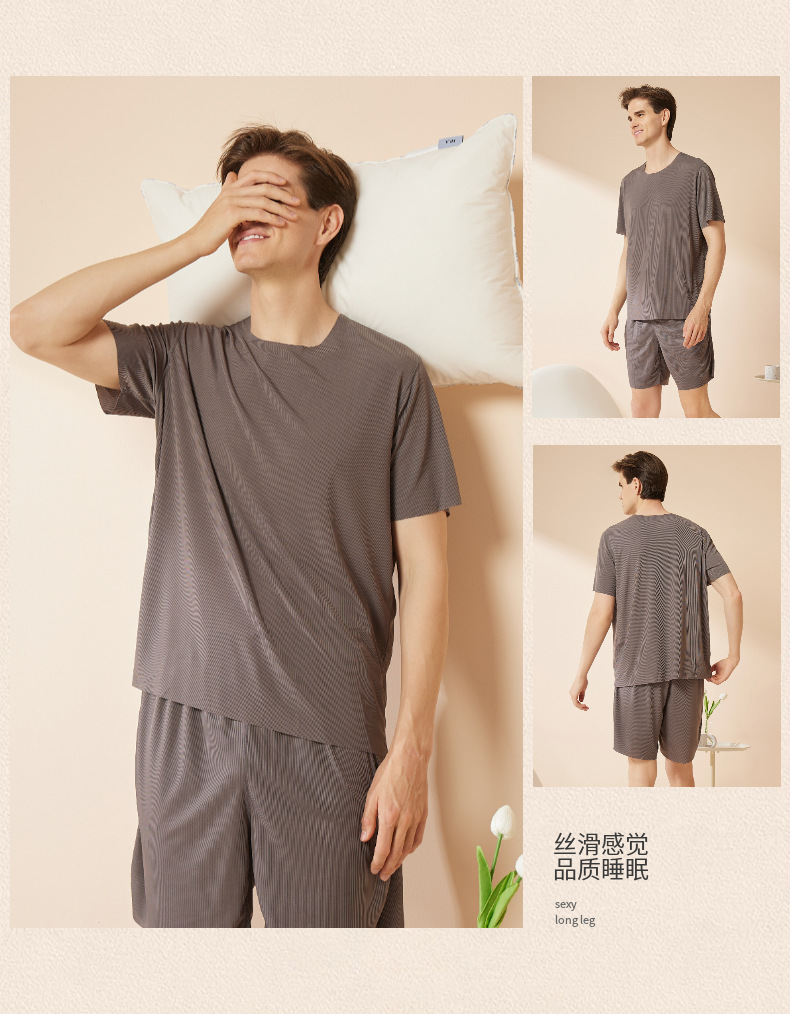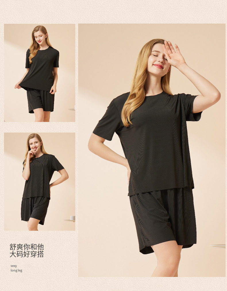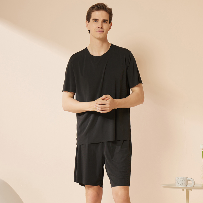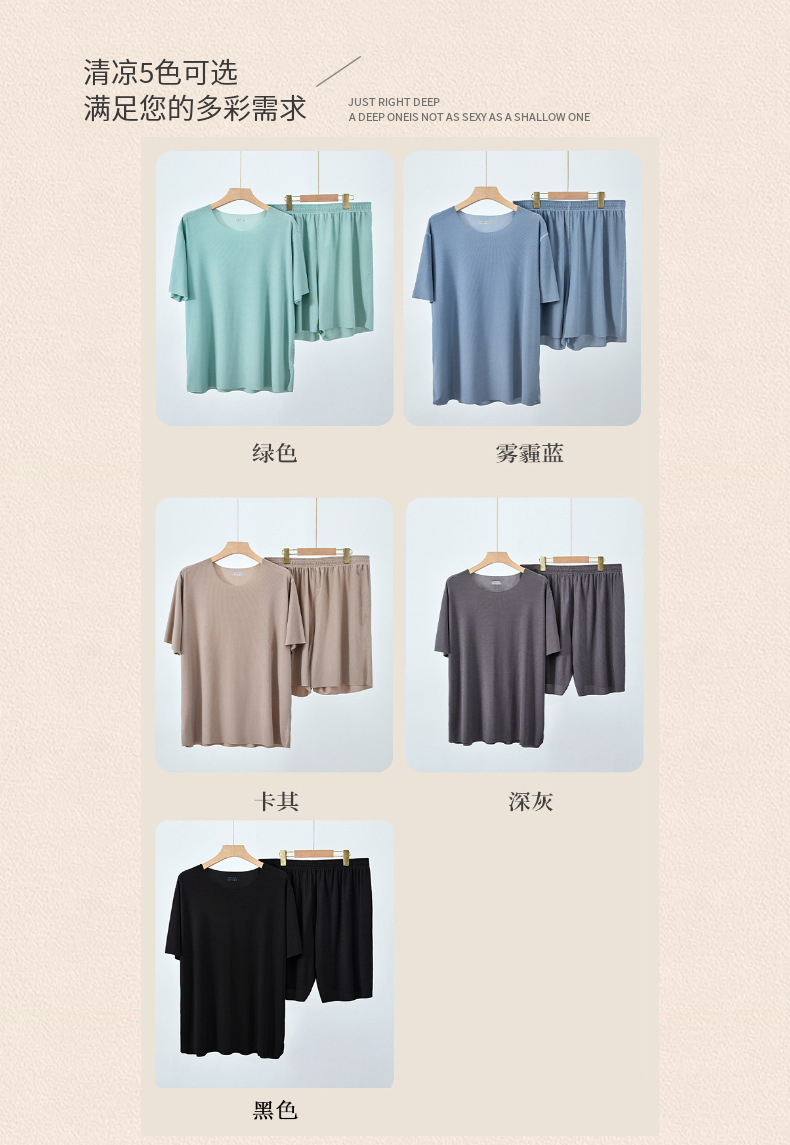 여름 남성과 여성의 아이스 실크 홈웨어 라운드 넥 커플 심리스 반팔 반바지 세트는 파자마와 파자마 바지와 함께 착용할 수 있습니다.스토어 가기