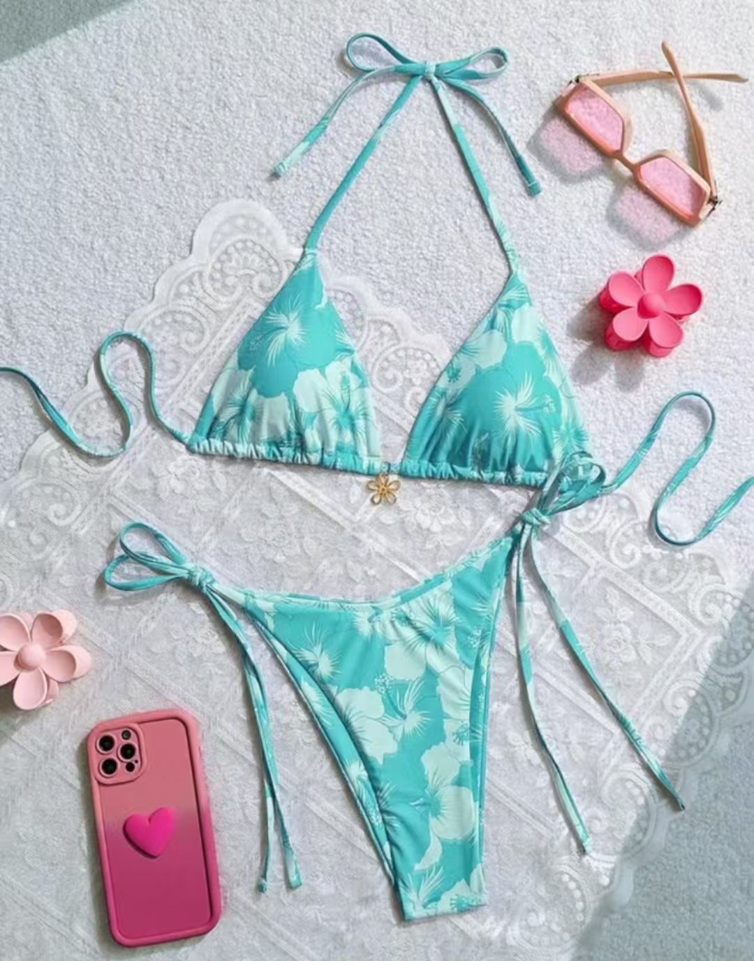 2025 유럽과 미국의 국경 간 새로운 레이스 업 프린트 수영복 비키니 여성용 고급 스플릿 투피스 수영복 세트